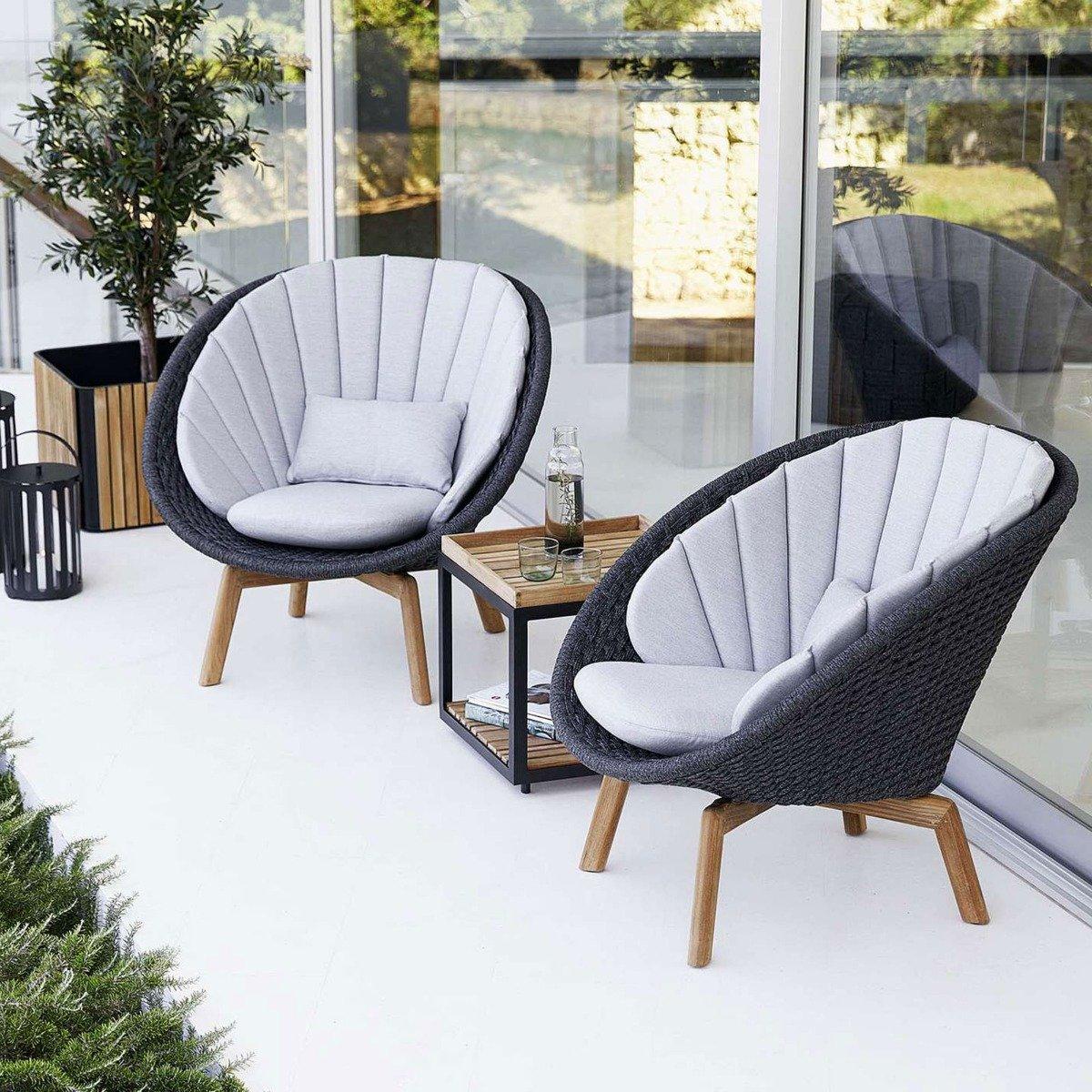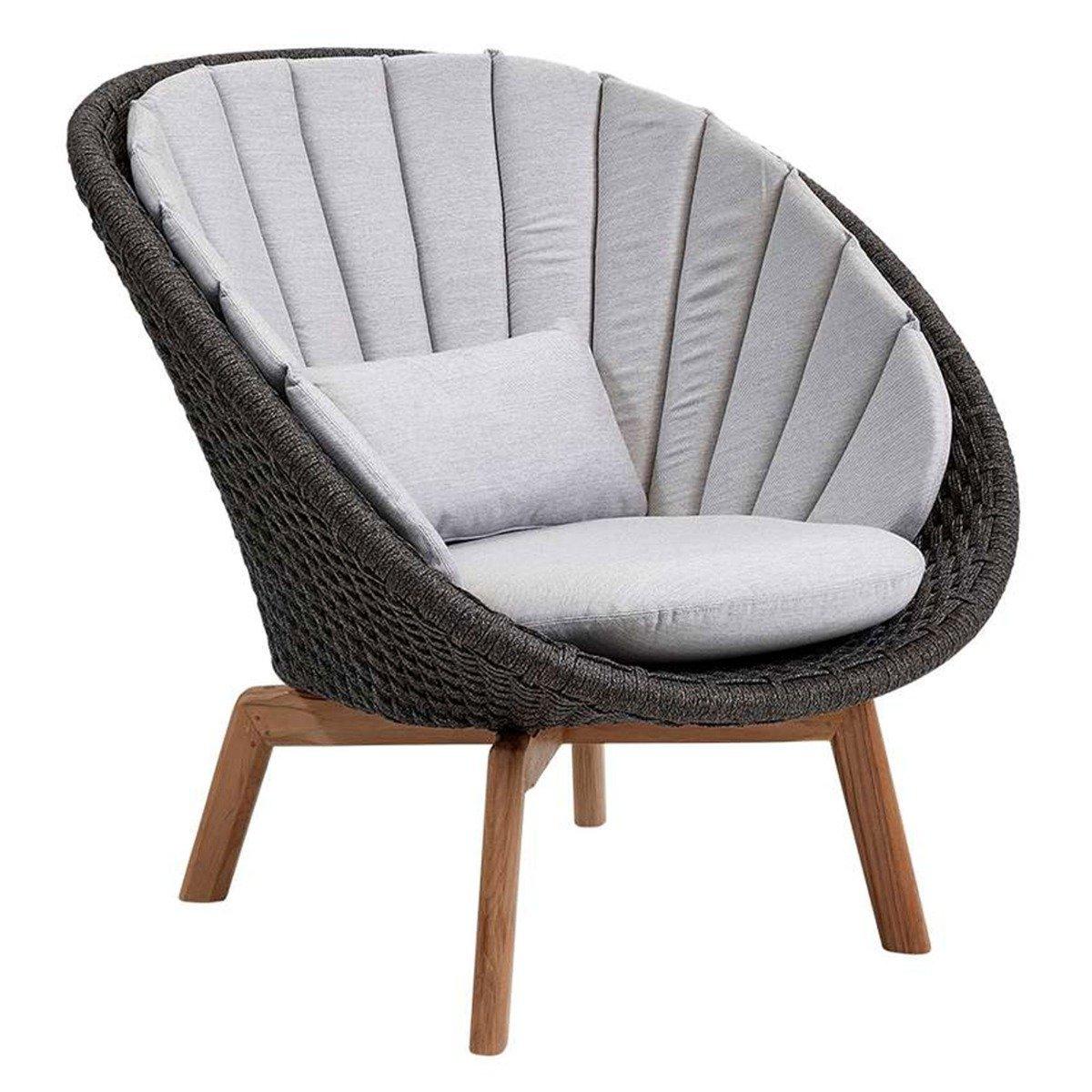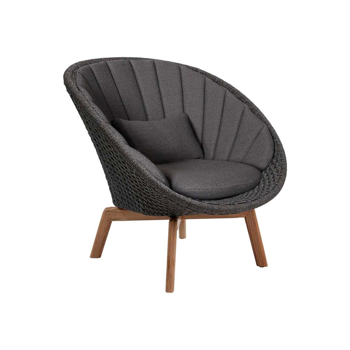 The Cane-line Peacock Dark Grey Lounge Chair with Cushion Set is a uniquely beautiful piece that will transform your modern outdoor setting into a place youll never want to leave. The stylish and clever design crafted from Cane-line Soft Rope is extremely high in comfort and can be used in any climate, being both temperature and UV-resistant. The teak legs add a warm, inviting glow and its complete with a stunning cushion set, available in different colors and fabrics.  Explore the choice of configurations and find what suits your garden area best.