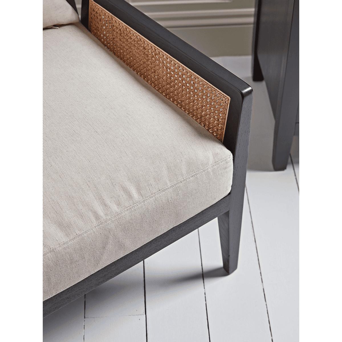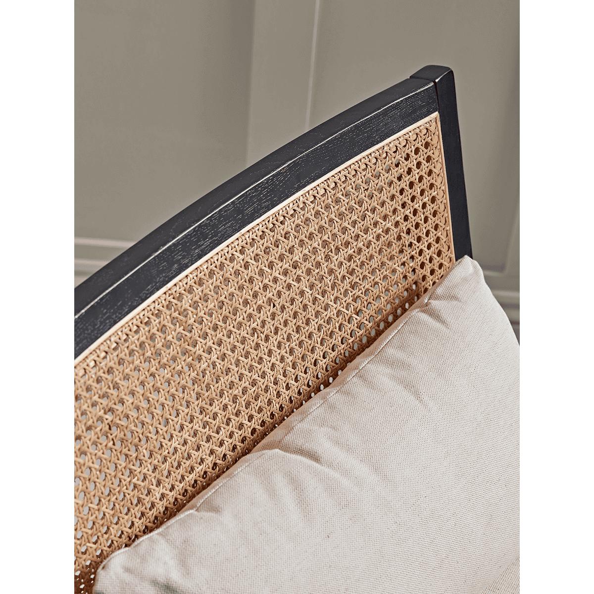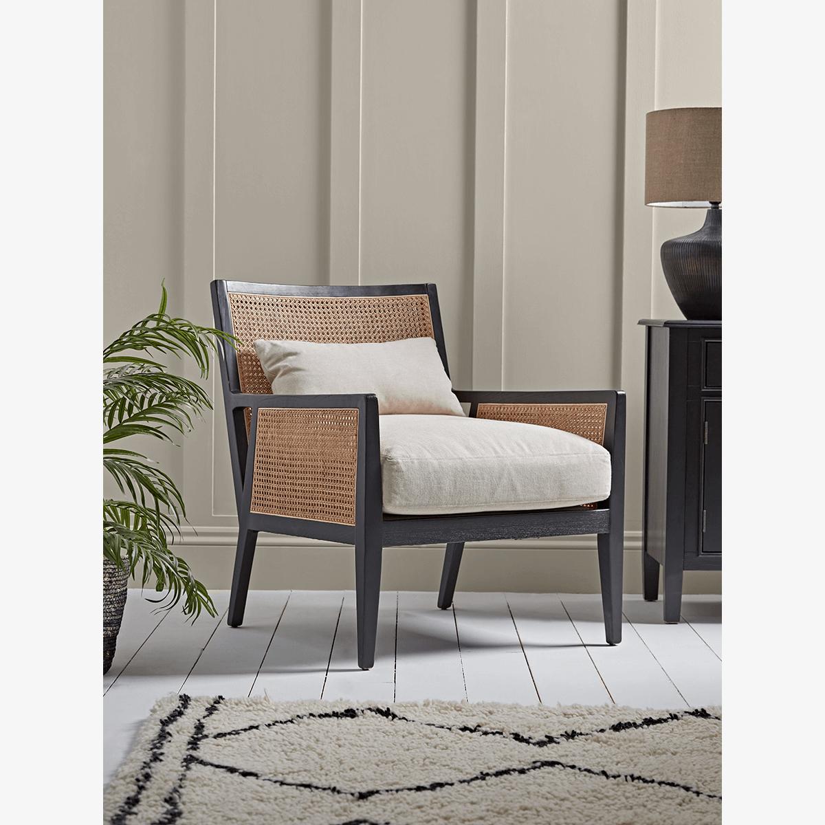 In a contrast of black ash against cool blonde natural rattan, our Cane Webbing Armchair is set to become an instant classic. The strong angular lines are offset by a plump seat and bolster cushion which soften the look and provide luxurious comfort in a style that encapsulates the New Neutral Noir trend. Position alongside a statement floor lamp to create a welcoming reading nook.