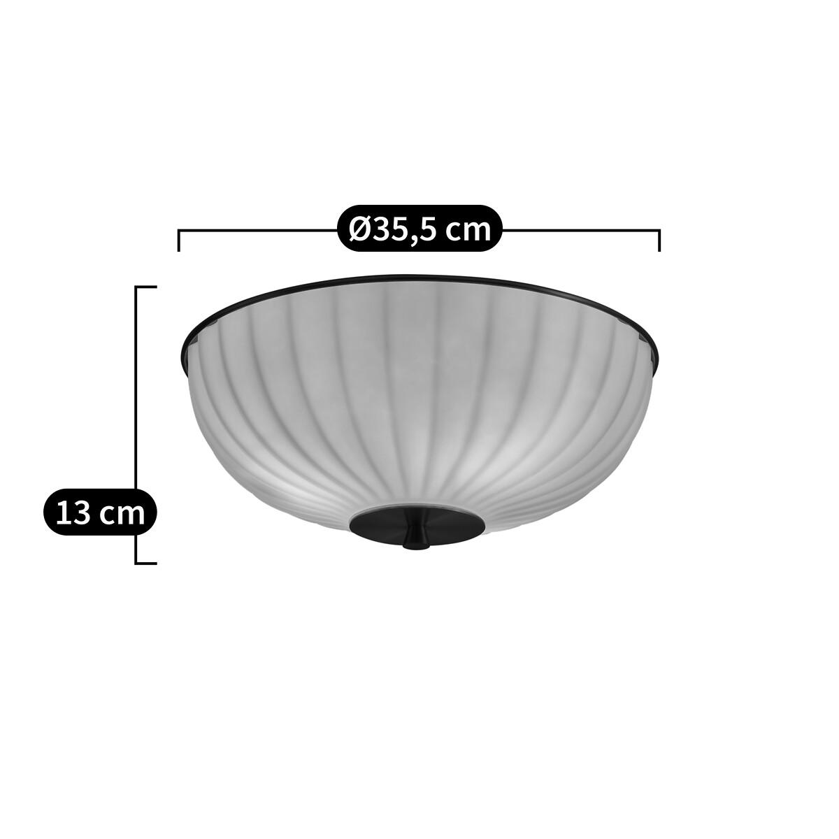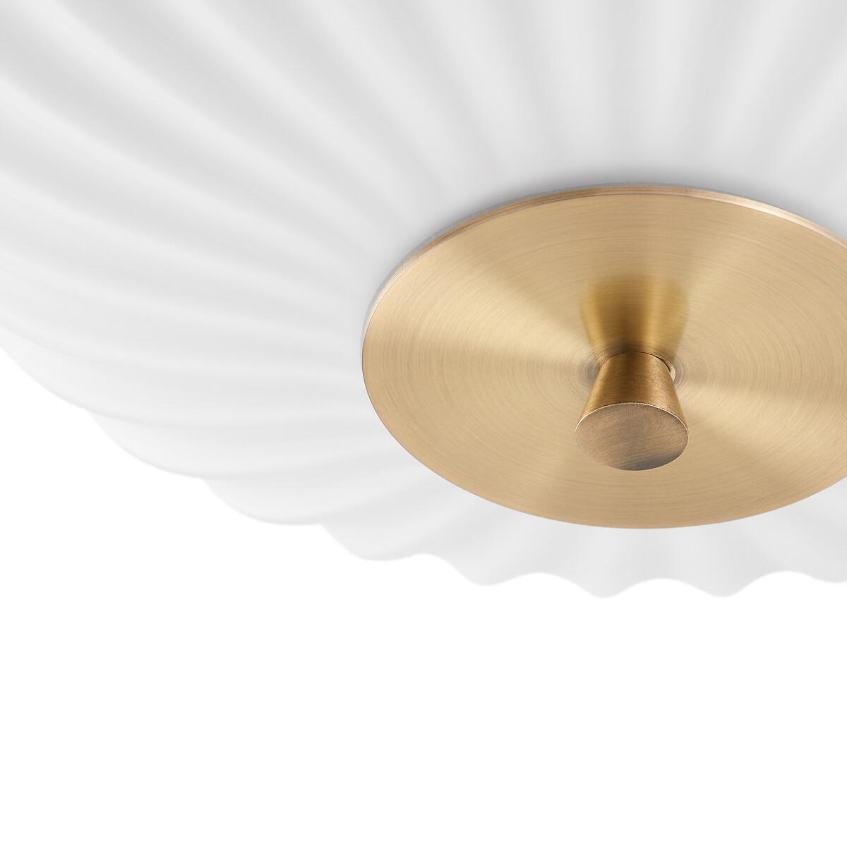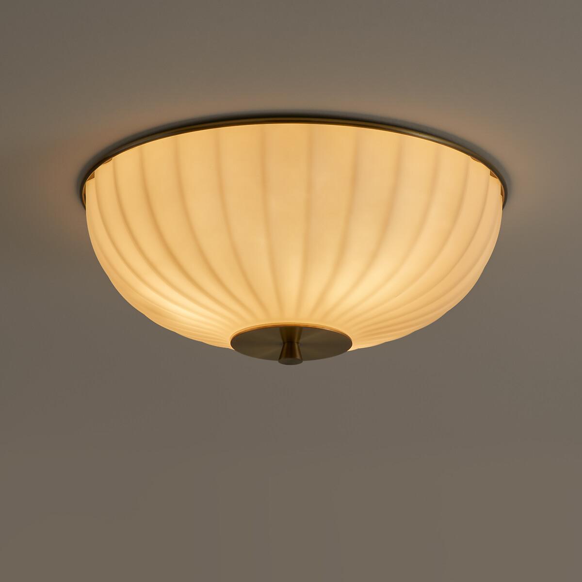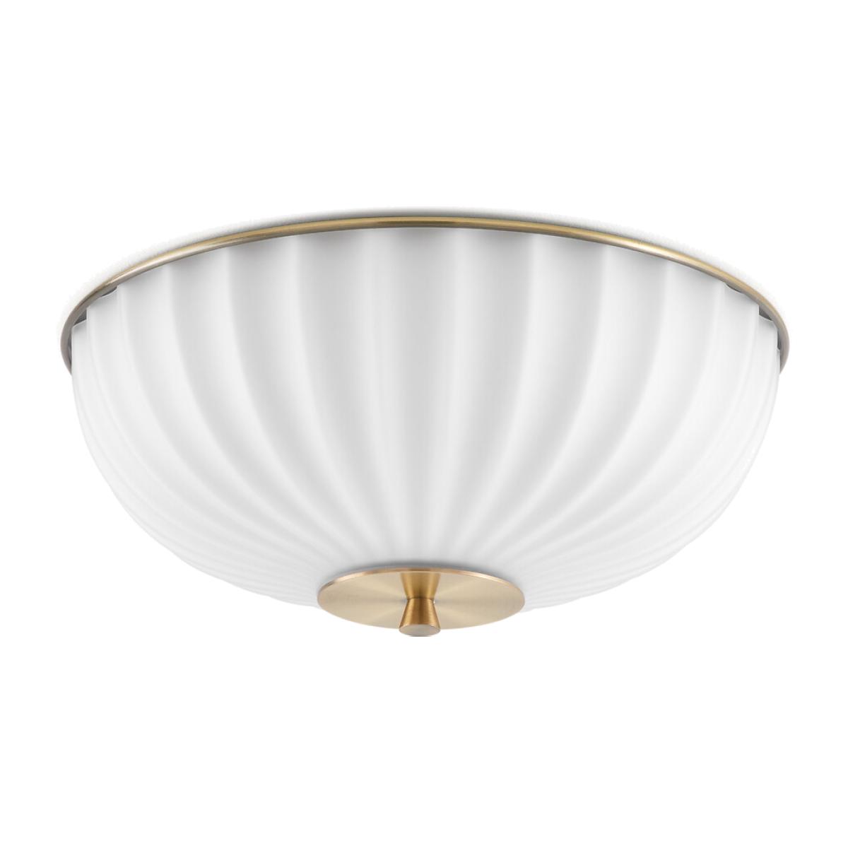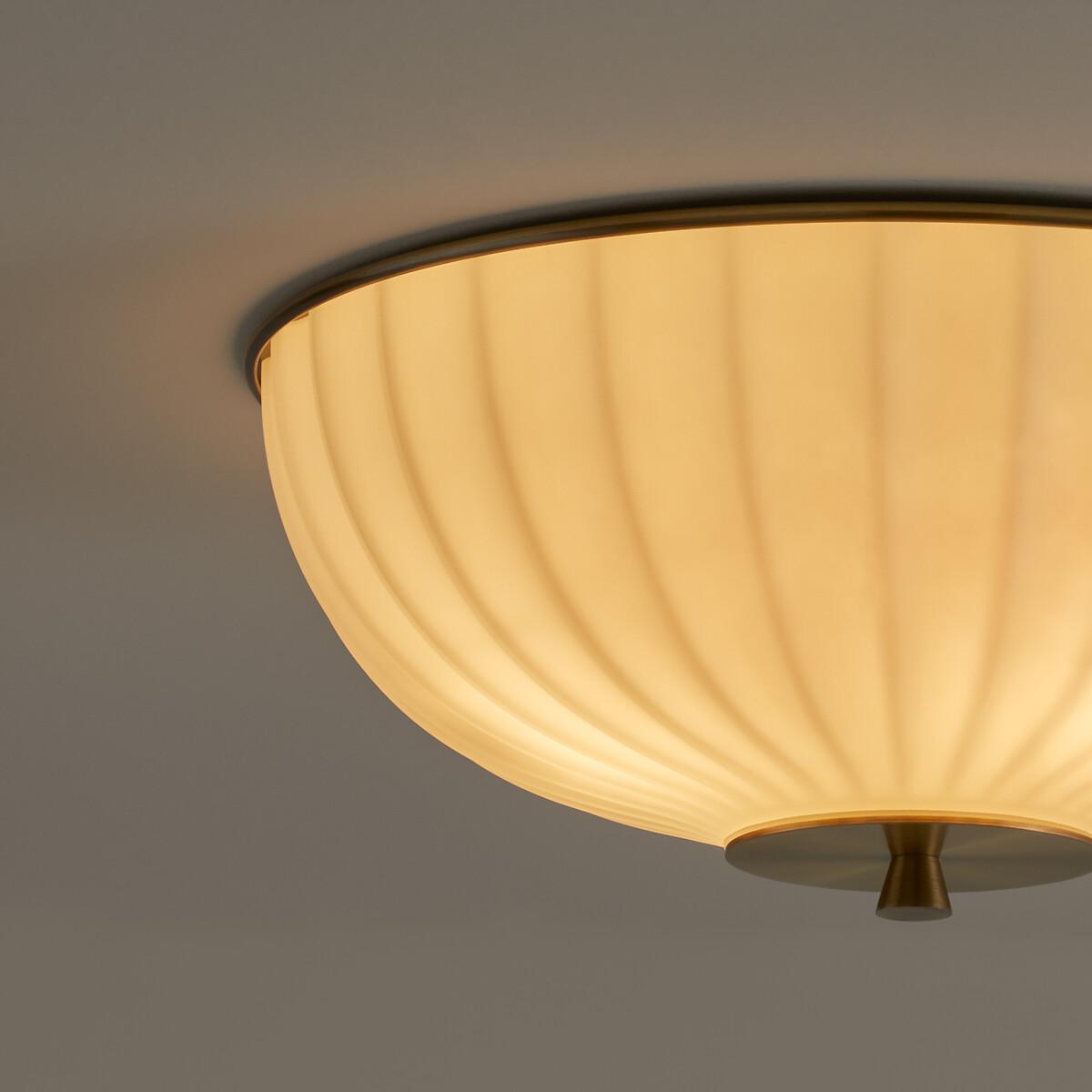 The smooth texture of the matte opaline glass with its softened grooves diffuses a soft and subdued light and provides a warm and soothing atmosphere.. The dimensions of this ceiling light are perfectly designed to adapt to standard ceiling heights. Product Details • White frosted glass shade, matte finish • Steel plates, aged brass finish • 2x G9 sockets for 3W bulbs (not included). • Compatible with bulbs of energy classes A to E. • We advise you to choose a round bulb with a diameter of 10cm and white for a soft and warm lighting. Dimensions Globe • Height: 13cm • Diameter : 35.5cmDelivery:. Sold pre-assembled. Available for home delivery. Dimensions and weight of parcel • 1 parcel • 44 x 23 x 44cm, 4kg