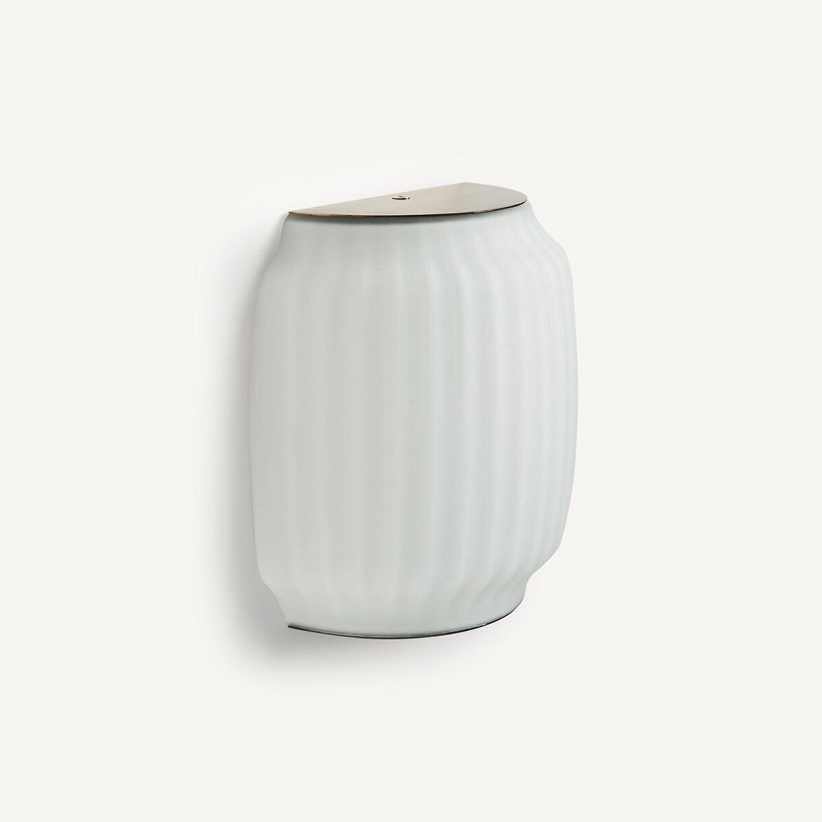 The precious texture of matt opaline glass with softened grooves diffuses a soft and subdued light and provides a warm and soothing atmosphere. Product Details • White frosted glass shade, matte finish • Steel plates, aged brass finish • 2 x G9 sockets (bulbs not included)Dimensions • L20 x H20.4 x D7.5cm