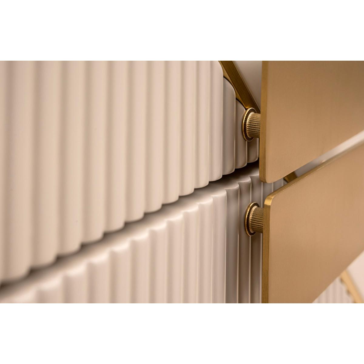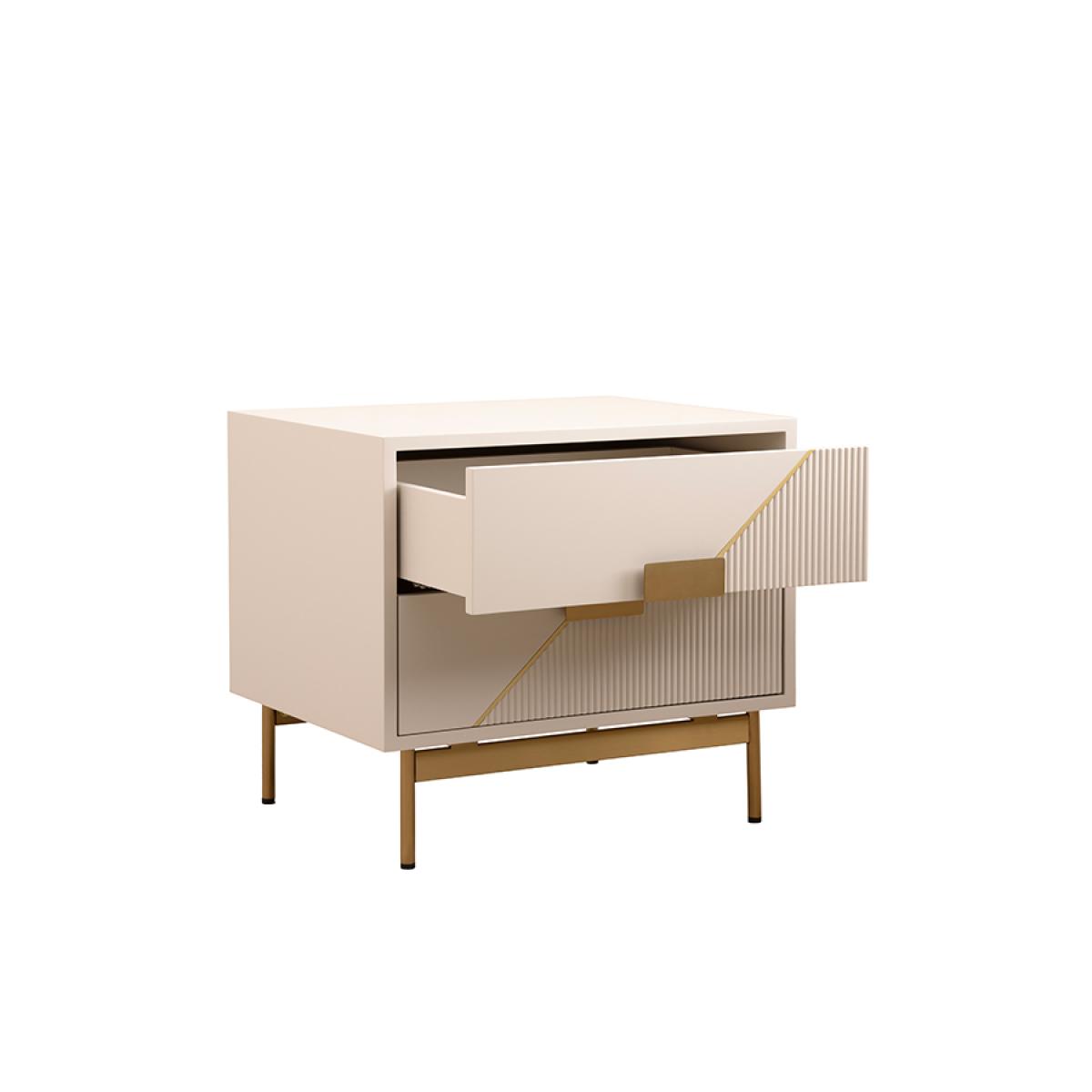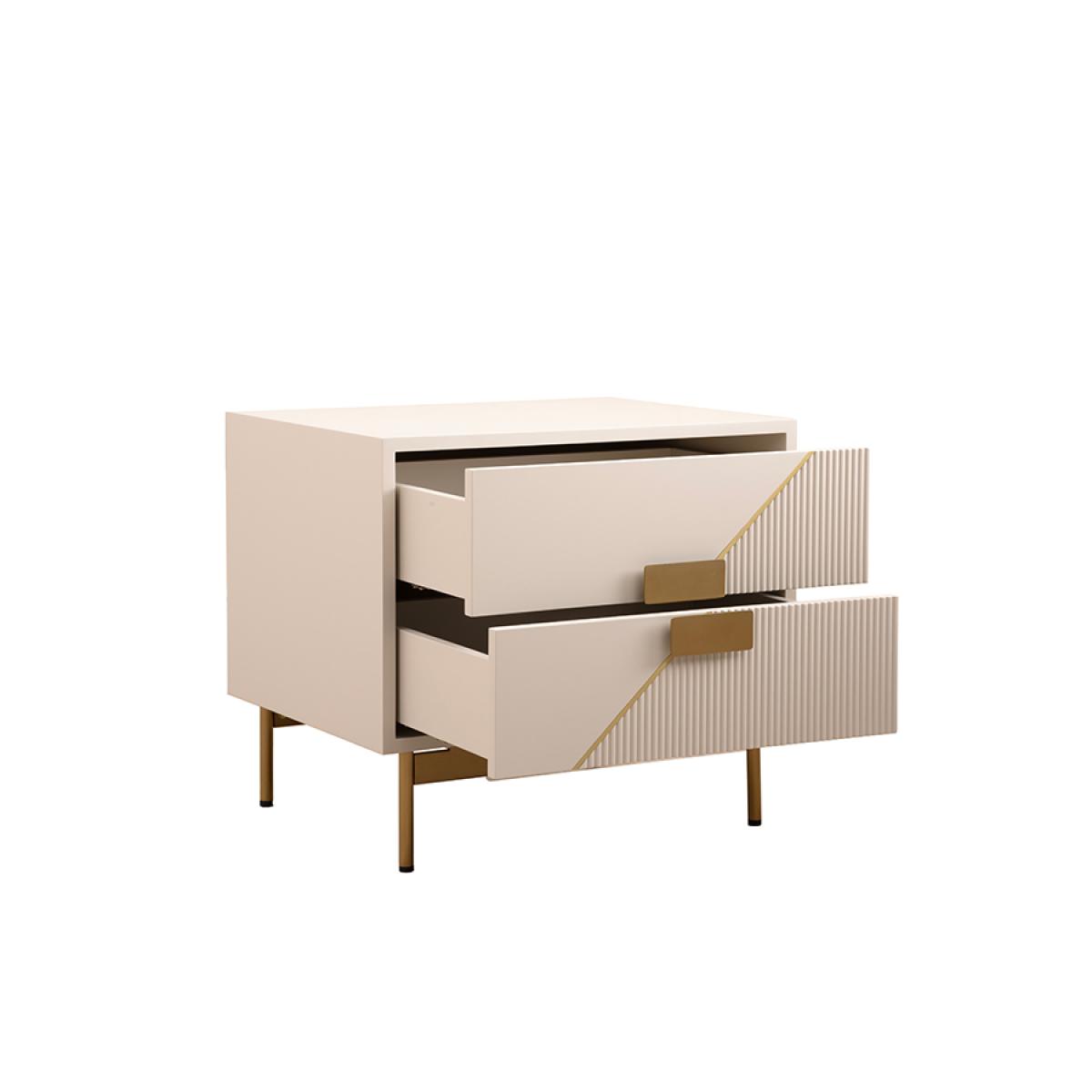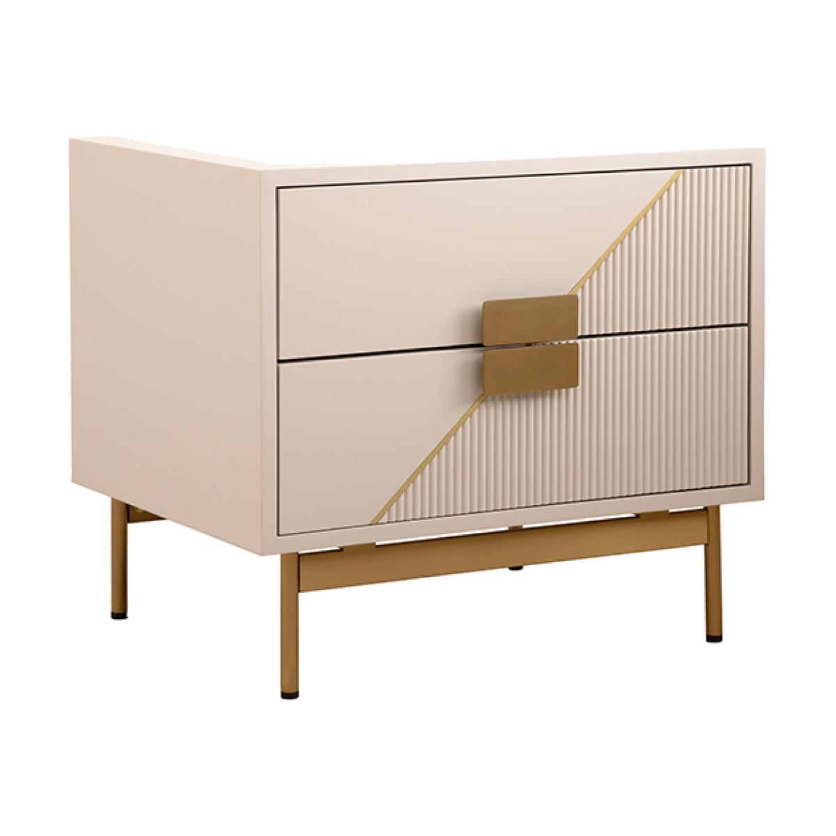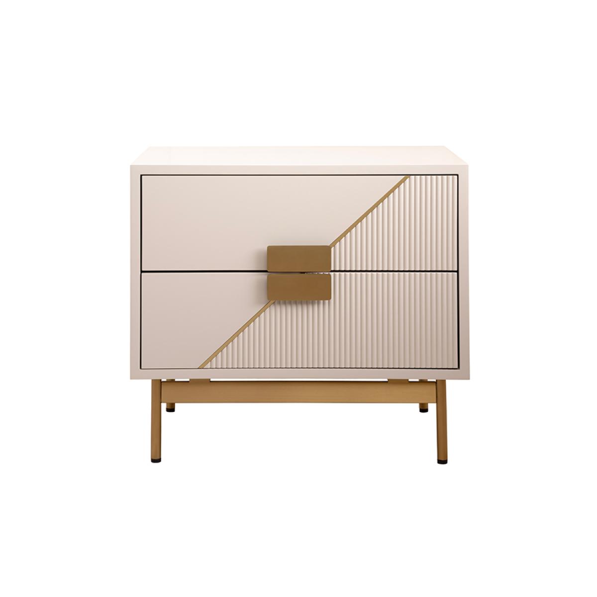 A glamourous, generously proportioned bedside table. Characterful drawer fronts featuring half-fluted detailing. Latte-coloured, durable polyurethane paint finish. Matt brass handles, base and inlay. Two spacious drawers with soft close runners. Assembly of the base is required.