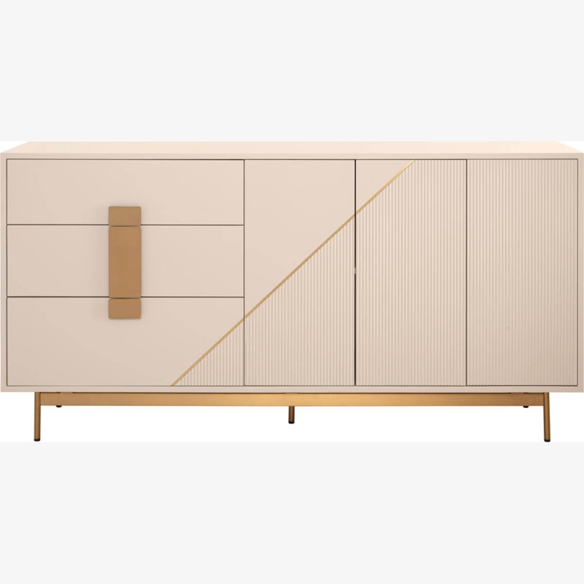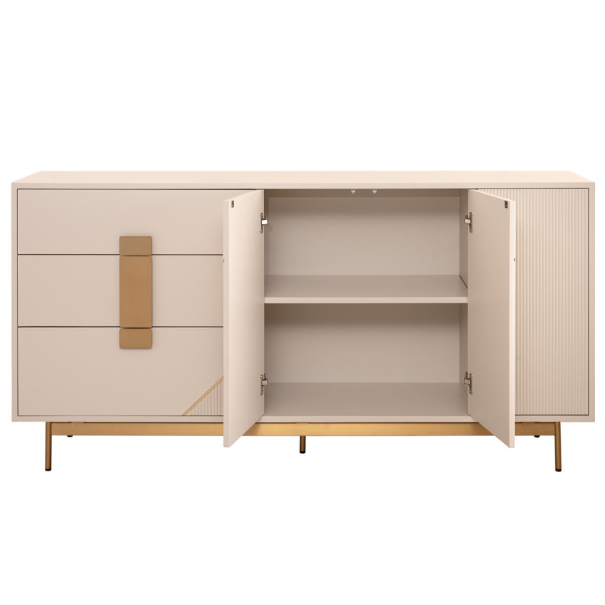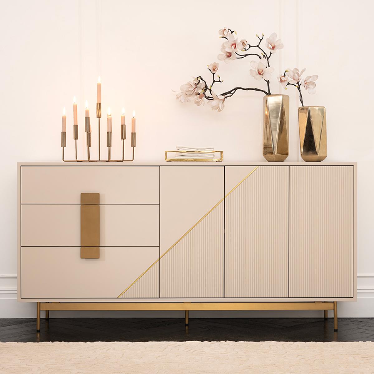 A glamourous, generously proportioned sideboard. Latte-coloured, durable polyurethane paint finish. Characterful fluted detailing. Matt brass handles, base and inlay. Three spacious drawers with soft close runners. Three doors with soft close runners. Height adjustable shelves. Simple assembly of the base is required. Please be aware that this item weighs 97. 5 kg, therefore two people will be required to manoeuvre, unbox and attach the legs.