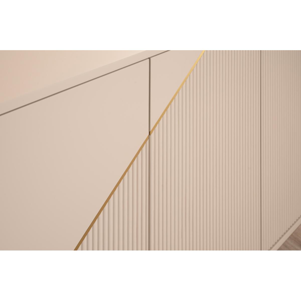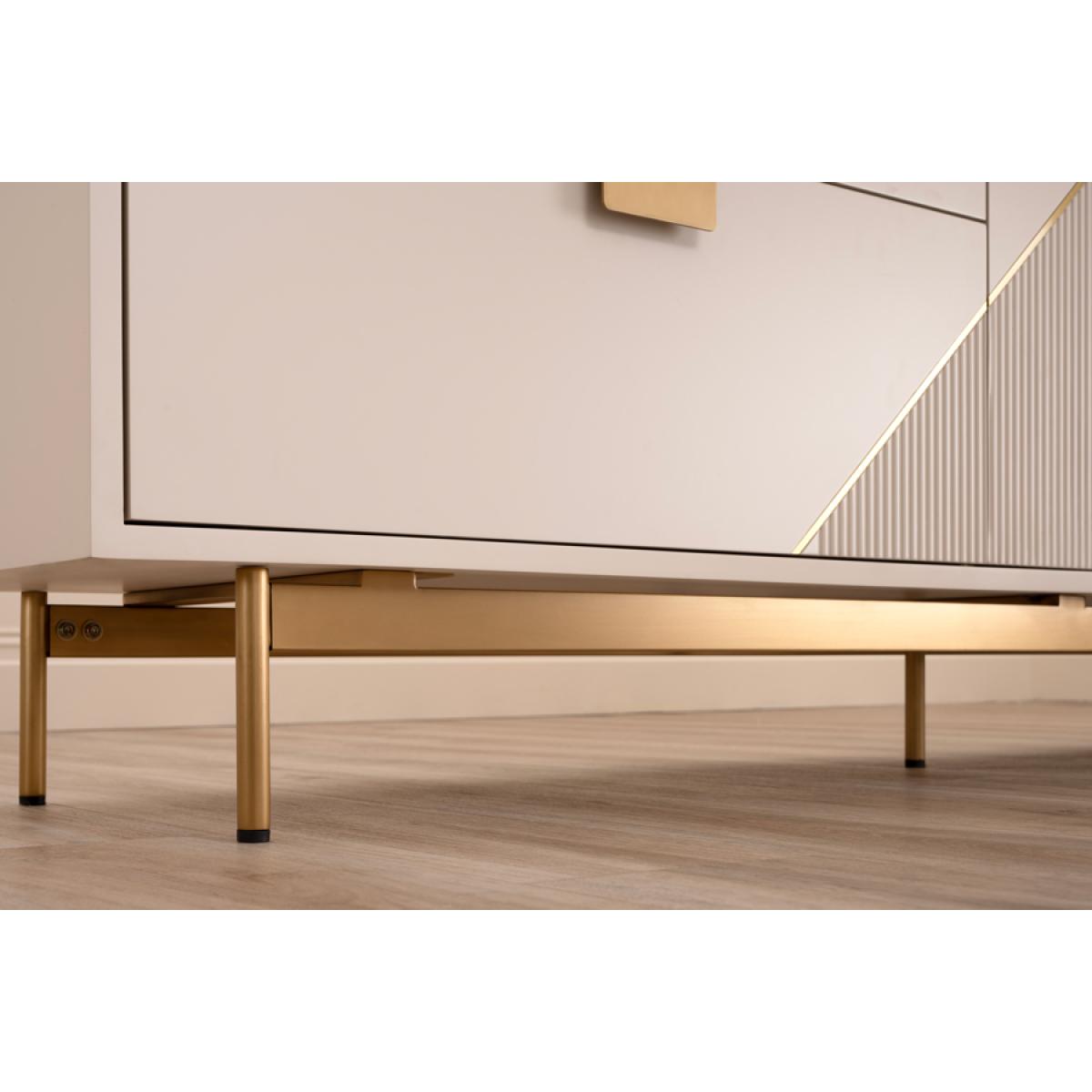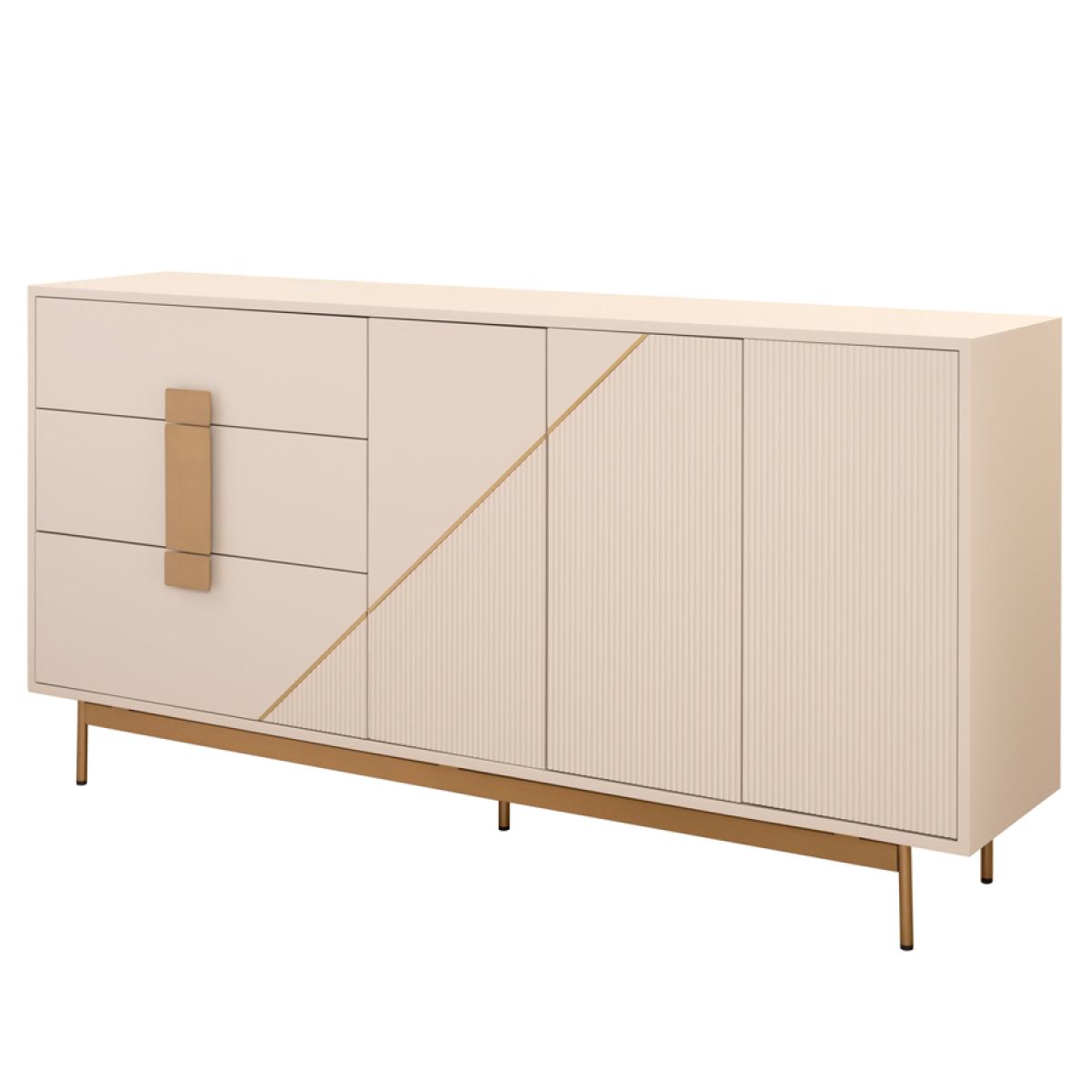 A glamourous, generously proportioned sideboard. Latte-coloured, durable polyurethane paint finish. Characterful fluted detailing. Matt brass handles, base and inlay. Three spacious drawers with soft close runners. Three doors with soft close runners. Height adjustable shelves. Simple assembly of the base is required. Please be aware that this item weighs 97. 5 kg, therefore two people will be required to manoeuvre, unbox and attach the legs.