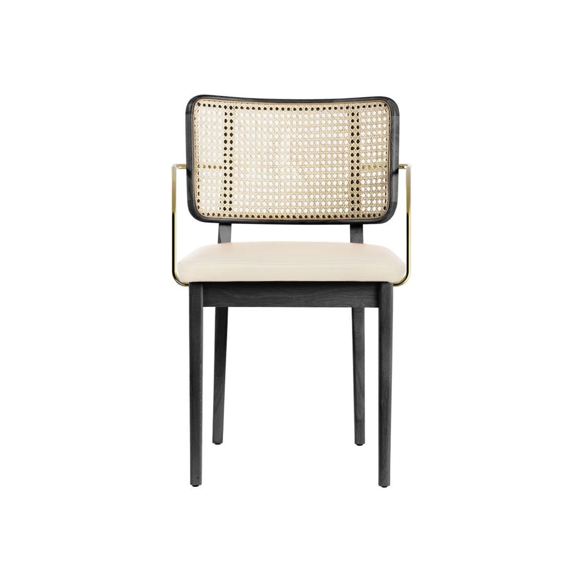 Fifties inspiration! This upmarket bistro-style armchair revisits the use of cane-work with modernity and elegance. This retro-looking armchair offers a superb combination of fine materials. Each detail underlines the know-how of Italian artisans. The natural rattan cane backrest combines with a luxurious seat upholstered in leather. Refined and very chic indeed, the cane-work plays with transparency and openwork effects. The solid oak structure is adorned with elegant armrests in gilded brass. Mixing influences, the Cannage armchair is a clever mix of vintage inspiration and contemporary lines. Very sophisticated, this armchair reflects the French way of life cultivated by Parisian brand Red Edition. It blends in with all styles, creating a soft, cosy, glamorous and inspiring feel... Parisian brand Red Edition invites you to rediscover the French way of life with modern design codes. Its recipe: a Parisian signature, clean lines and a requirement for noble materials.