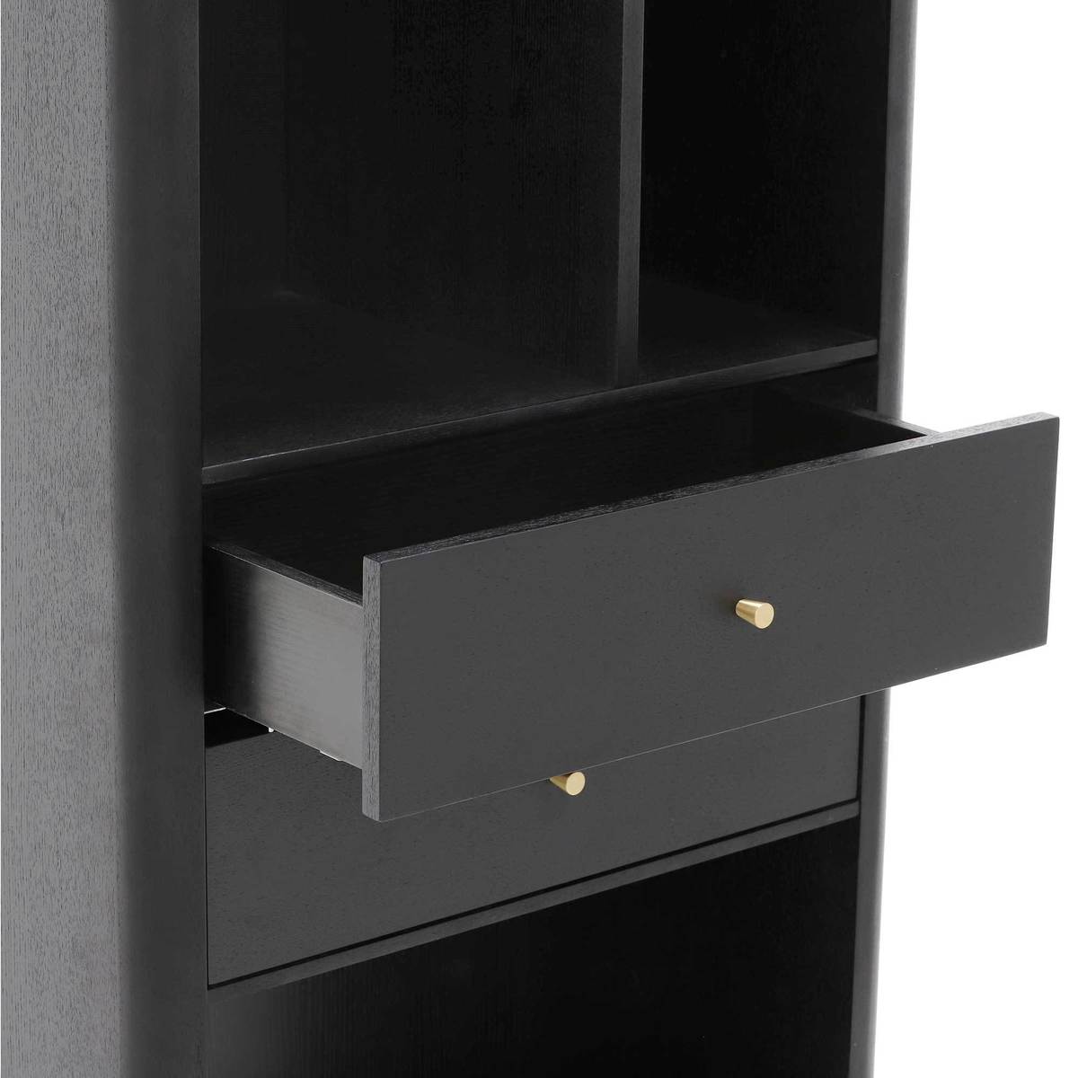 I love this bookcase for its sleek black ash finish paired with the striking black and gold legs, which bring a touch of contemporary sophistication. It works particularly well in modern, minimalist interiors or spaces with a hint of luxe, where its clean lines and understated elegance can really stand out. Practical styling tips include using open shelves for decorative objects or books, and utilising the drawers for tidying away less attractive items. It’s versatile enough for living rooms, bedrooms or even home offices, adding both function and style without overwhelming the space. Keep accessories minimalist to let the piece shine or add colour with curated books and statement accessories for a personalised touch.