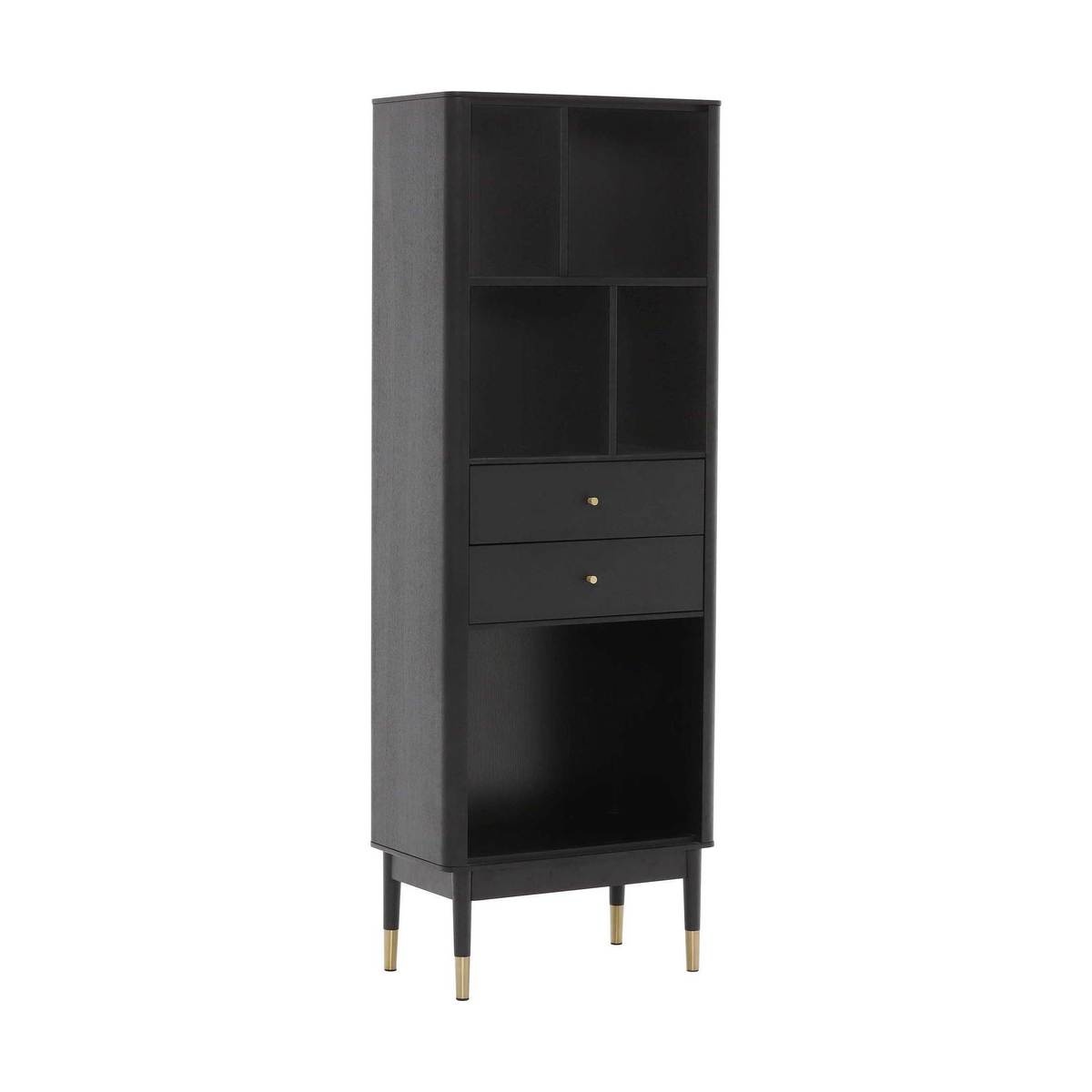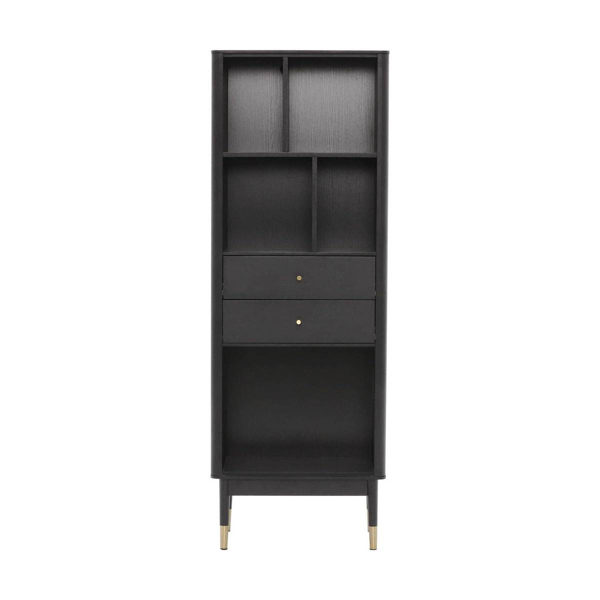 With contemporary asymmetric shelving, and a sophisticated aesthetic, the Cannelle Bookcase is a stylish storage solution, perfect for the modern home. Featuring a lower shelf, two central sliding drawers and two upper shelves, stylishly split to achieve a contemporary look, the Cannelle provides ultimate storage, for both displaying and stowing away your possessions. It has a slender design that makes the it suitable for a range of spaces, and with a beautifully contrasting black ash frame and brushed gold leg caps, the Cannelle makes a gorgeous storage statement.