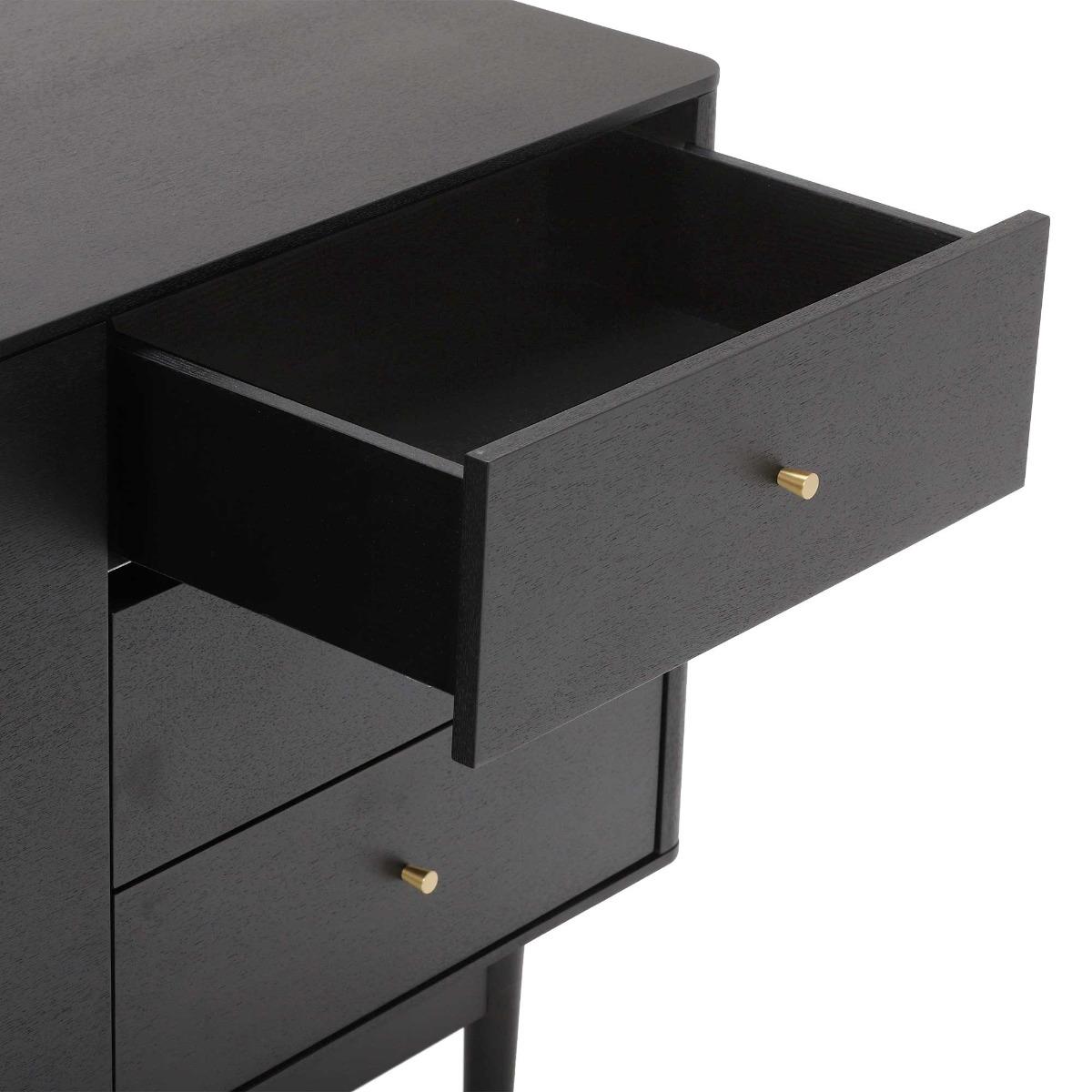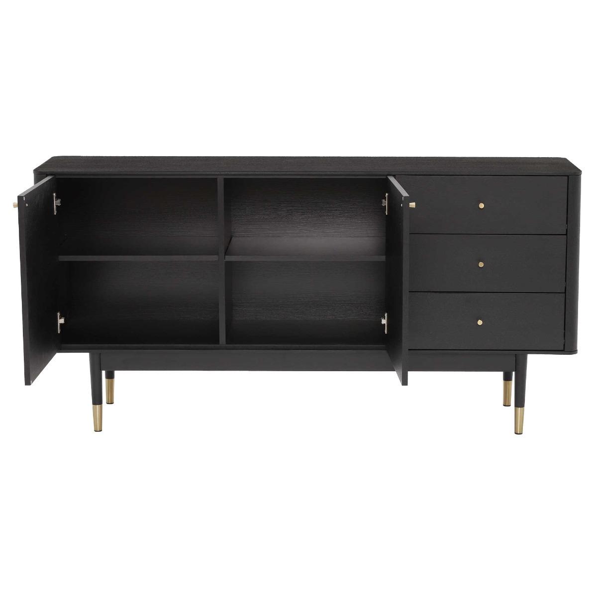 I love this piece for its sleek, contemporary look with a touch of elegance thanks to the black ash finish and subtle gold accents on the legs and handles. It works well in a variety of interiors, from modern and minimalist spaces to more eclectic setups where it can serve as a statement piece. Practical styling tips include using the top surface for decorative accents like vases, candles, or artworks, while utilising the internal storage for organising dinnerware or linens without cluttering the space. Its clean lines and neutral tone make it versatile for both living rooms and dining areas, providing both function and style effortlessly.