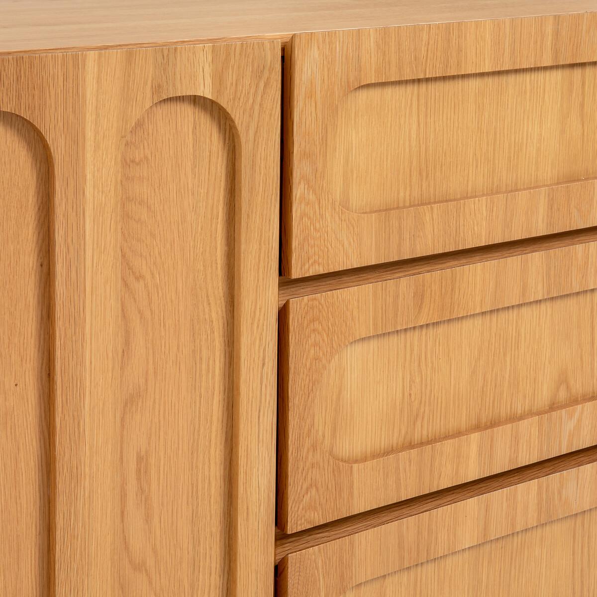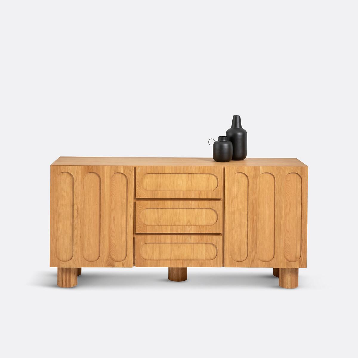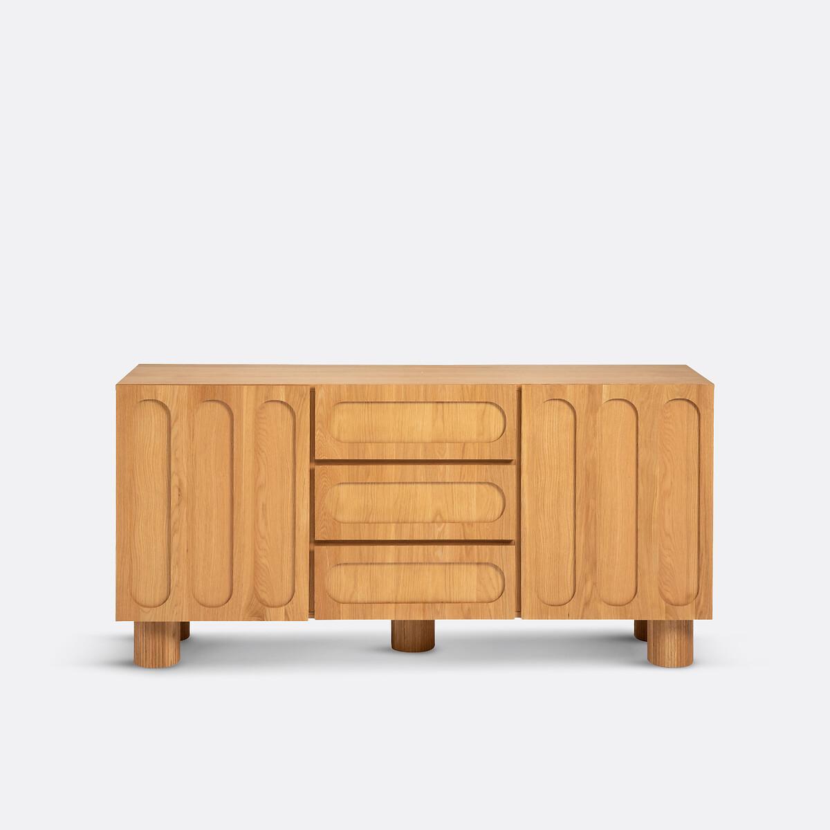 Raised oak fronts, fluted feet, generous dimensions. The Cannelo sideboard offers multiple storage spaces for your crockery, cutlery and table linen. The future centerpiece of your home. Created by La Redoute Interiors. Product Details • Pre-assembled cabinet in particle board and oak veneered MDF • 2 doors, soft closing hinges • 2 fixed shelves • 4 compartments • 3 drawers on wooden slides • Fluted legs in solid oak • Supplied ready assembledDimensions. Overall • Length: 165cm • Height: 80cm • Depth: 46.5cm • Height of legs: 15cm. Usable space • Compartments : L51 x H29.6 x D43.5cm • Drawers : L52 x H12.5 x D37cm • Sold with feet to be attached. • WOOD FROM SUSTAINABLY MANAGED FORESTS. FSC® certified wood comes from forests that are environmentally, socially and economically well managed. Dimensions and weight of parcel1 parcel • L172 x H72 x D53.5cm. 74kg.