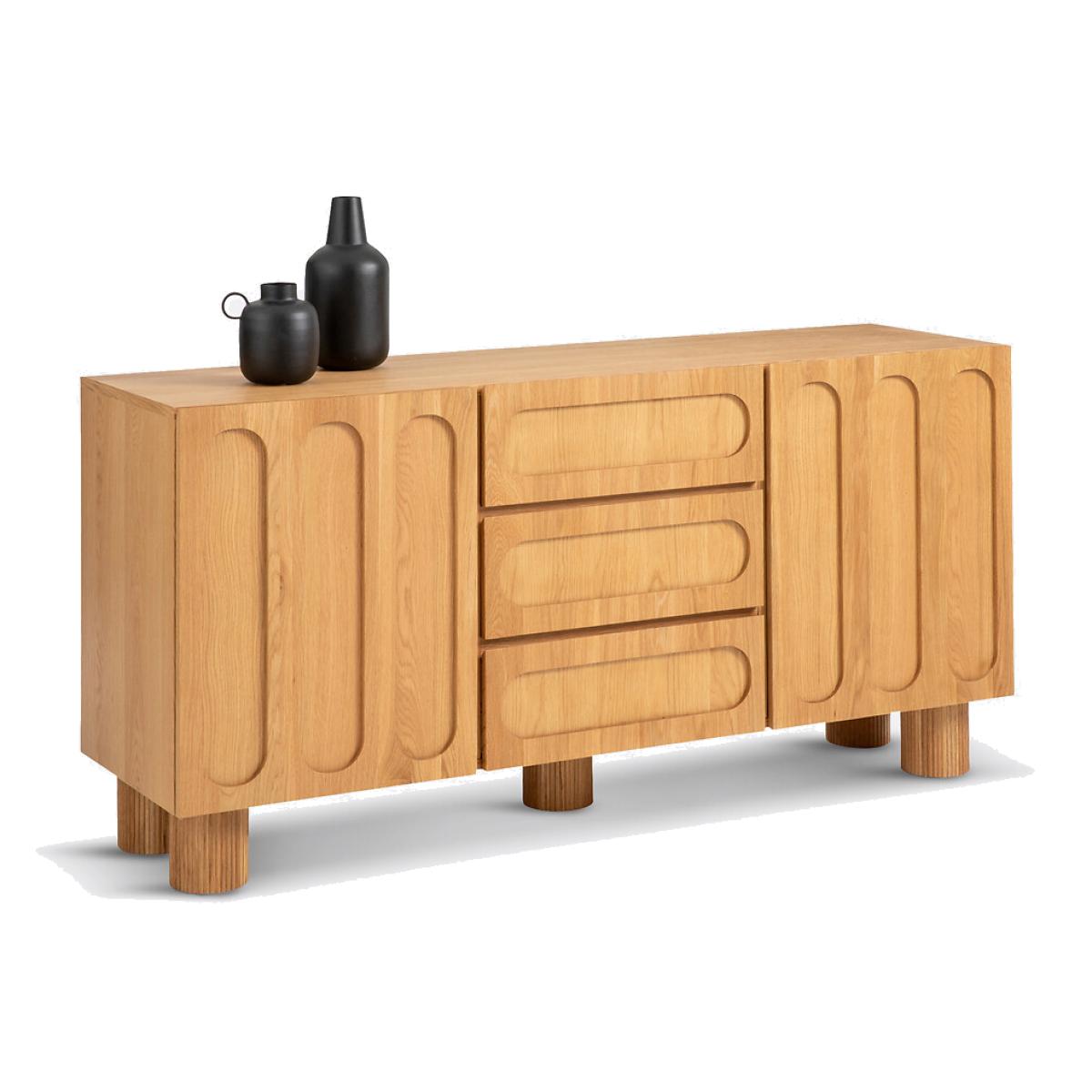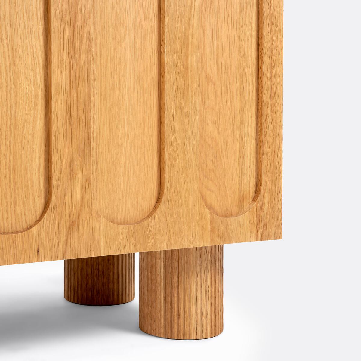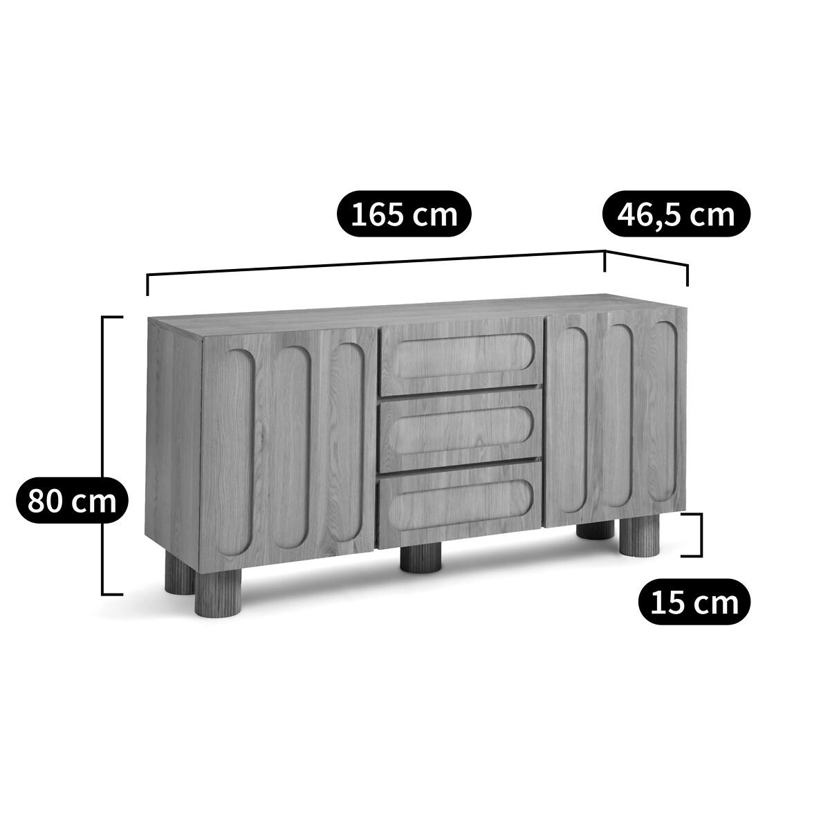 Raised oak fronts, fluted feet, generous dimensions. The Cannelo sideboard offers multiple storage spaces for your crockery, cutlery and table linen. The future centerpiece of your home. Created by La Redoute Interiors. Product Details • Pre-assembled cabinet in particle board and oak veneered MDF • 2 doors, soft closing hinges • 2 fixed shelves • 4 compartments • 3 drawers on wooden slides • Fluted legs in solid oak • Supplied ready assembledDimensions. Overall • Length: 165cm • Height: 80cm • Depth: 46.5cm • Height of legs: 15cm. Usable space • Compartments : L51 x H29.6 x D43.5cm • Drawers : L52 x H12.5 x D37cm • Sold with feet to be attached. • WOOD FROM SUSTAINABLY MANAGED FORESTS. FSC® certified wood comes from forests that are environmentally, socially and economically well managed. Dimensions and weight of parcel1 parcel • L172 x H72 x D53.5cm. 74kg.