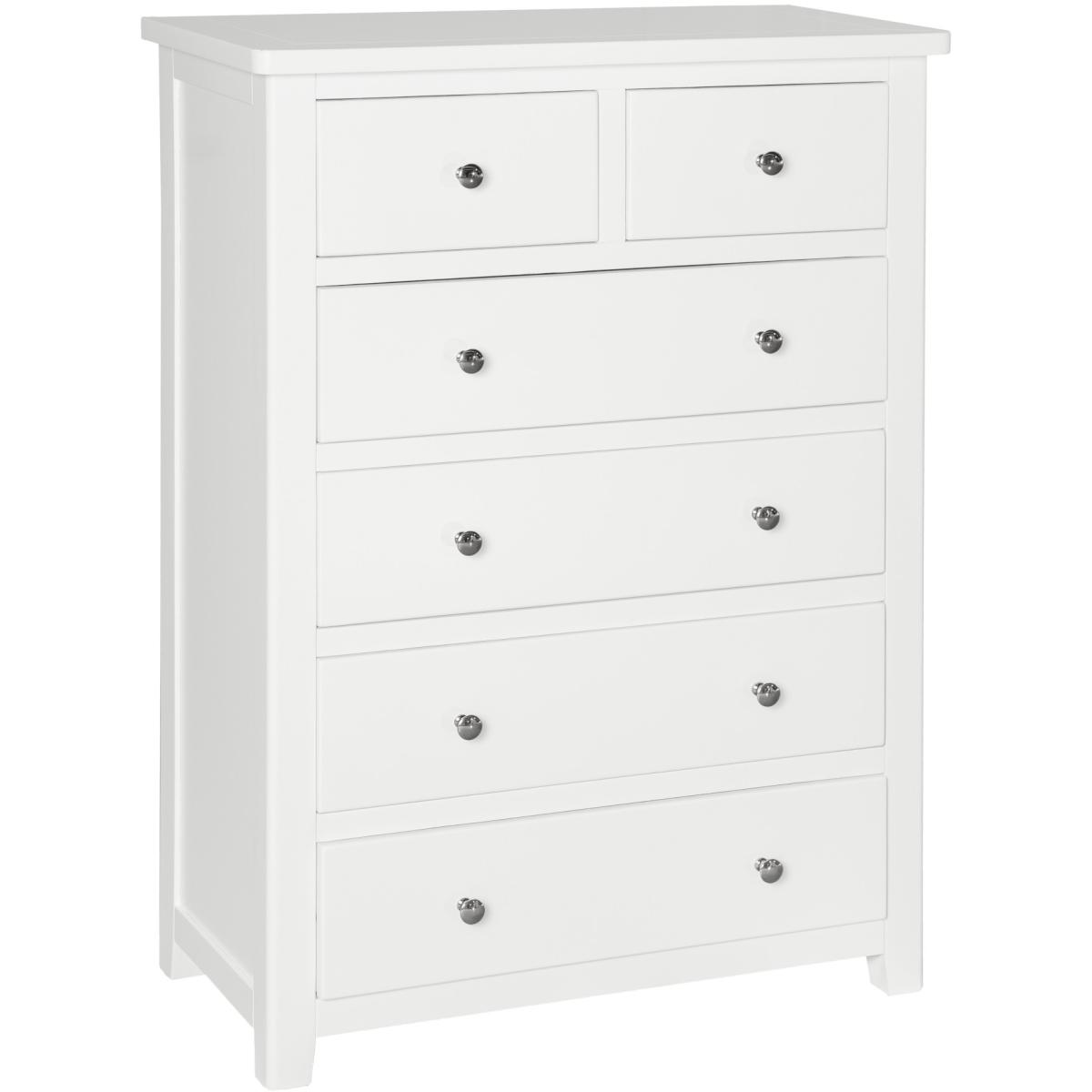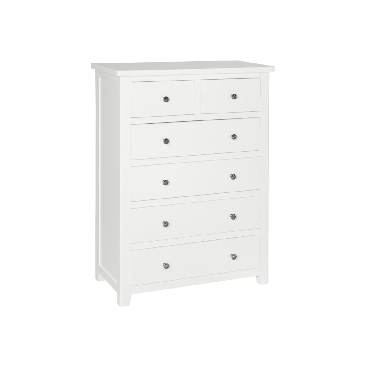 The Cannes 2+4 Chest of Drawers in Painted White blends timeless design with practical functionality, making it an excellent choice for any bedroom. Part of the versatile Cannes furniture range, this chest features a clean, fresh aesthetic and an elegant all-over oak finish, perfectly suited to both modern and classic interiors. Crafted with care, the chest features a robust pine framework paired with durable MDF tops, panels, and drawers. The look is completed with chrome-look hinges and a neat, round handle for a touch of sophistication. Offering exceptional storage, the 2+4 configuration includes two smaller top drawers for easy access to everyday essentials and four spacious lower drawers to neatly organise clothing, bedding, or other items. Delivered fully assembled, it’s ready to use straight away for your convenience. Features: MDF and Pine Material Painted White Finish 2 Small & 4 Large Drawers Metal Knob Handle Also Matching Furniture Available Delivered Fully Assembled Dimensions: Height: 112cm Width: 80cm Depth: 40cm Net Product Weight 38 kg Stylish, durable, and highly practical, the Cannes 2+4 Chest of Drawers is the perfect addition to enhance your bedroom space. Please note All screens vary in colour reproduction and whilst every effort has been made to display the colour as accurately as possible it is for guidance only.