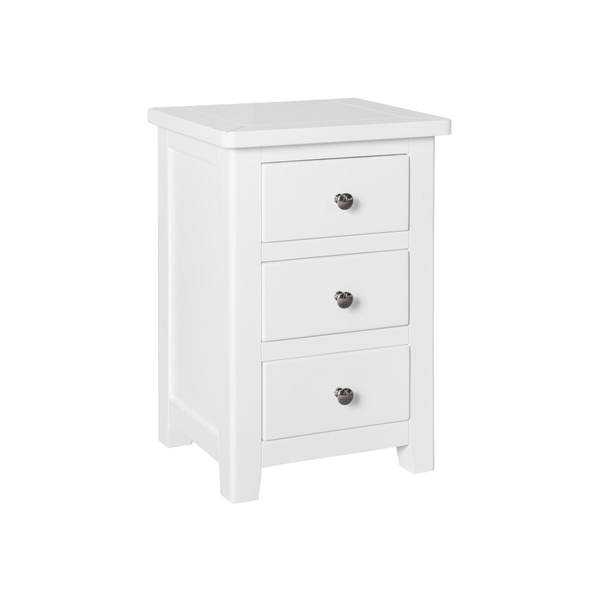 The Cannes Bedside Cabinet in Painted White offers a stylish and functional addition to any bedroom. Part of the versatile Cannes range, this piece is available in a selection of painted finishes or a classic oak design, making it a perfect fit for various interior styles. Designed with practicality in mind, the compact Cannes collection features a clean and fresh look. The framework is crafted from sturdy pine, while the tops, panels, and drawers are made from durable MDF. Chrome-effect hinges and a sleek round handle provide a modern and refined finishing touch. With three neatly arranged drawers, this bedside cabinet is ideal for keeping your essentials organized and within easy reach. Features: Painted White finish for a contemporary style Compact design ideal for bedrooms of any size Durable pine framework with MDF tops and panels Chrome-effect hinges and a neat round handle for added detail Fully assembled for a simple, stress-free setup Dimensions: Height: 60cm Width: 40cm Depth: 35cm This bedside cabinet combines style and practicality, making it a charming and useful piece for any bedroom. Please note All screens vary in colour reproduction and whilst every effort has been made to display the colour as accurately as possible it is for guidance only.
