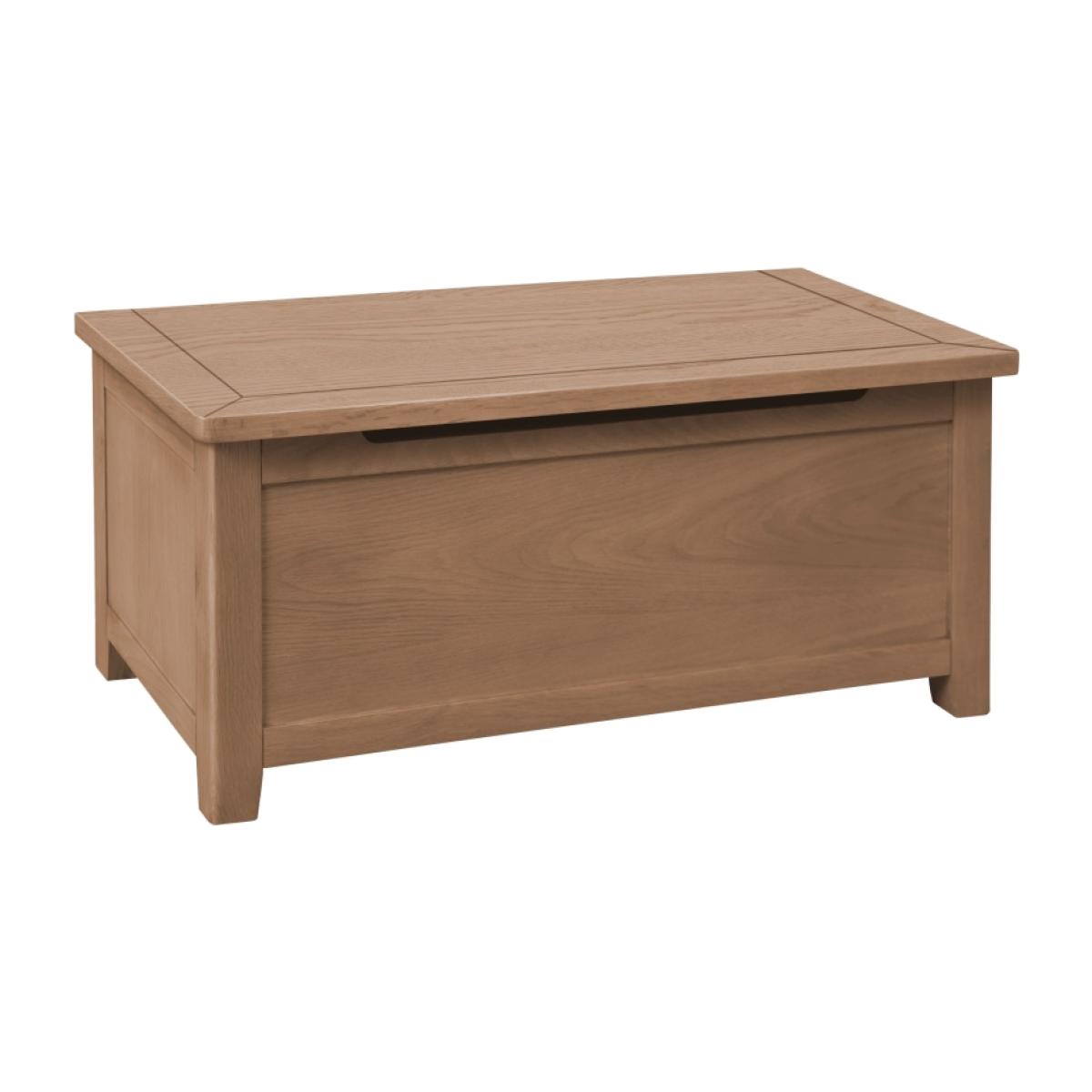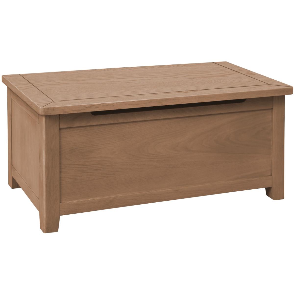 The Cannes Blanket Box in Oak finish is a practical and stylish storage solution, perfect for any bedroom. Part of the versatile Cannes range, this piece is designed to complement both painted colourways and the all-over oak finish found in the collection. With its compact and clean design, the blanket box is as functional as it is elegant. The sturdy framework is constructed from pine, while the top and panels are made from durable MDF, ensuring lasting quality. Its smooth Oak finish adds warmth and charm to your bedroom décor. Designed to sit neatly at the foot of your bed frame, this blanket box is the ideal place to store spare sheets, bedding, or other essentials, keeping your space tidy and organized. Features: Oak finish for a classic and timeless look Compact design, perfect for bedroom storage Sturdy pine framework with durable MDF panels Fully assembled for immediate use Dimensions: Height: 40cm Width: 90cm Depth: 45cm This blanket box combines functionality with style, making it a versatile and essential addition to any bedroom. Please note All screens vary in colour reproduction and whilst every effort has been made to display the colour as accurately as possible it is for guidance only.