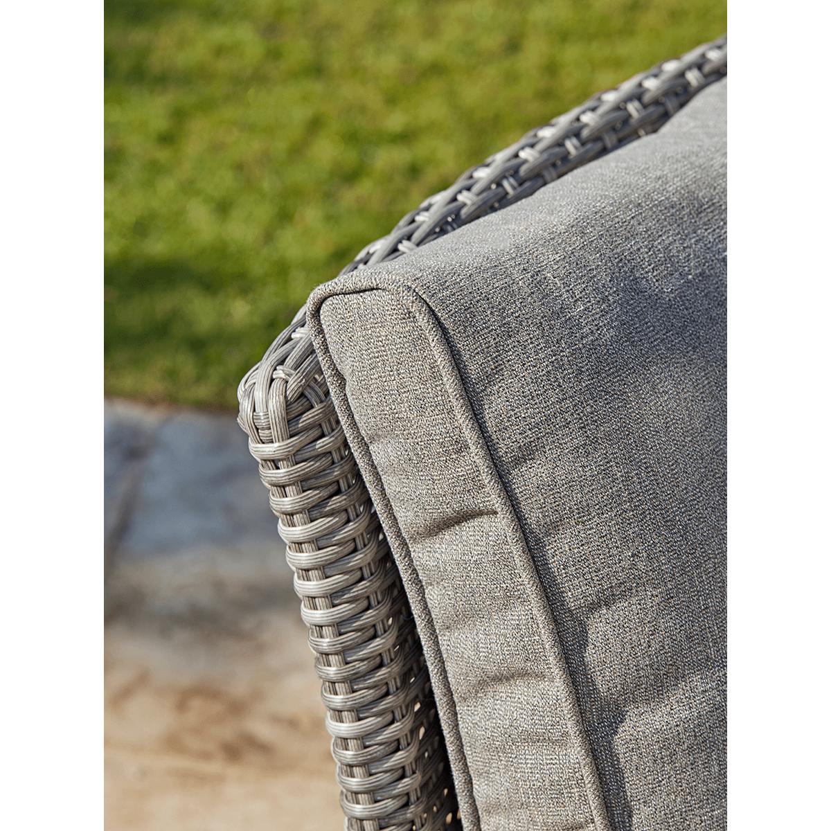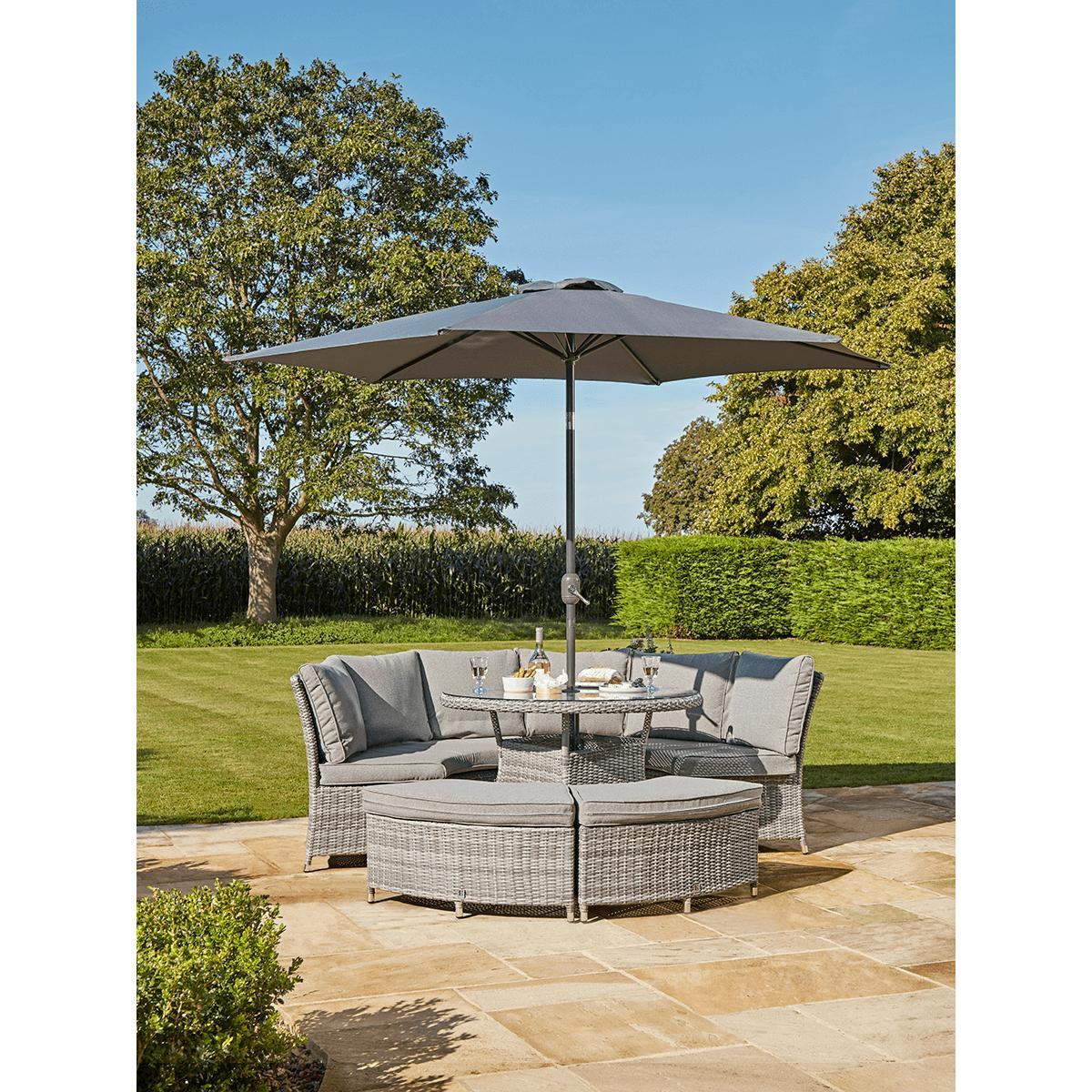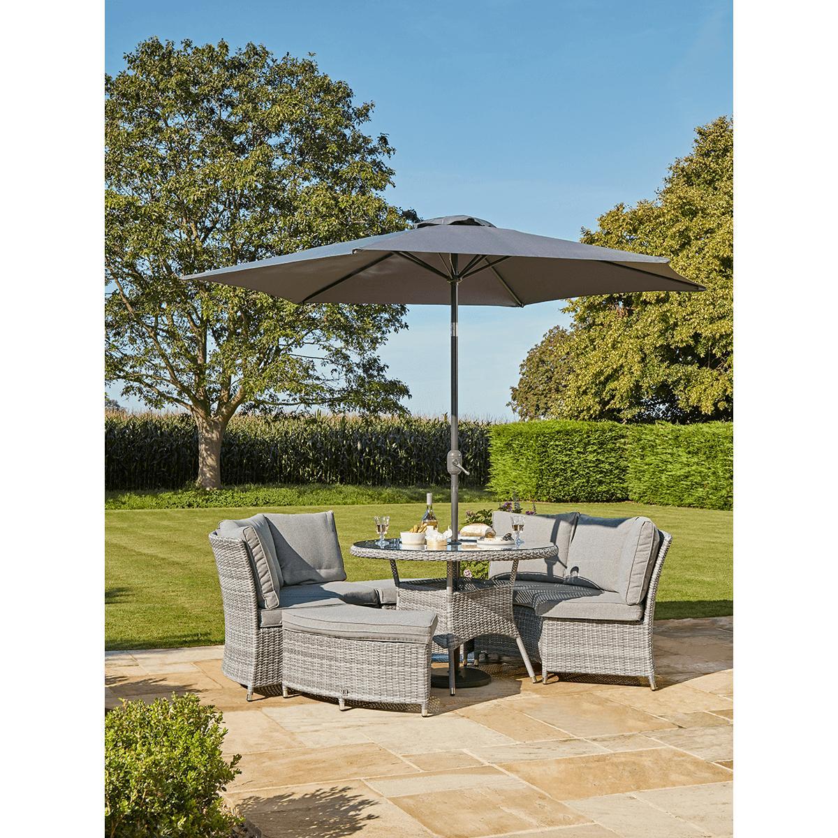 Crafted from waterproof wicker with a strong aluminium frame, our elegant but durable dining set is perfect for family dining on the terrace or patio. Both sofas, each with three cushioned back rests are shaped about the central table with two curved benches to create a sociable spot in which to relax outdoors, and a crank mechanism vented parasol offers your company shade from the sun. Consisting of a parasol, shaped glass topped table and curved seating our set comes with sumptuous cushions and various arrangement possibilities.