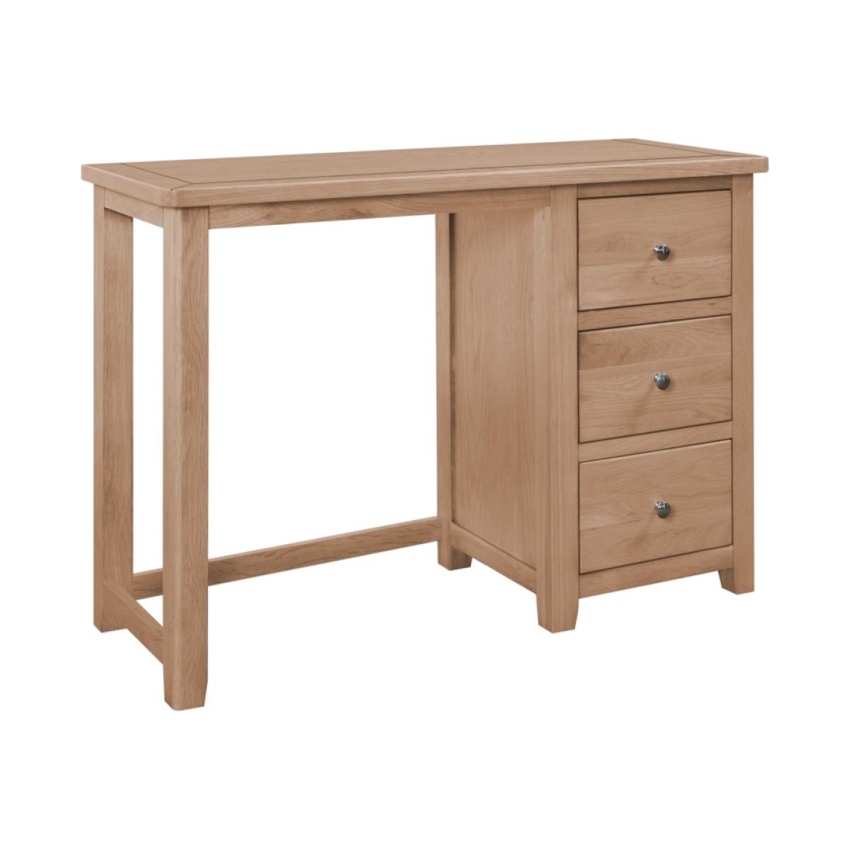 The Cannes Dressing Table - Oak brings a touch of natural elegance and practicality to your bedroom or dressing area. Crafted from high-quality oak, this dressing table showcases the wood's rich grain and warm tones, creating a timeless look that fits effortlessly into a variety of interior styles. The clean lines and minimalist design enhance its modern appeal while ensuring a versatile, functional piece. Featuring ample surface space, the Cannes Dressing Table provides plenty of room for your beauty essentials, cosmetics, and accessories. It’s designed to help you stay organized while offering a stylish place to prepare for the day. The sturdy oak construction guarantees durability, ensuring this dressing table will last for years to come. With its natural charm and sophisticated design, the Cannes Dressing Table - Oak is the perfect blend of style and functionality, making it an excellent choice for anyone looking to add a sleek and timeless piece to their home. Features: MDF and Pine Material Oak Finish 3 Drawers Metal Knob Handle Also Matching Furniture Available Home assembly is required. Dimensions: Height 78cm Width 107cm Depth 40cm All screens vary in colour reproduction and whilst every effort has been made to display the colour as accurately as possible it is for guidance only.