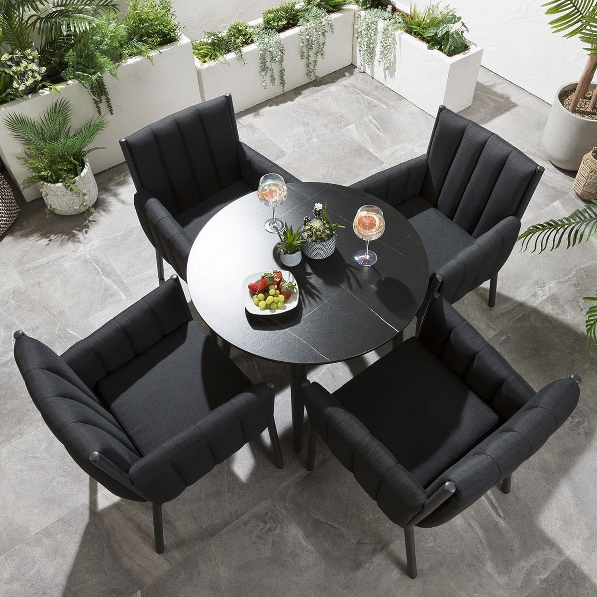 The Cannes garden chairs in charcoal by Quatropi. Premium outdoor dining chair. The chairs are made from high-grade aluminium which makes them very lightweight and easy to organise around a garden table. The weather resistant base cushion is created with high-density foam for long-lasting support, whilst the back and side cushions are wadding filled which provides ultimate comfort for those long summer dinner parties. The cushions are upholstered in a premium medium grey fabric - part of the unique designer range of garden patio furniture exclusive to Quatropi. Ongoing maintenance of the dining chairs is easy, the frame and cushions can easily be cleaned with warm soapy water. Relax and enjoy the great outdoors from the comfort of garden chairs from Quatropi. There's nothing quite like spending quality time in your own backyard, so it's little wonder this range of comfy yet practical garden furniture is so popular. Great garden furniture can enhance and complement your garden or balcony, as well as expanding your socialising options beyond the living and dining room. Investing in your outdoor living space can pay great dividends in the spring and summer months, opening up your choices for al fresco dining, garden parties and evening cocktails. A durable garden chair from Quatropi will deliver great value-for-money and can last years or even decades. Make the most of your outdoor space with a carefully selected aluminium garden furniture set. Perfect for even the most strenuous weather conditions, all you have to do is keep the cushions dry. Stylish and classic, aluminium has been a steadfast choice for garden furniture and comes in many different styles, paints and stains. All aluminium frame 5 Year Warranty Exclusive Quatropi design