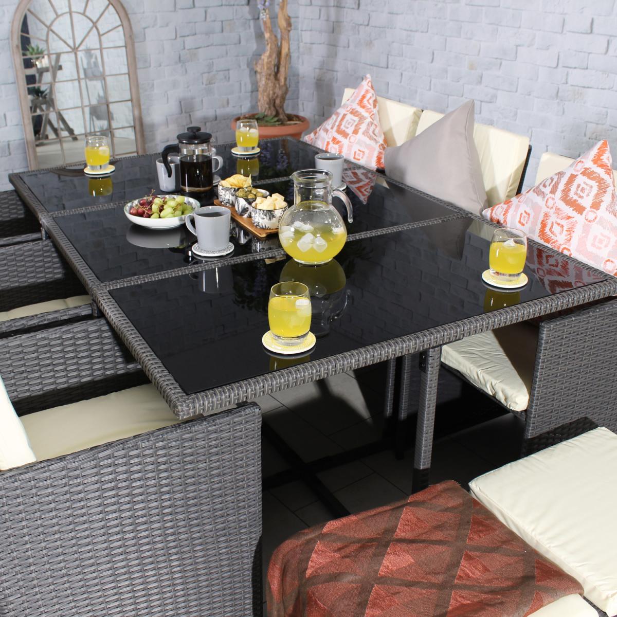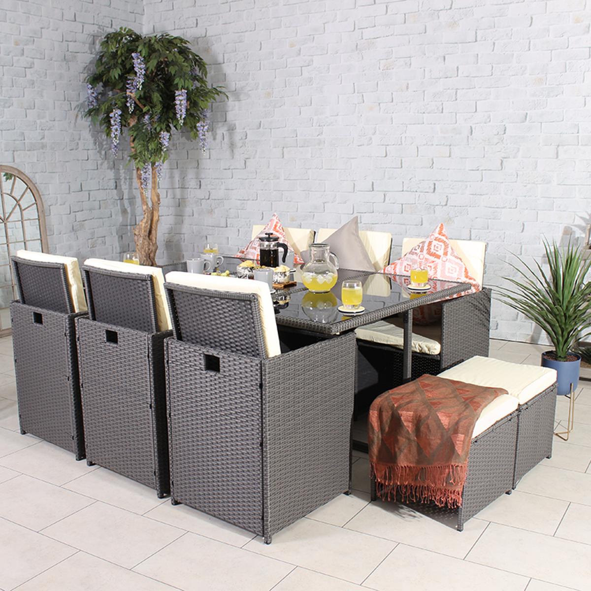 The Cannes Grey 10 Seater Cube Set is a versatile choice for outdoor dining, offering a sleek and modern look that works well in contemporary or minimalist garden settings. The grey finish is neutral and complements a wide range of colour palettes, making it easy to style with colourful cushions, throws, or tableware for added personality. It’s practical for families or entertaining guests, thanks to its durable weather-resistant material. For styling tips, consider pairing it with outdoor rugs or potted plants to soften the look and create a welcoming dining space. Practical accessories like seat cushions or a parasol can also enhance comfort and shading, ensuring it remains functional and stylish throughout the seasons.