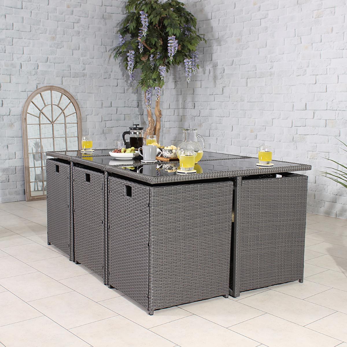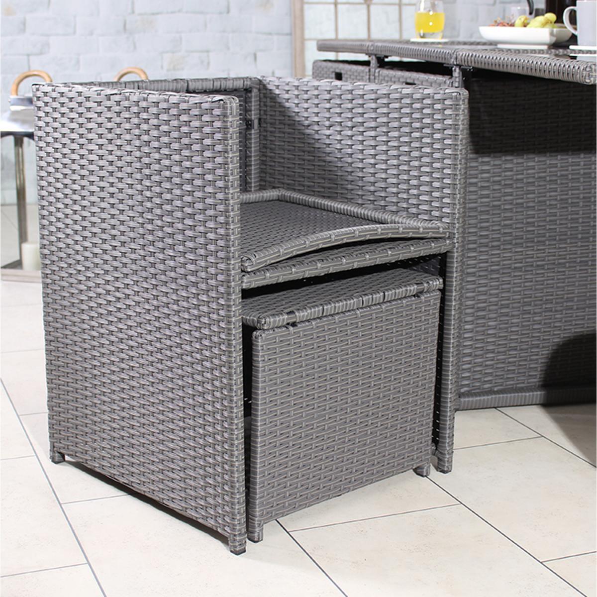 The Cannes 10 Seater KD Grey Cube Set is a classic and practical, space storing design. This set features a steel framework and hand woven, synthetic rattan. This set offers style, comfort, practicality and durability. Complete with a table, cube chairs with folding back rests and footstools that store away compactly inside the chair, the cubic design allows it all to be stored away ensuring minimal space is taken up.