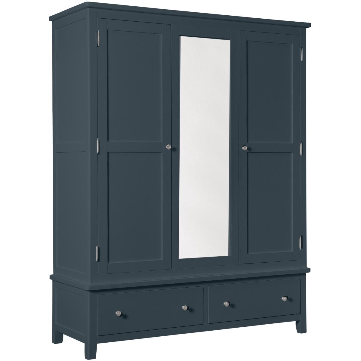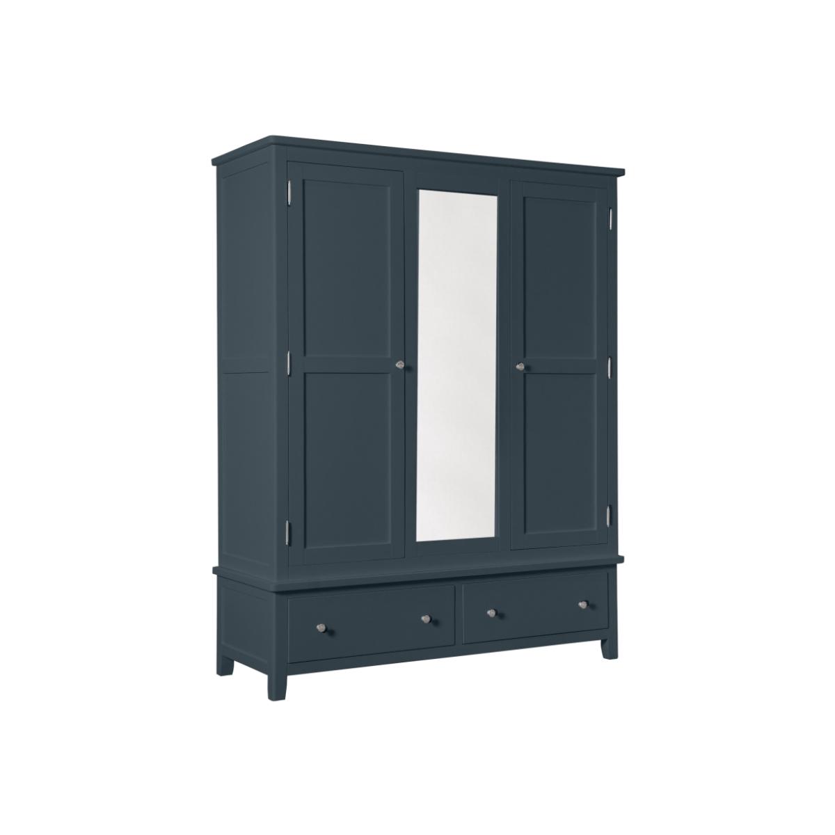 The Cannes Triple Wardrobe - Painted Blue is a bold and stylish storage solution that brings a vibrant pop of colour to your bedroom. Finished in a rich, painted blue, this wardrobe combines modern design with functional storage, making it a standout piece in your space. The deep blue finish adds sophistication while effortlessly complementing a variety of decor styles, from contemporary to coastal or eclectic. With three doors, the Cannes Triple Wardrobe offers generous storage capacity, featuring hanging rails for garments, along with shelves or drawers for folded clothes, shoes, and accessories. Its spacious design helps keep your bedroom organized and clutter-free, offering a perfect blend of form and function. Whether you're looking to add a colourful focal point to your room or need a practical storage solution, the Cannes Triple Wardrobe - Painted Blue offers both elegance and practicality, making it an ideal choice for your home. MDF and Pine Material Painted Blue Finish Mirror Door Hanging Rail 2 Drawers Metal Knob Handle Also Matching Furniture Available Home assembly is required. Dimensions: Height 190cm Width 147cm Depth 57cm All screens vary in colour reproduction and whilst every effort has been made to display the colour as accurately as possible it is for guidance only.