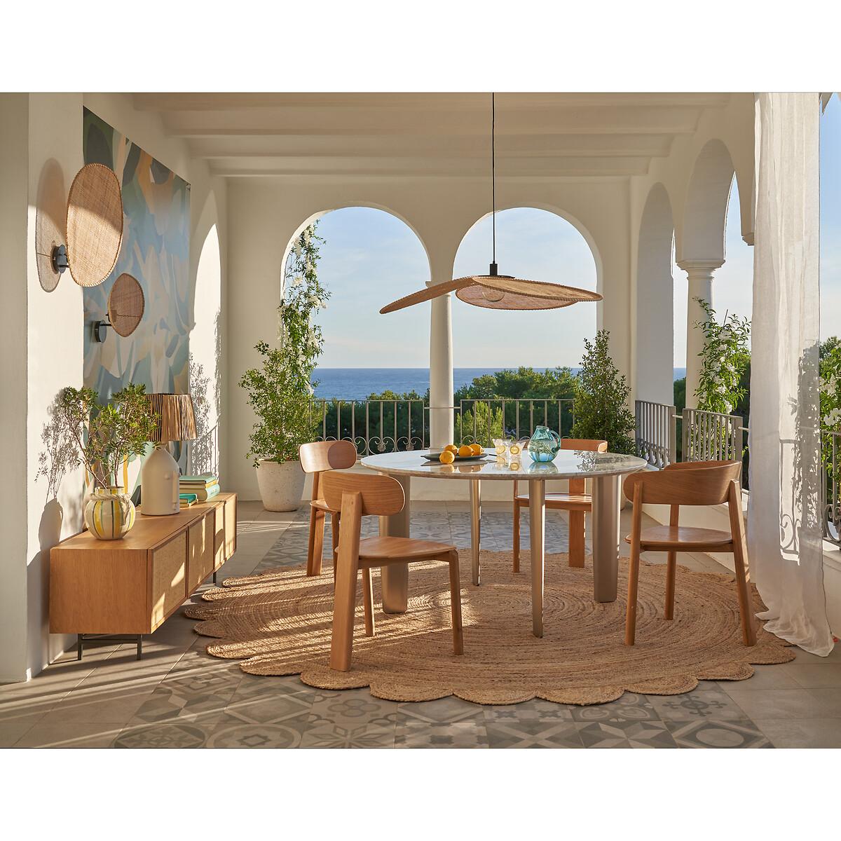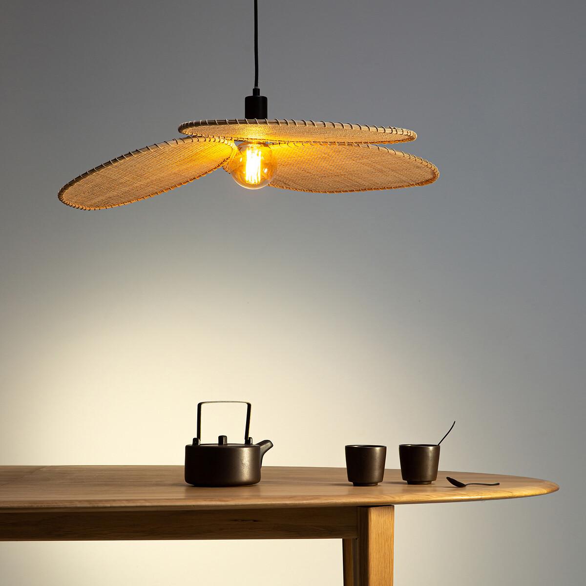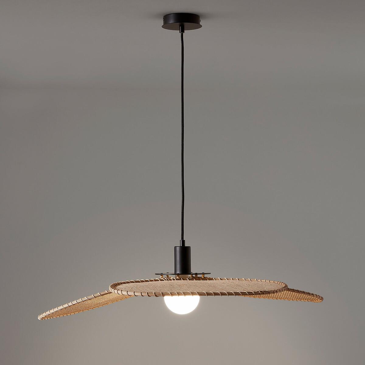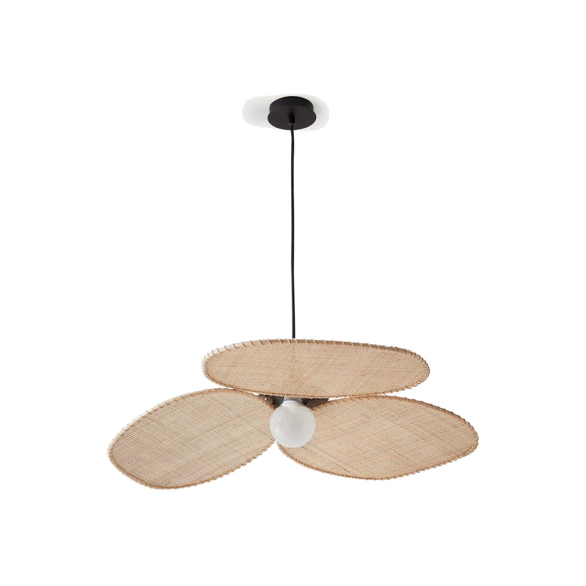 An Emmanuel Gallina exclusive for AMPM. Recalling the organic forms of foliage suspended in space, the Canopée ceiling pendant evokes a natural sense of weightlessness. Fashioned from delicate woven rattan. A desire to create a flat design for a discreet finish on walls and ceilings. This light becomes a real ornamental piece or a luminous sculptural silhouette. Product Details • 3 organically shaped panels in woven rattan that filter the light • Steel structure with matte black epoxy finish • Black textile covered cable • Supports E14 bulb, 40W (not supplied)Dimensions • Total:Diameter 79 x H160cm • Long. Max cable length: 180cm • Weight: 1.62kg. Dimensions and weight of parcel • 54 x 40 x 18cm • 2.69kg