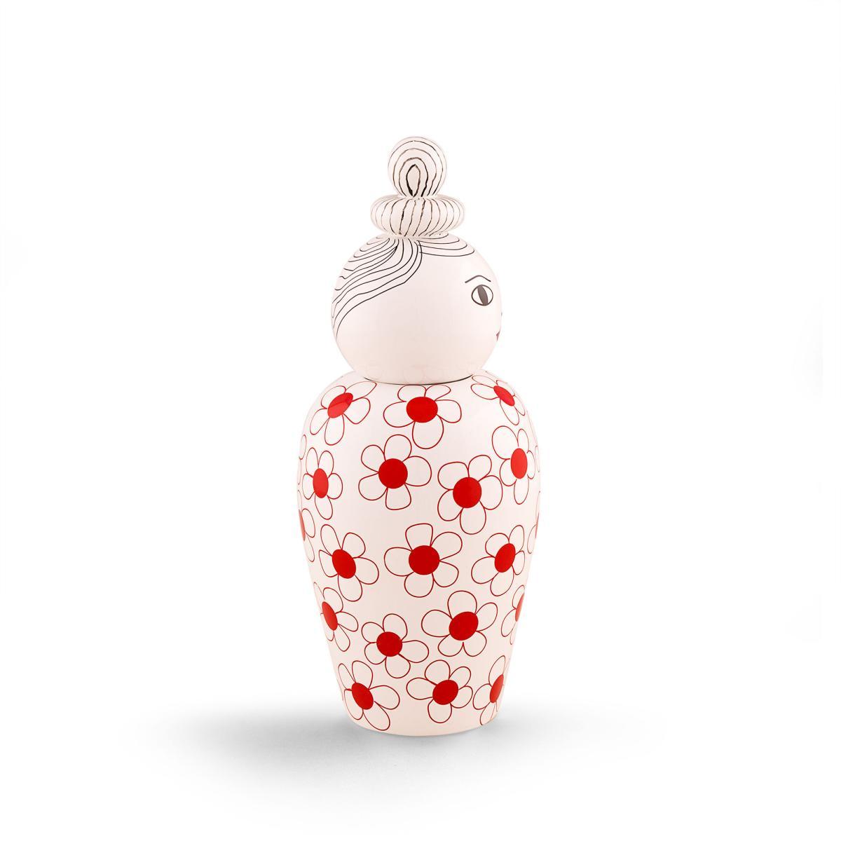 Colourful and cheerful, these vases are as functional as they are decorative. Canopie is a collection of porcelain vases made by designer Elena Cutolo. Each vase represents a young girl from a different origin: Pepa from America, Lula from Oceania, Rosio from Africa, Izumi from Asia and Zoe from Europe. To tell them apart, these vases sport different colours and patterns, faces with distinct expressions, as well as a different hairstyle. Each has its own personality! When she designed the Canopie vases, Elena Cutolo imagined an encounter between five friends who wanted to share a friendly moment together in diverse cultural contexts. In this world that has become completely virtual, where touch screens are king, these young girls prefer to share their different values, habits and customs. They also each take gifts from their continent for the others to discover. When you’re not using them, your vase with its lid is a beautiful decorative item. With its generous size, this vase can also act as storage and accommodates various objects in its belly.