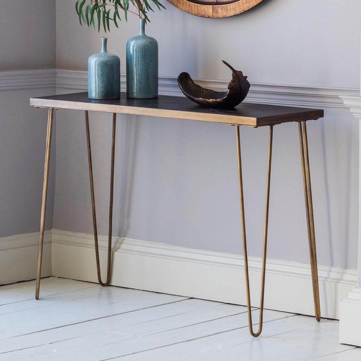 I love this little console table for its sleek and minimalist design, making it a versatile piece that can work in various interiors. It’s perfect for narrow hallways, entryways, or even as a stylish surface behind a sofa. The combination of wood and metal gives it a contemporary feel, while its slim profile helps optimise space. For styling, consider layering it with decorative vases, statement bowls, or framed artwork, and add a mirror or artwork above to create a focal point. Its tapered legs provide a subtle sense of elegance, but keep the arrangement balanced and avoid clutter for a clean, modern look.