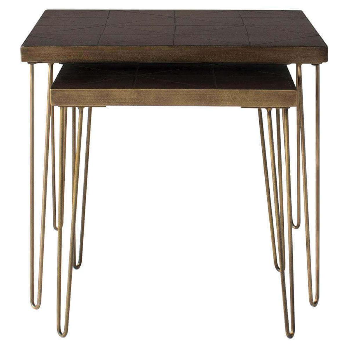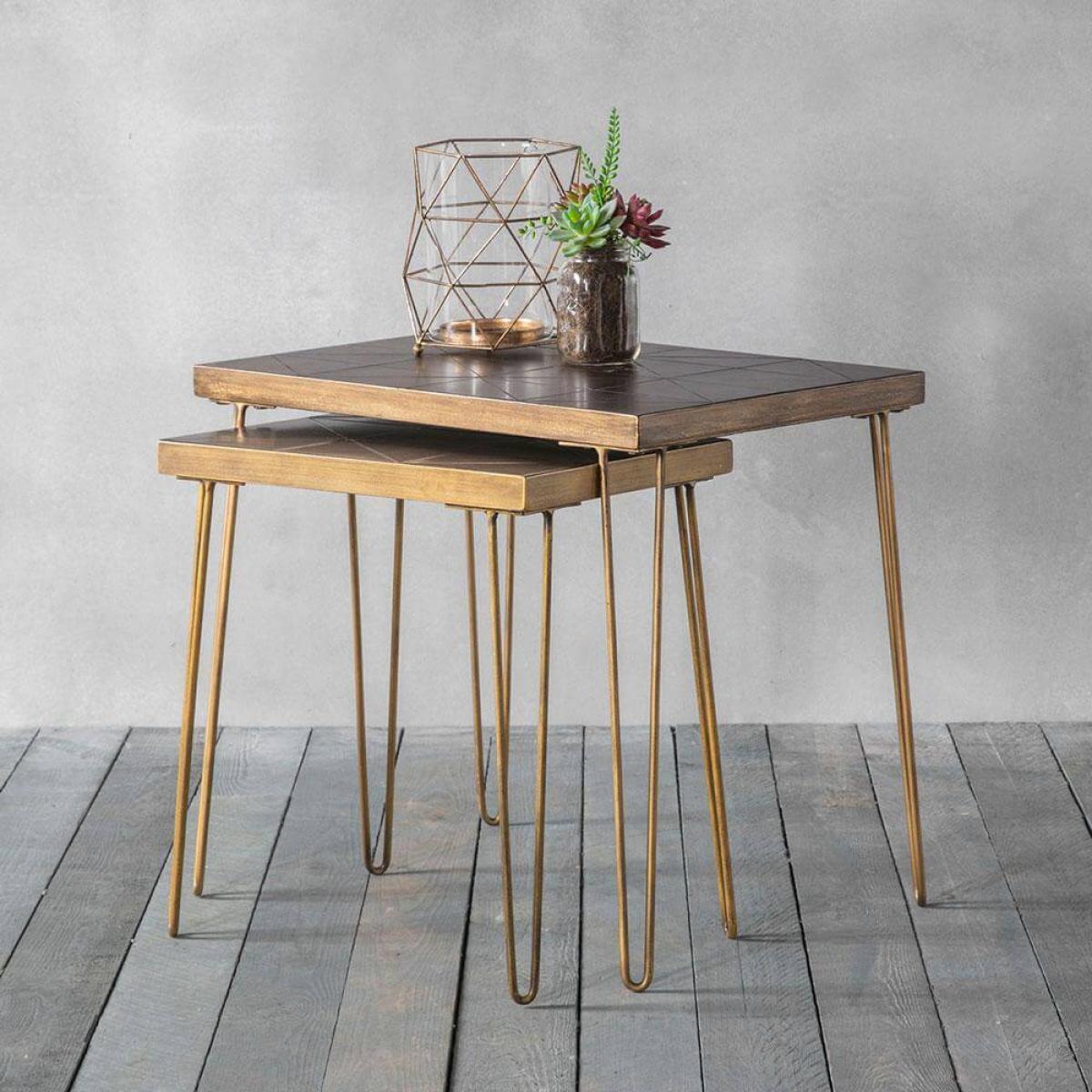 The bronze fire-glazed tiled top of these two small Canopy tables isa real show stopper with its geometric design. Add in the narrow V shaped legs in brushed bronze and you have a set of two contemporary and sleek tables, that nest neatly together and would look stylish amongst any home decor.