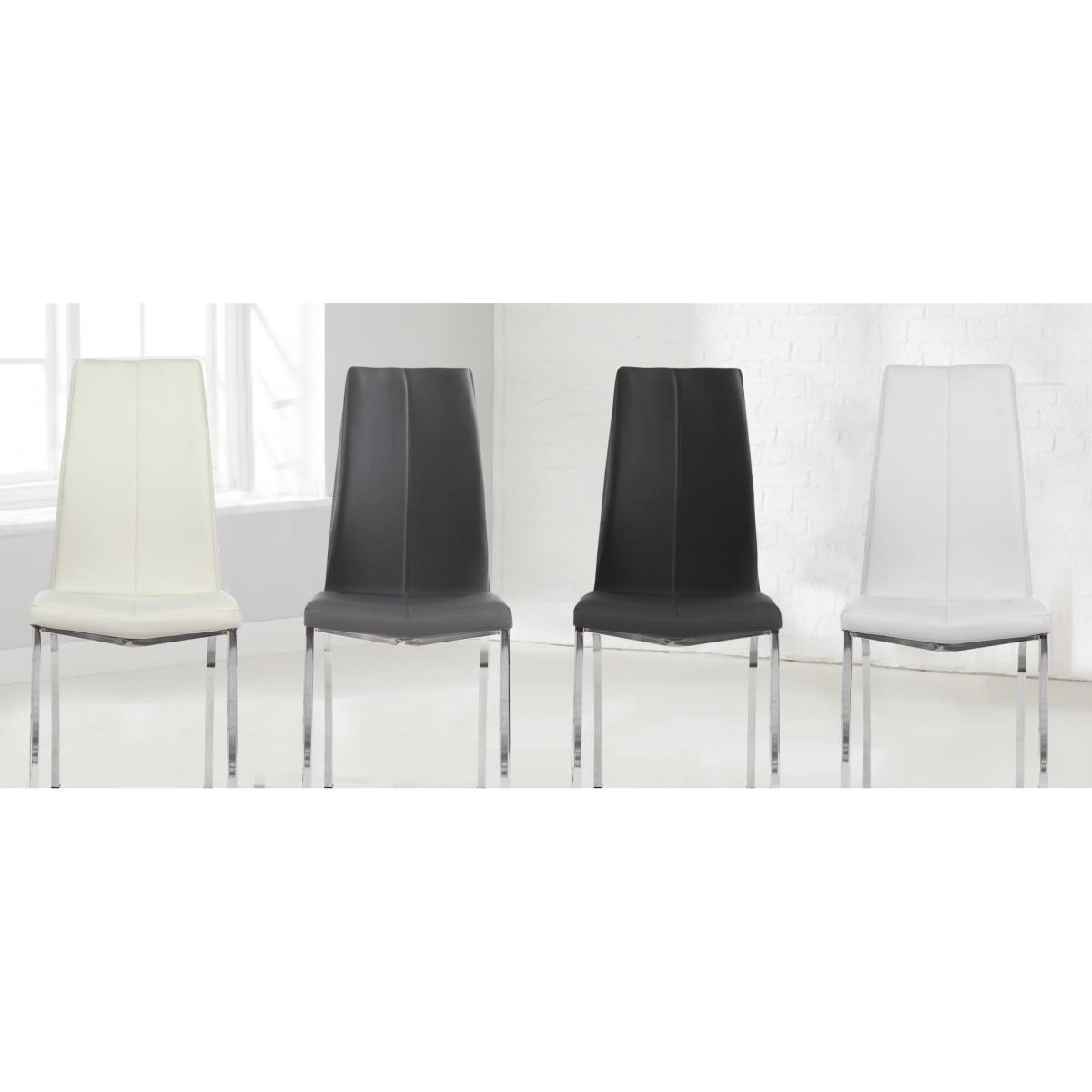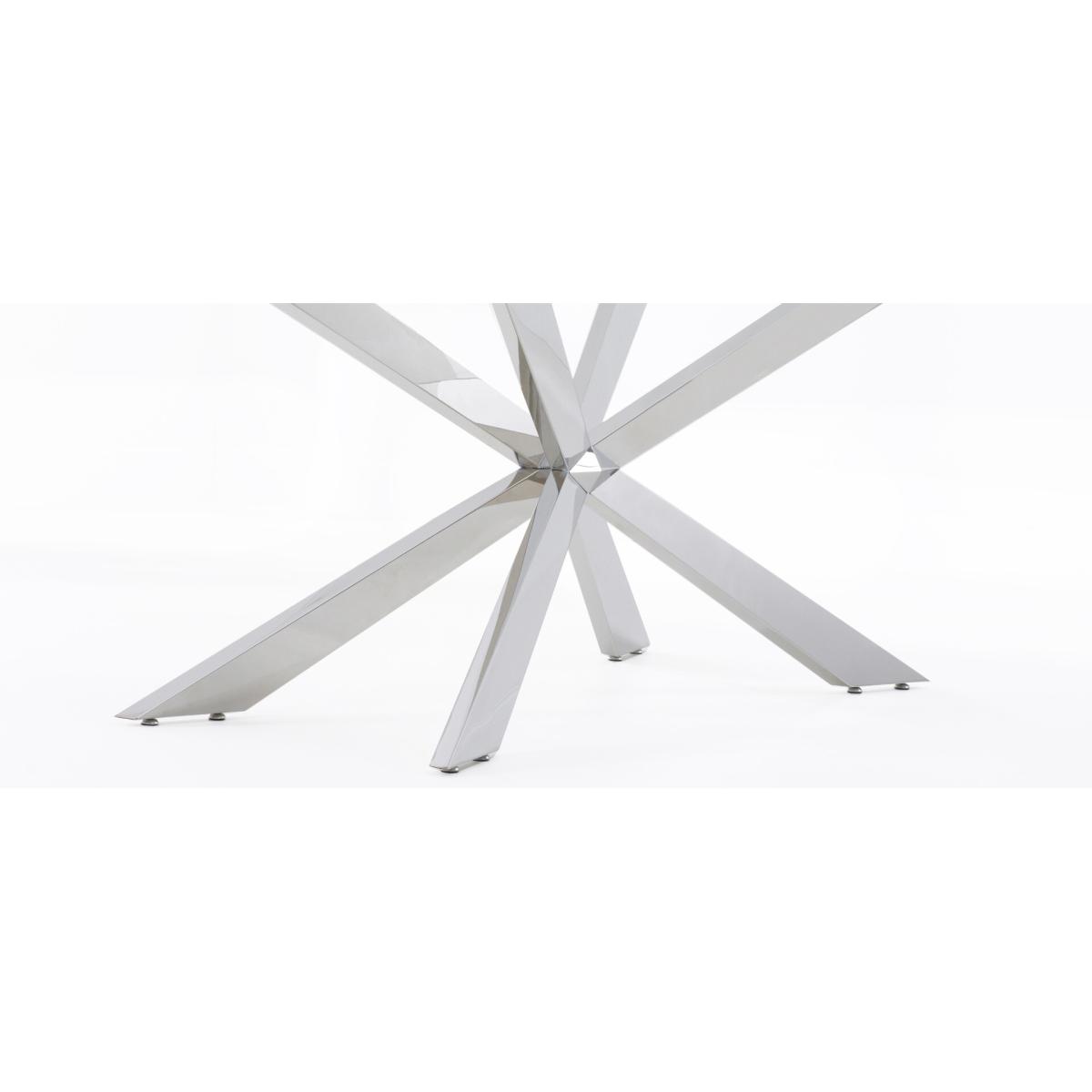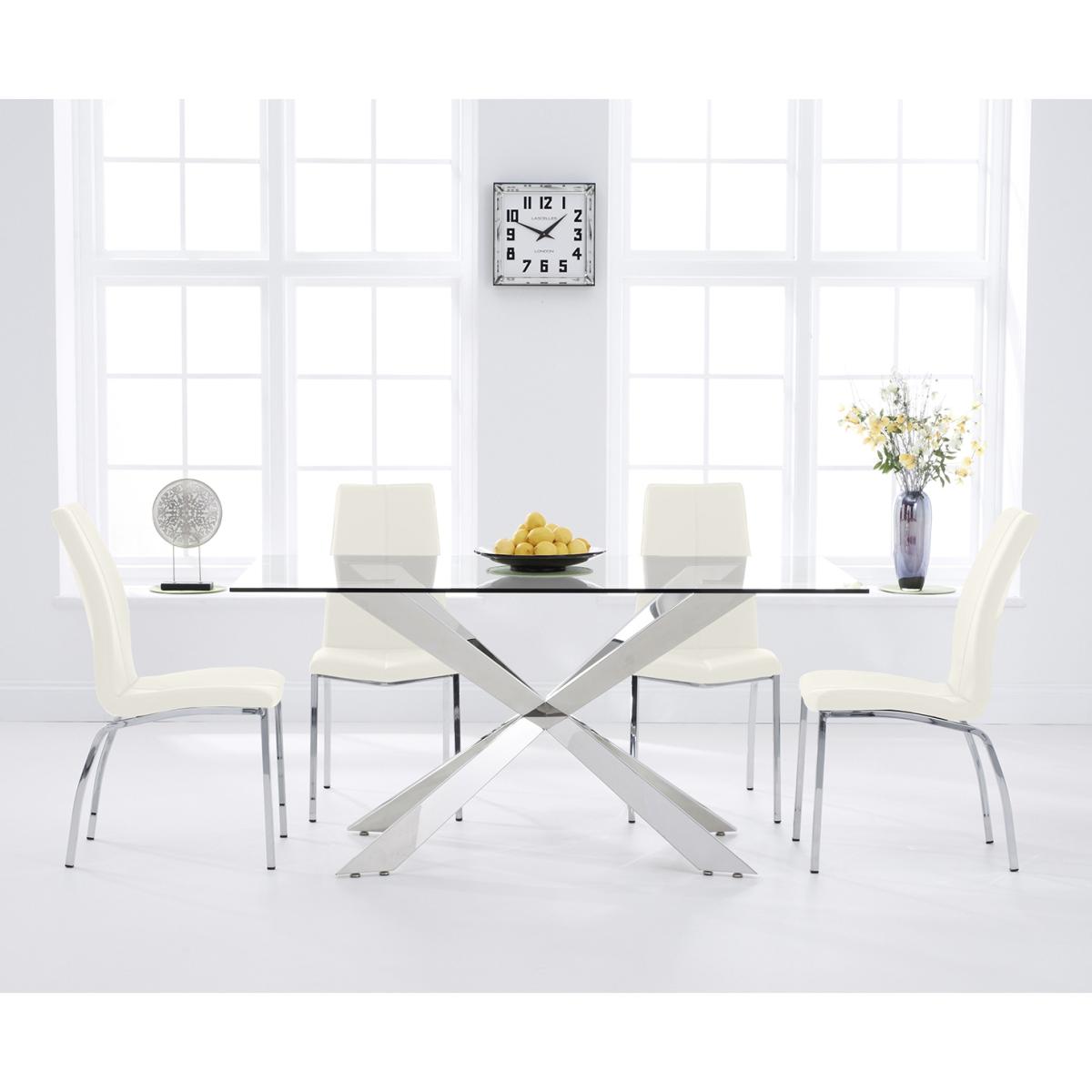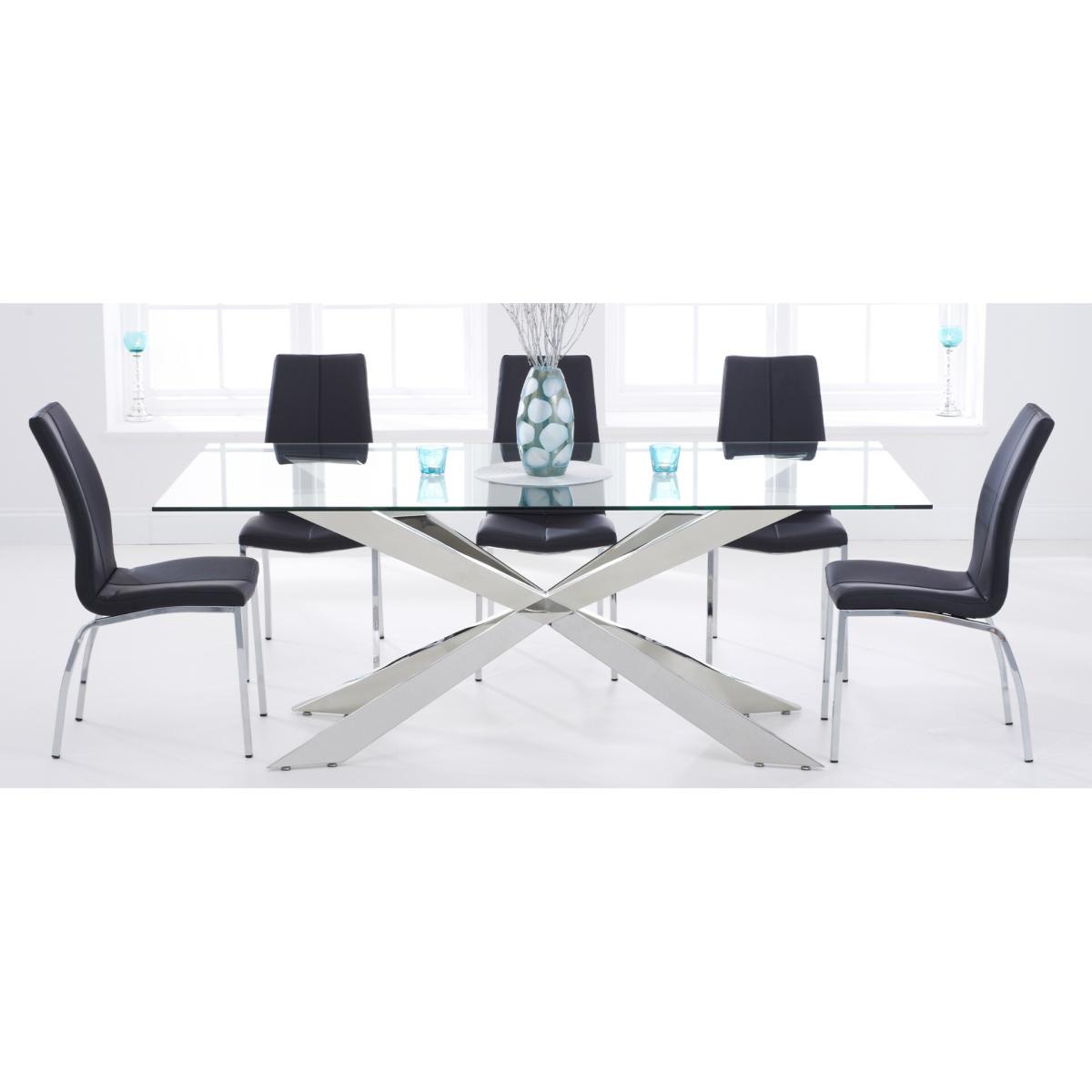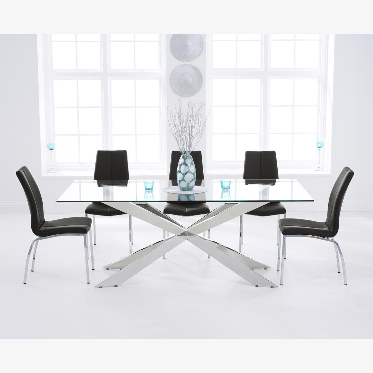 The Canova 200cm Glass Dining Table with Marco Chairs is a large modern dining set with a striking glass and metal table matched with faux leather chairs.