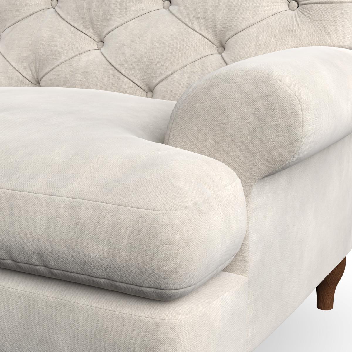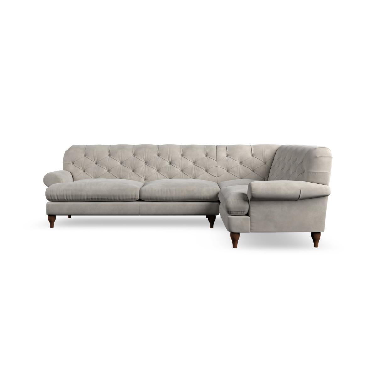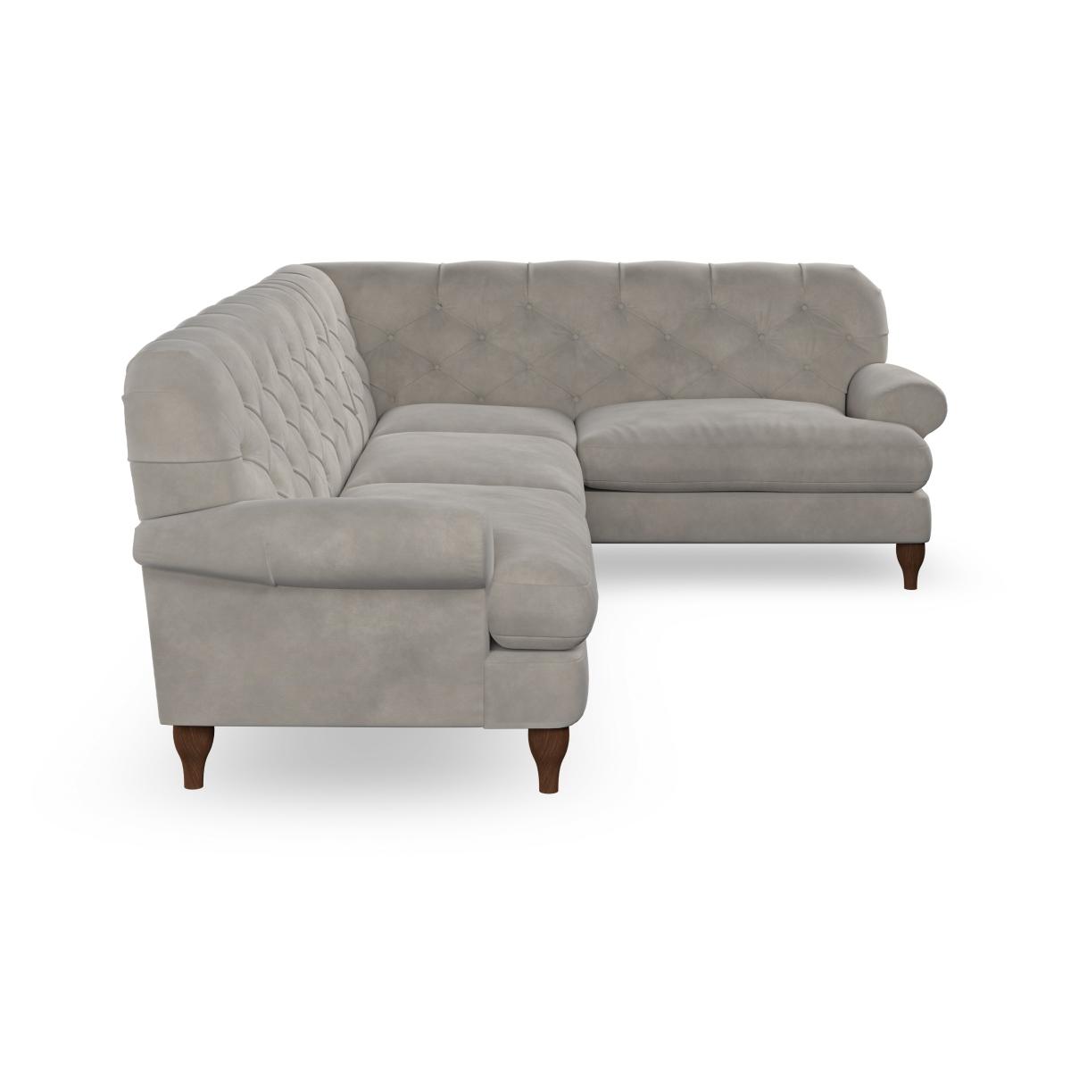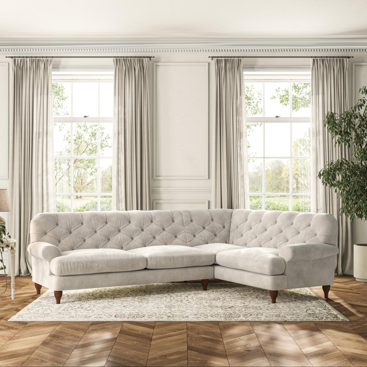 * Chesterfield style * Deep button detail * Scroll arms * Serpentine seat springs * Choose your support, fabric and leg colour This sofa boasts a high, supportive back and elegant compact scroll arms, providing both style and comfort. The serpentine seat springs and superloop sprung back ensure lasting durability and support. Choose between a low-maintenance foam seat or the inviting ‘Qualofill Blue’ fibre seat, crafted from 100% recycled polyester. The ‘T’ cushion seat and arm design offer a compact and contemporary look, enhanced by self-sewn seat cushions. Available as a right or left-handed corner group, this sofa also features ‘hour glass’ shaped turned hardwood legs in two finishes, which are easy to fit. Made to order, this sofa can be tailored to your exact preferences, offering a wide selection of colours, fabrics, foot types, and fillings for a truly personalised and comfortable piece.