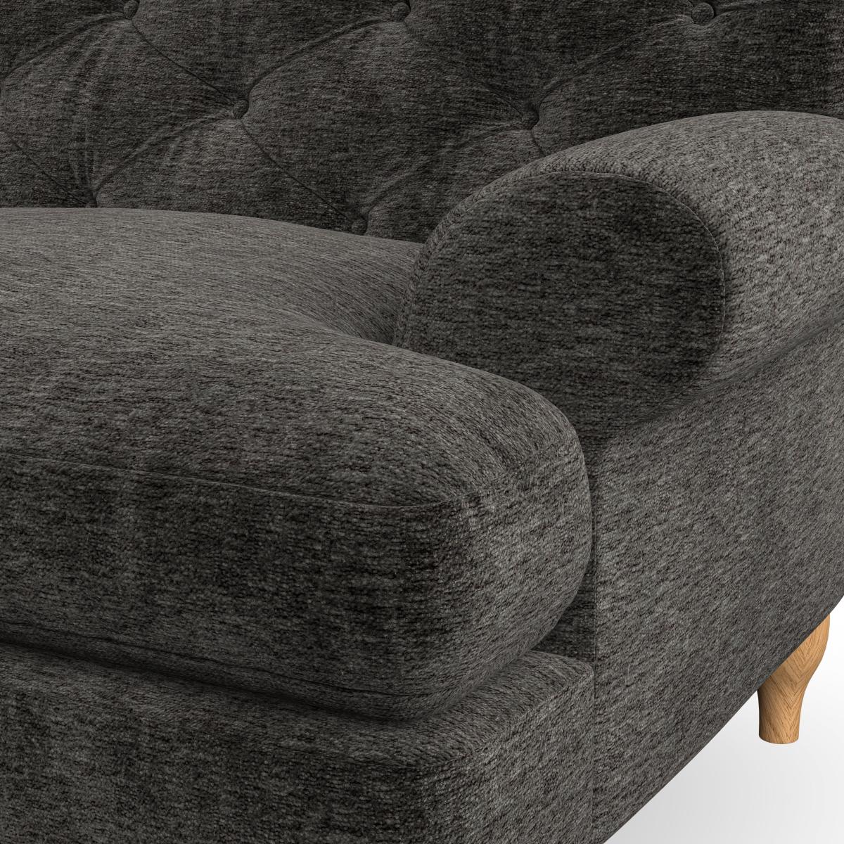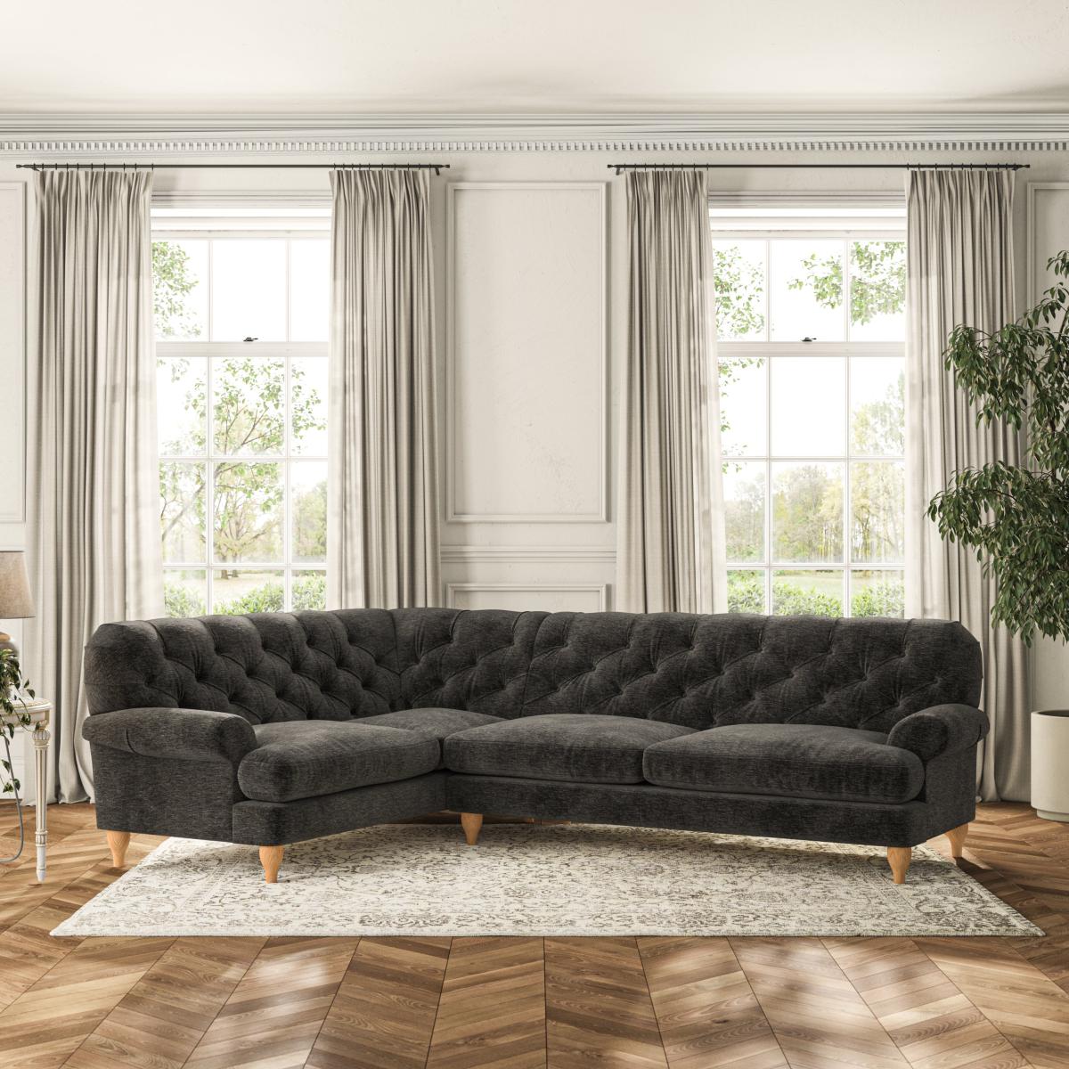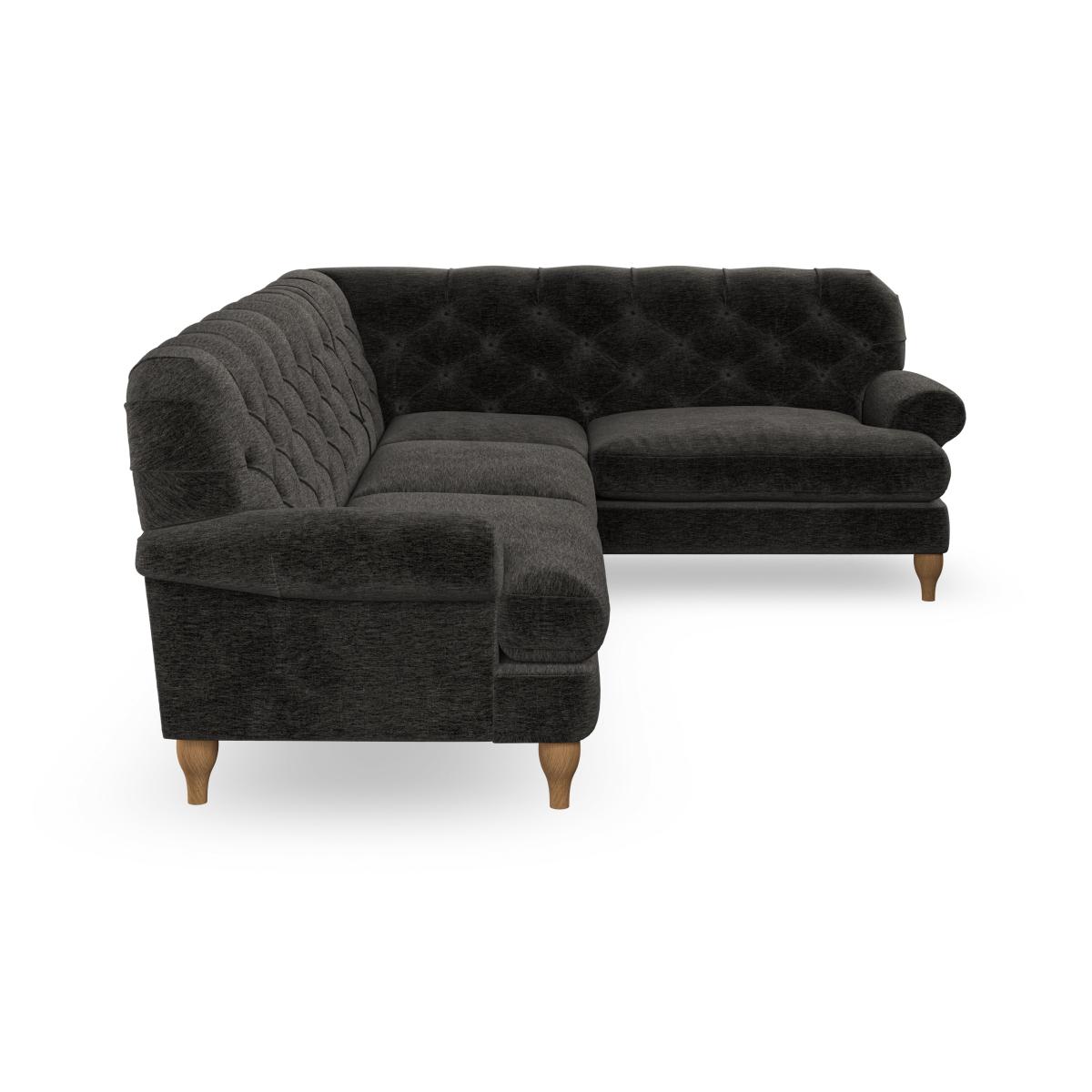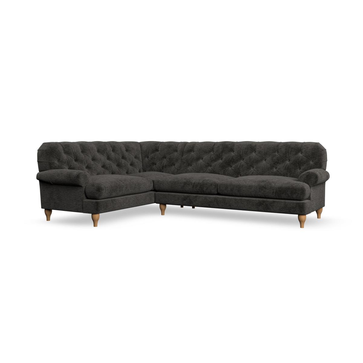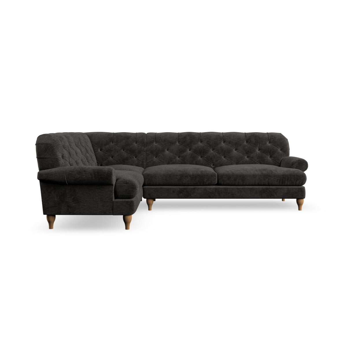 * Chesterfield style * Deep button detail * Scroll arms * Serpentine seat springs * Choose your support, fabric and leg colour This sofa boasts a high, supportive back and elegant compact scroll arms, providing both style and comfort. The serpentine seat springs and superloop sprung back ensure lasting durability and support. Choose between a low-maintenance foam seat or the inviting ‘Qualofill Blue’ fibre seat, crafted from 100% recycled polyester. The ‘T’ cushion seat and arm design offer a compact and contemporary look, enhanced by self-sewn seat cushions. Available as a right or left-handed corner group, this sofa also features ‘hour glass’ shaped turned hardwood legs in two finishes, which are easy to fit. Made to order, this sofa can be tailored to your exact preferences, offering a wide selection of colours, fabrics, foot types, and fillings for a truly personalised and comfortable piece.