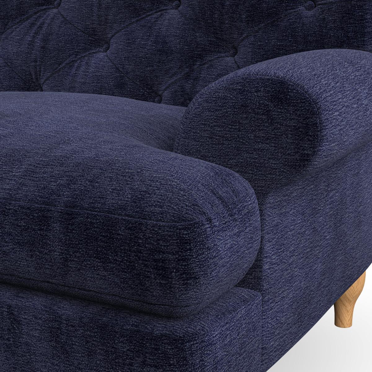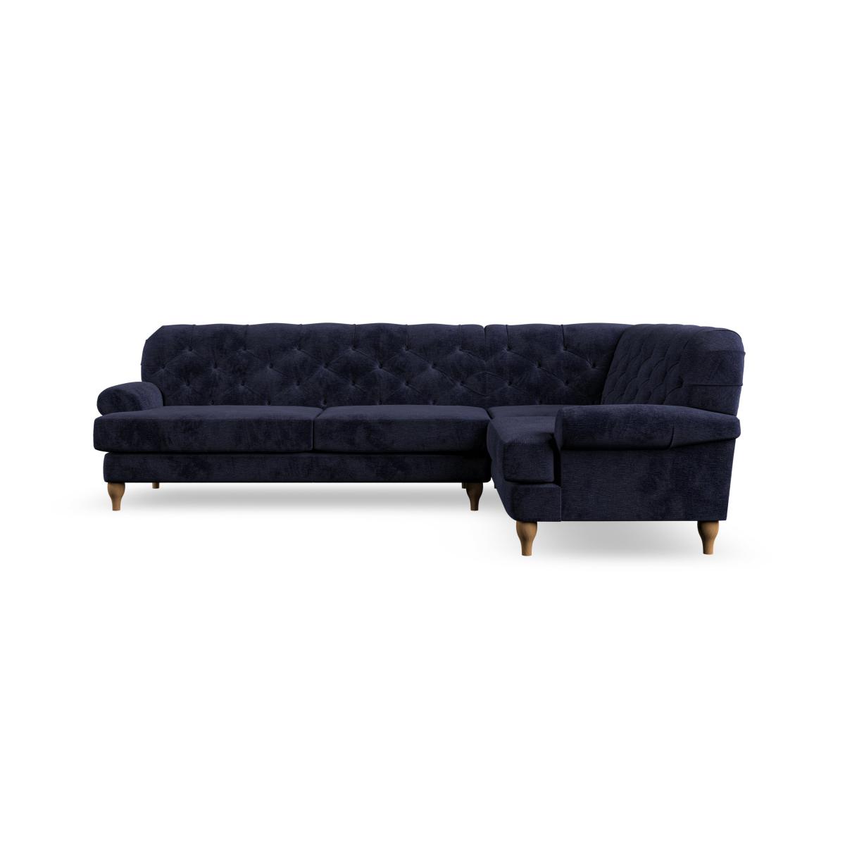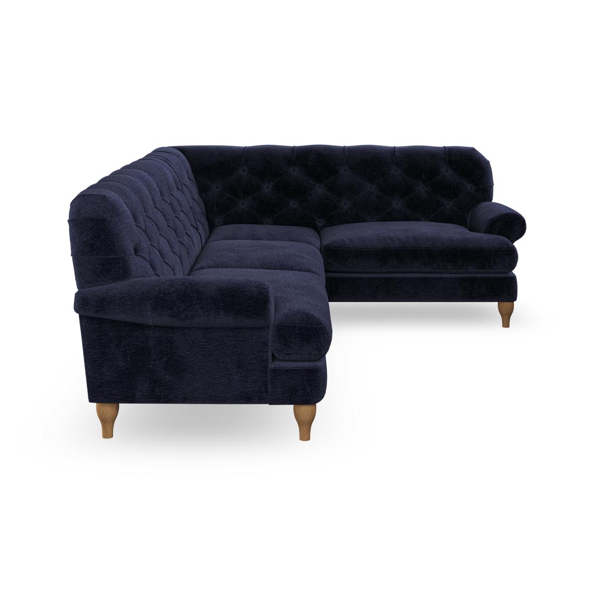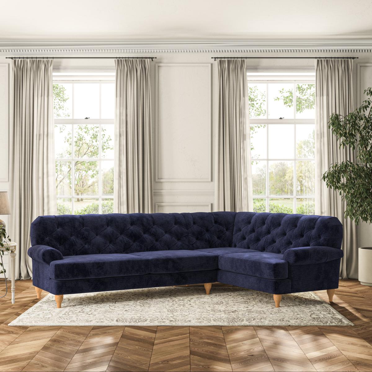 * Chesterfield style * Deep button detail * Scroll arms * Serpentine seat springs * Choose your support, fabric and leg colour This sofa boasts a high, supportive back and elegant compact scroll arms, providing both style and comfort. The serpentine seat springs and superloop sprung back ensure lasting durability and support. Choose between a low-maintenance foam seat or the inviting ‘Qualofill Blue’ fibre seat, crafted from 100% recycled polyester. The ‘T’ cushion seat and arm design offer a compact and contemporary look, enhanced by self-sewn seat cushions. Available as a right or left-handed corner group, this sofa also features ‘hour glass’ shaped turned hardwood legs in two finishes, which are easy to fit. Made to order, this sofa can be tailored to your exact preferences, offering a wide selection of colours, fabrics, foot types, and fillings for a truly personalised and comfortable piece.