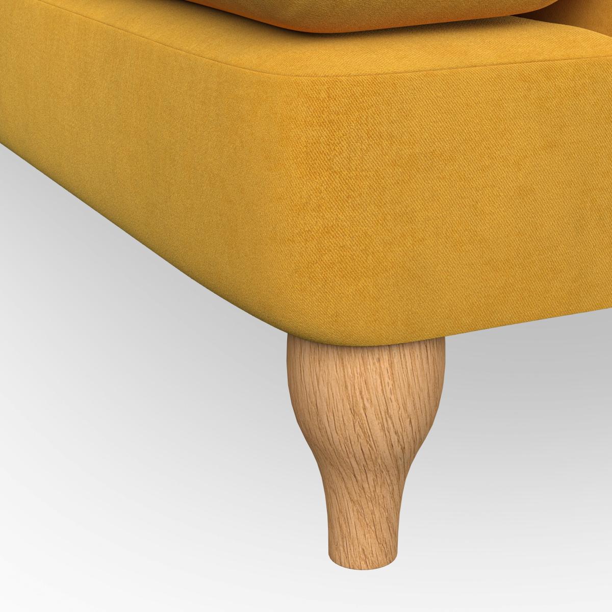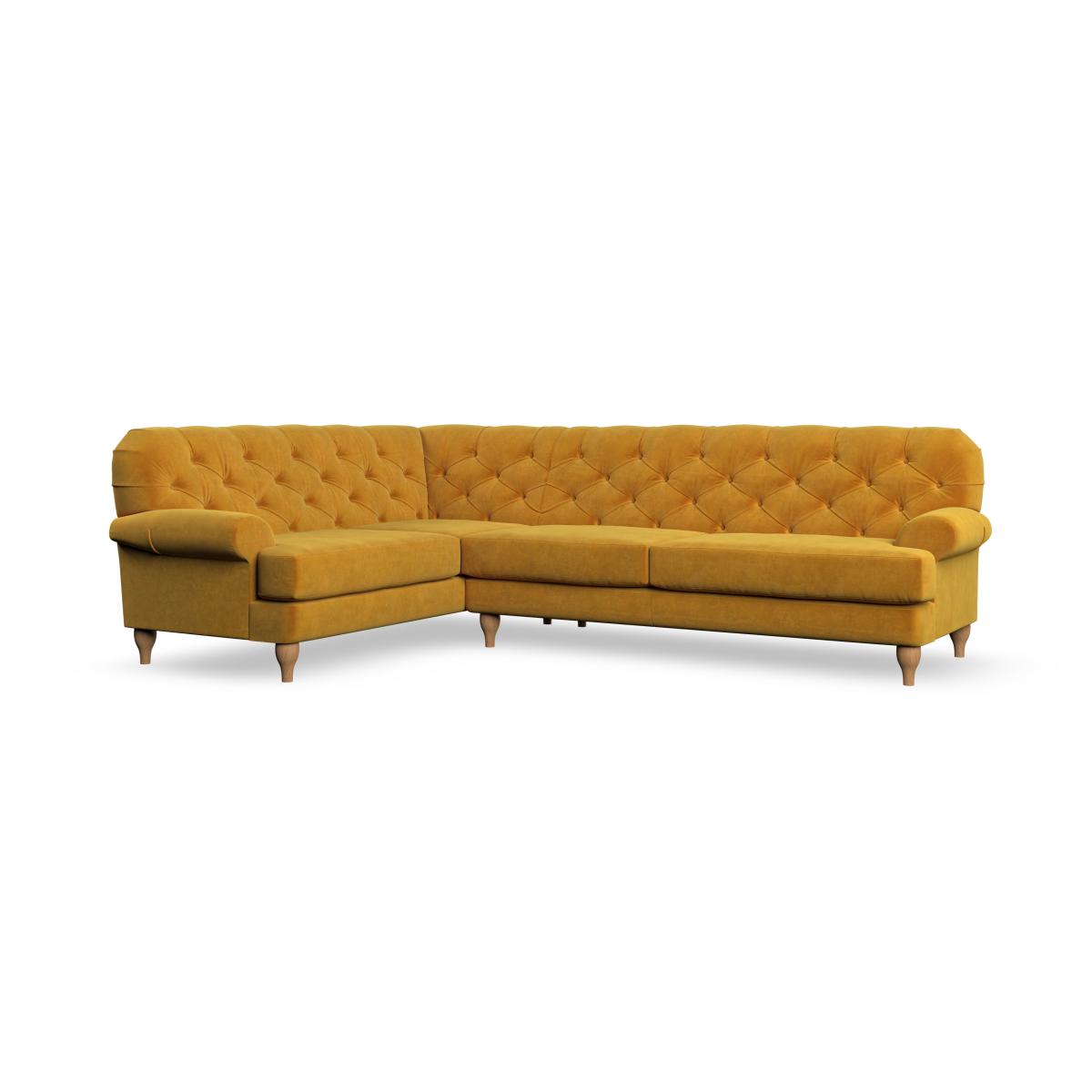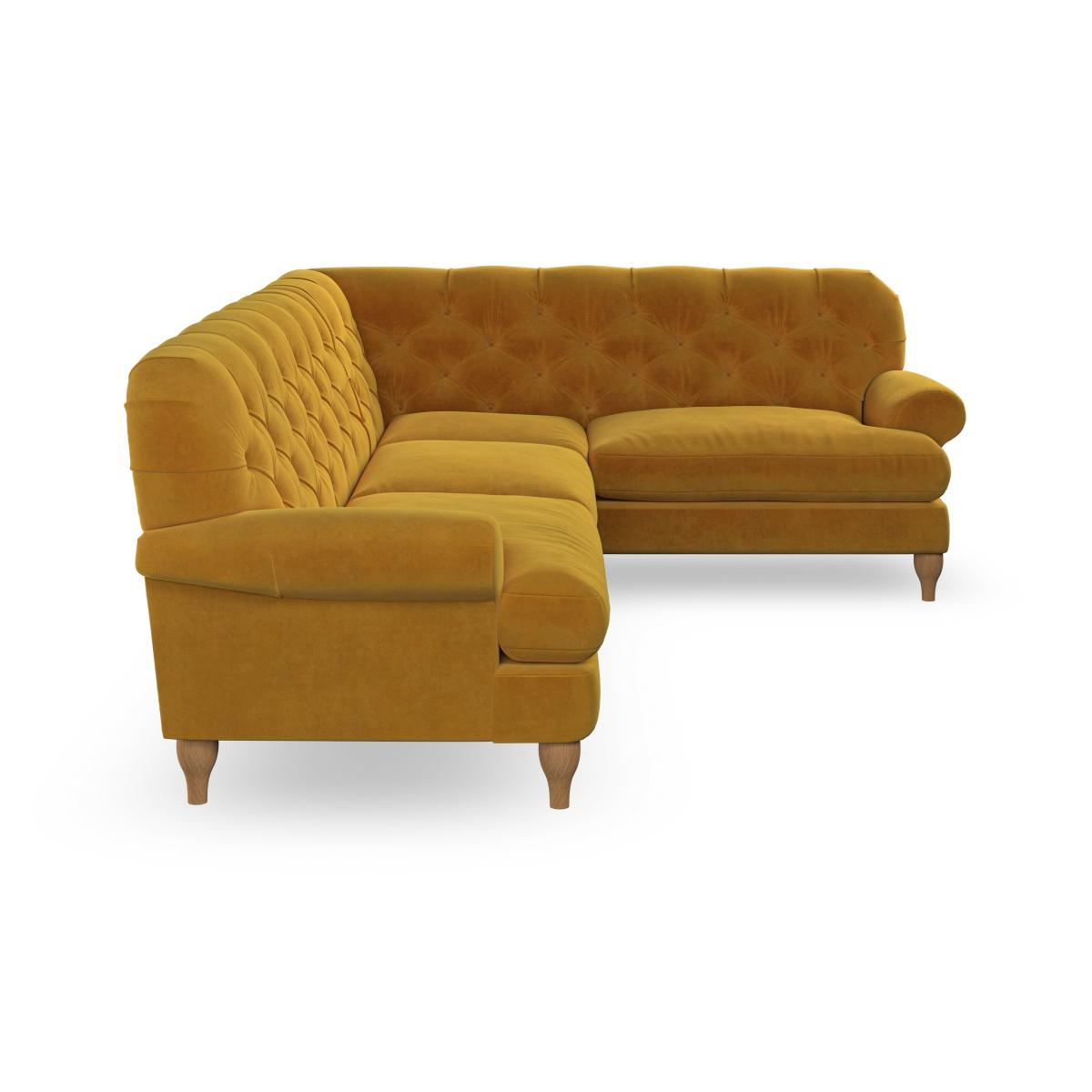 * Chesterfield style * Deep button detail * Scroll arms * Serpentine seat springs * Choose your support, fabric and leg colour This sofa boasts a high, supportive back and elegant compact scroll arms, providing both style and comfort. The serpentine seat springs and superloop sprung back ensure lasting durability and support. Choose between a low-maintenance foam seat or the inviting ‘Qualofill Blue’ fibre seat, crafted from 100% recycled polyester. The ‘T’ cushion seat and arm design offer a compact and contemporary look, enhanced by self-sewn seat cushions. Available as a right or left-handed corner group, this sofa also features ‘hour glass’ shaped turned hardwood legs in two finishes, which are easy to fit. Made to order, this sofa can be tailored to your exact preferences, offering a wide selection of colours, fabrics, foot types, and fillings for a truly personalised and comfortable piece.