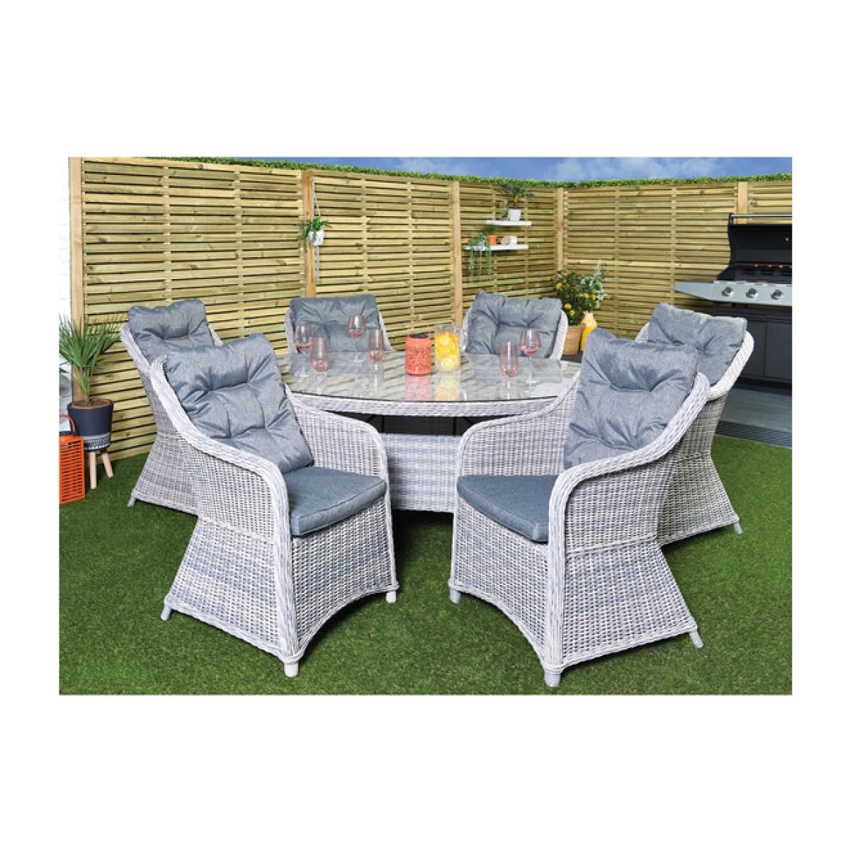 A large patio dining set with a circular table, the Canterbury 7 Piece Dining Set is ideal for socialising with your friends and family in the summer months. With subtle angled, high-back chairs, you can lean back and feel the sun on your face, feeling grand and elegant thanks to the stand-out design of blocks and curves. The round table features a tempered glass top, which is ideally durable for being kept outside. With a classic rattan design wrapped around each piece, this set will remain attractive and low maintenance.