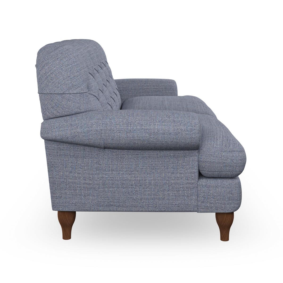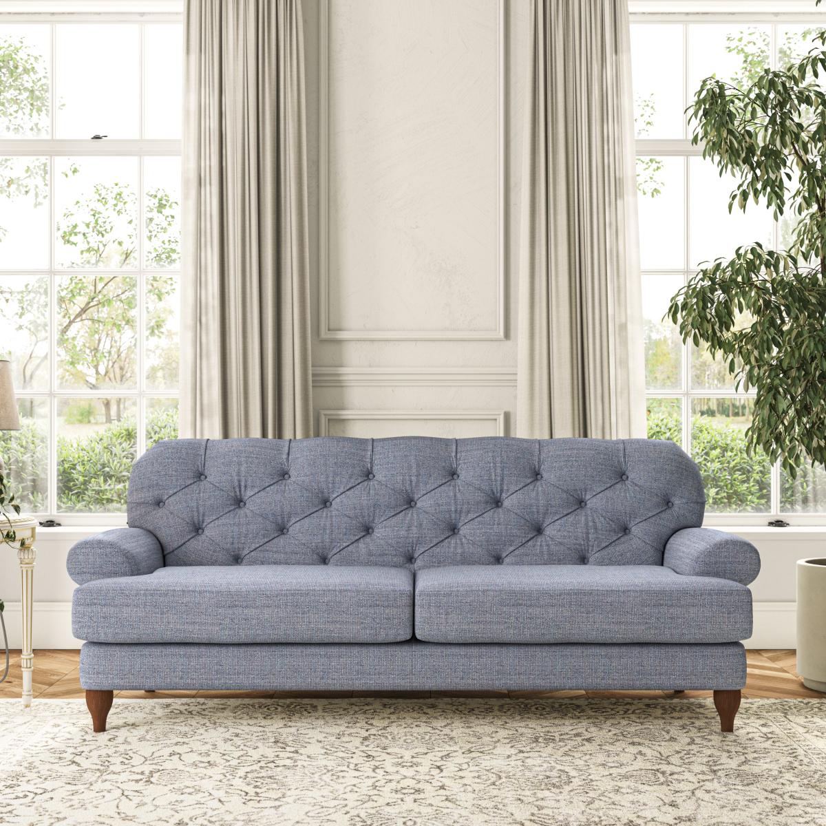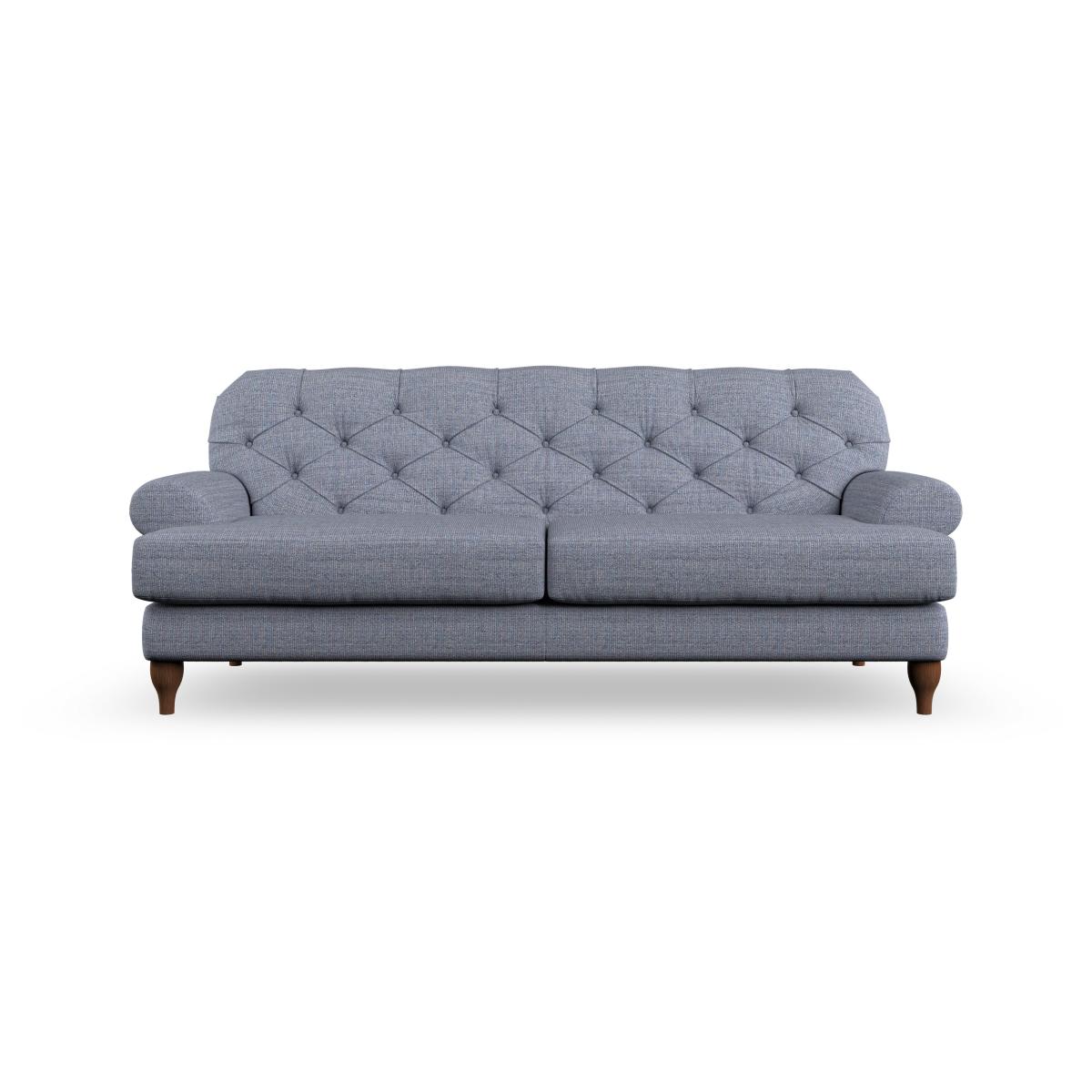 * Chesterfield style* Deep button detail* Scroll arms* Serpentine seat springs* Choose your support, fabric and leg colour This sofa boasts a high, supportive back and elegant compact scroll arms, providing both style and comfort. The serpentine seat springs and superloop sprung back ensure lasting durability and support. Choose between a low-maintenance foam seat or the inviting ‘Qualofill Blue’ fibre seat, crafted from 100% recycled polyester. The ‘T’ cushion seat and arm design offer a compact and contemporary look, enhanced by self-sewn seat cushions. This sofa also features ‘hour glass’ shaped turned hardwood legs in two finishes, which are easy to fit. Made to order, this sofa can be tailored to your exact preferences, offering a wide selection of colours, fabrics, foot types, and fillings for a truly personalised and comfortable piece.