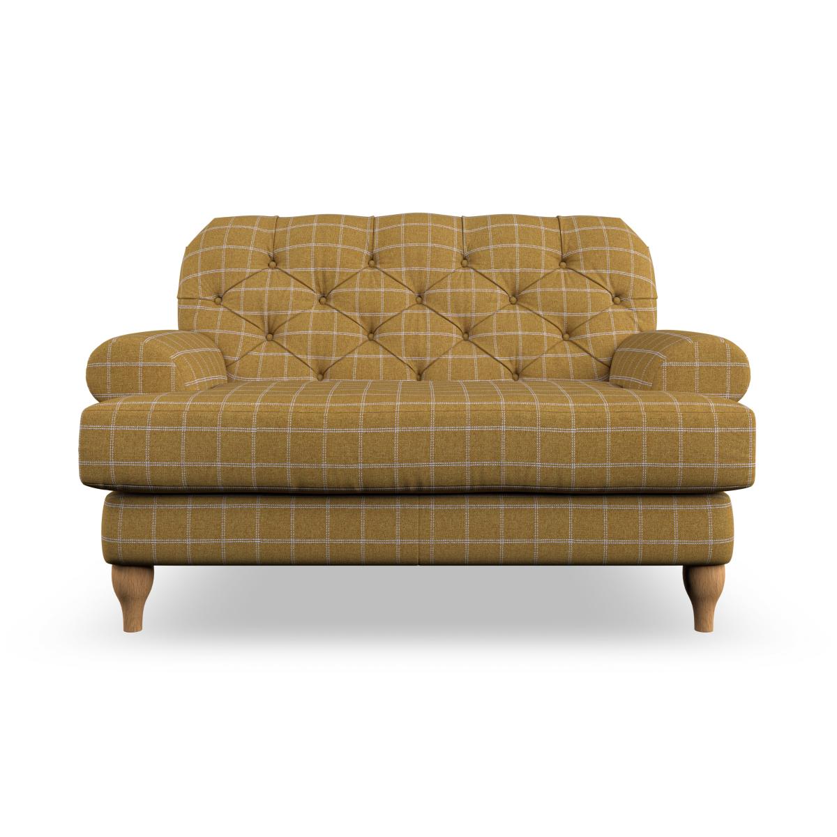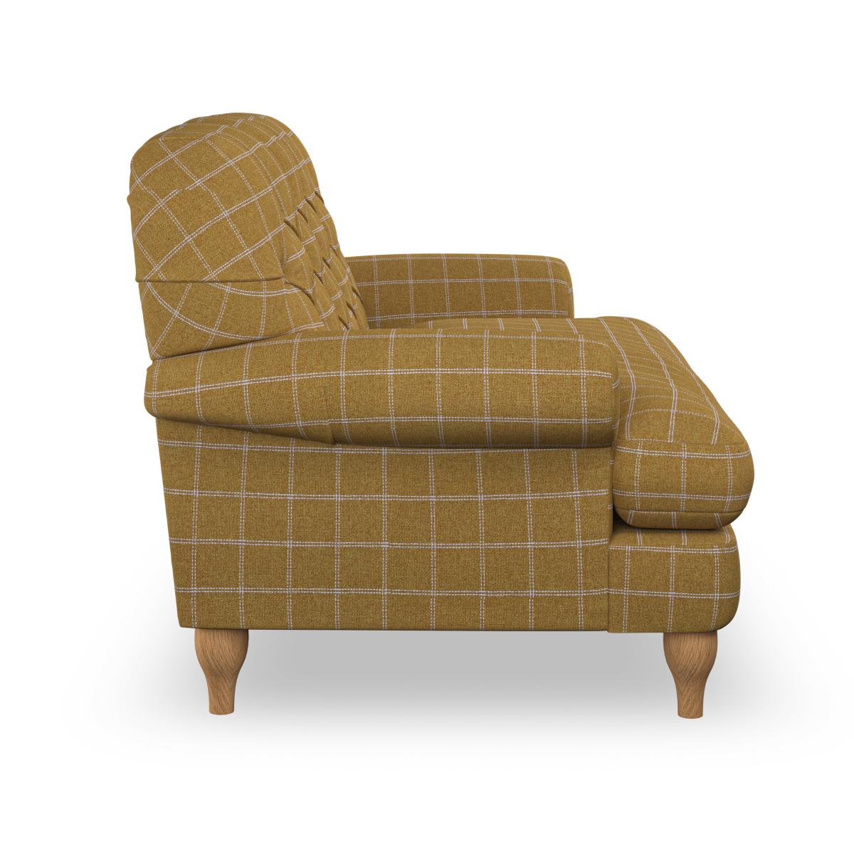 * Chesterfield style * Deep button detail * Scroll arms * Serpentine seat springs * Choose your support, fabric and leg colour This chair offers a fresh perspective on the classic Chesterfield design with its high, supportive back and elegant compact scroll arms. Built for longevity and comfort, it features serpentine seat springs and superloop sprung back support. Choose between a low-maintenance foam seat or the inviting ‘Qualofill Blue’ fibre seat, made from 100% recycled polyester. The ‘T’ cushion seat and arm design ensure a compact and contemporary look, complemented by self-sewn seat cushions. Available with ‘hour glass’ shaped turned hardwood legs in two finishes, this chair is both easy to fit and perfect for creating a snug, stylish corner in your living space. Made to order, this chair can be tailored to your exact preferences, offering a wide selection of colours, fabrics, foot types, and fillings for a truly personalised and comfortable piece.