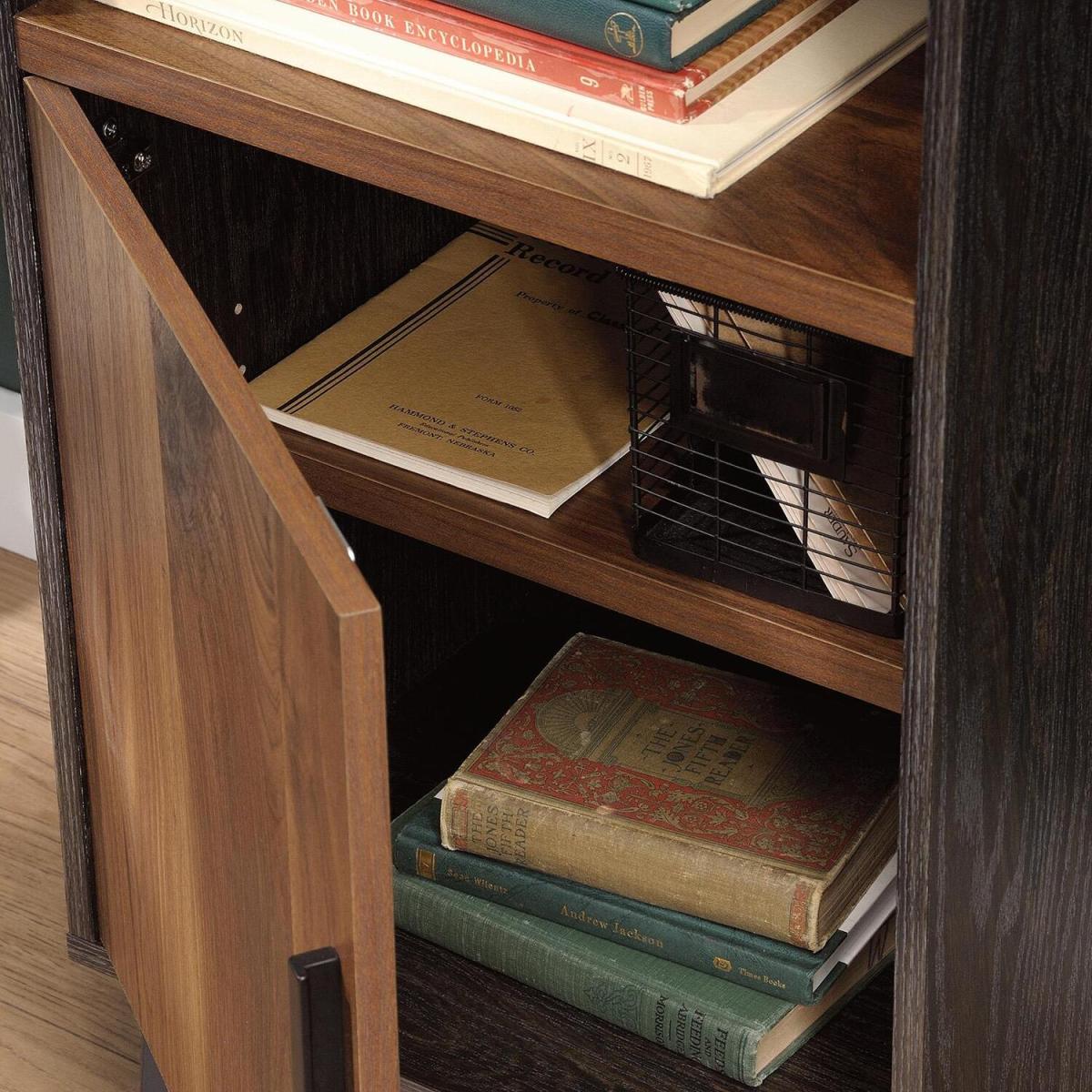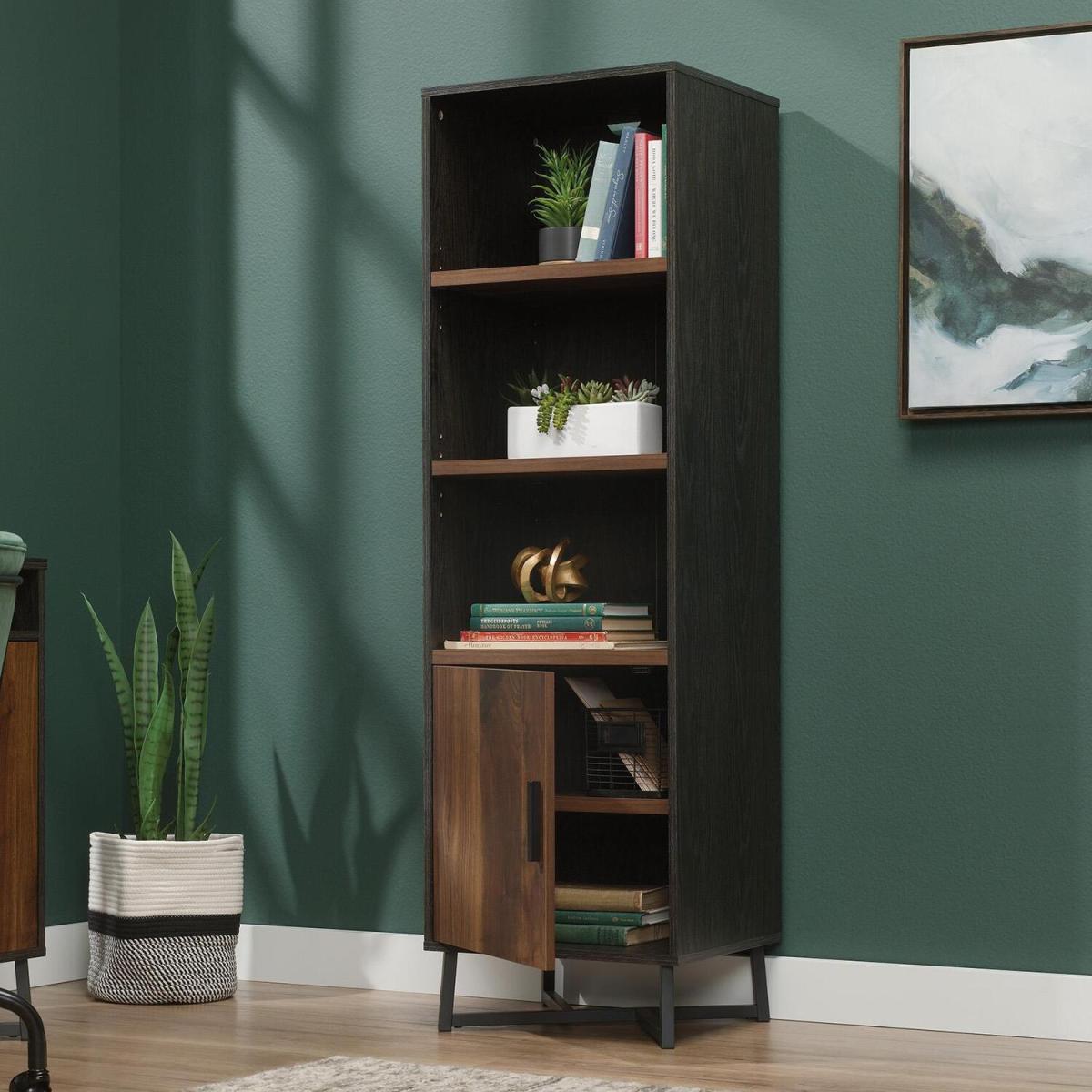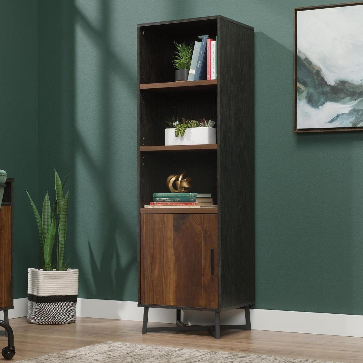 Bookcase with three adjustable shelves in a Brew Oak finish with Grand Walnut accents. The open shelves let you display your favourite books or other items you have around the house. You can find further storage behind door for storing more personal items.