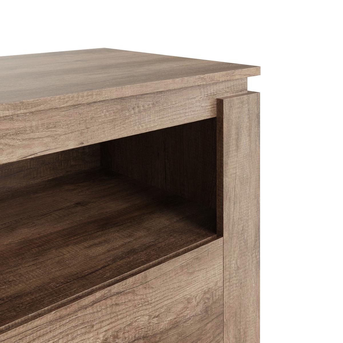 * Wood effect* 2 large drawers* 2 open shelves Designed with a space-saving approach, this tv stand features two open shelves perfect for housing TV boxes or consoles, alongside a cupboard for additional storage. The unit’s realistic wood aesthetic and elegant 3D oak effect finish add a sophisticated touch to any living room.