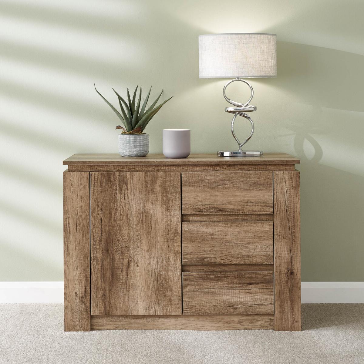 Stuck for space? No worries - this impressive furnishing piece is a storage genie! Don't be fooled by the compact design which incorporates multiple drawer and shelf options, while creating a classic look and feel that will enhance any living space. Perfect for storing everyday dining accessories or as a chic repository for home office essentials. Featuring a slender column of three drawers plus side cupboard - all featuring recessed handles. The unique oak-effect 3D paper foil finish provides a highly realistic wood-style finish that closely mimics oak grain.