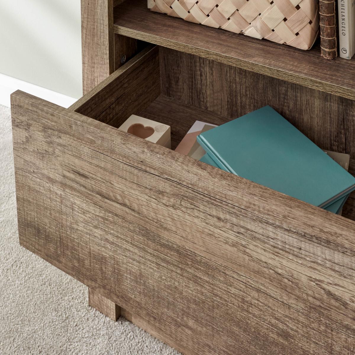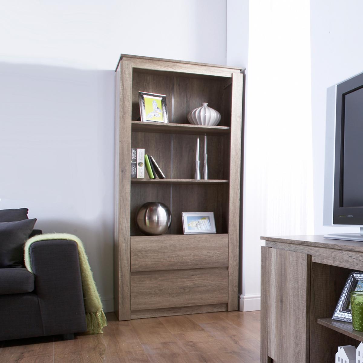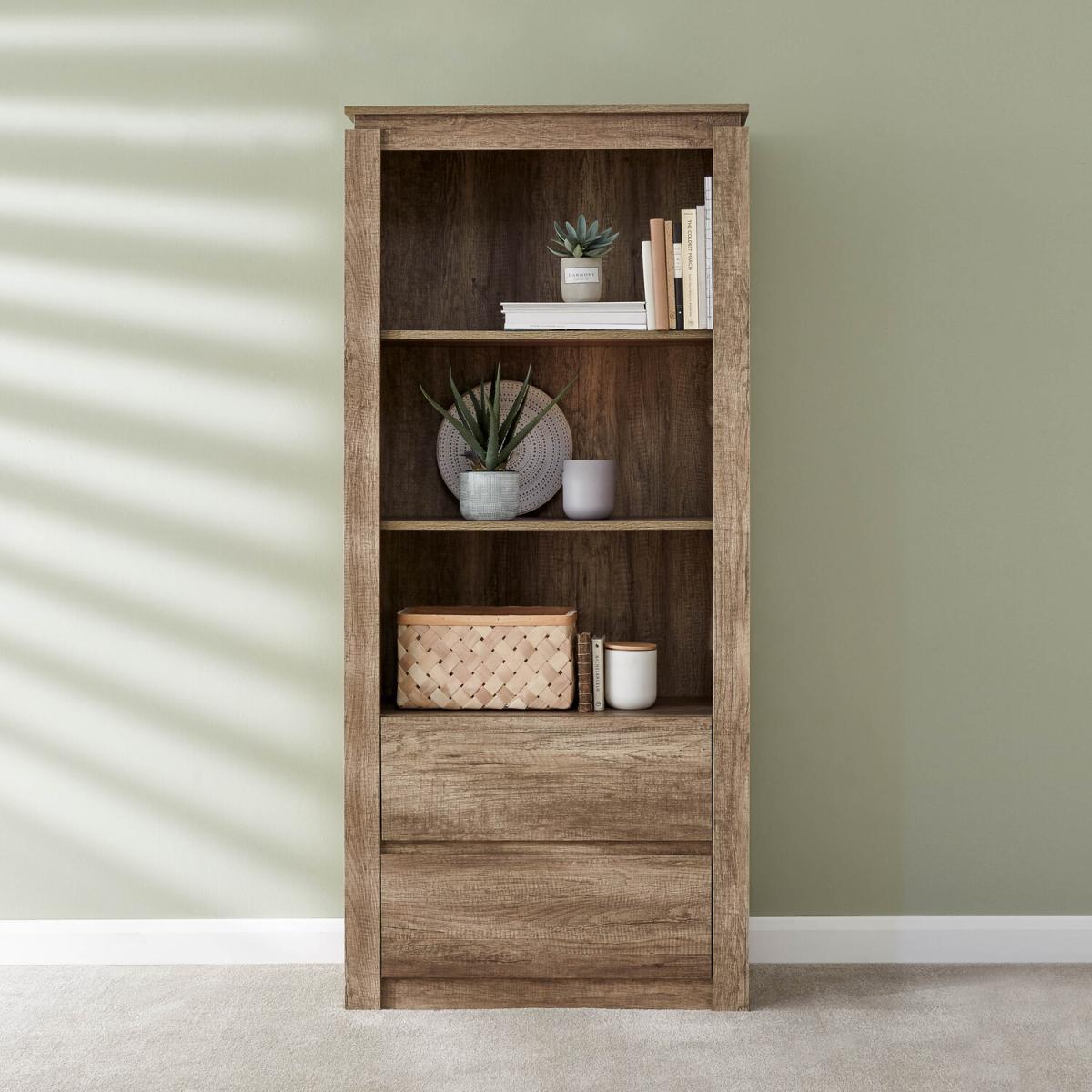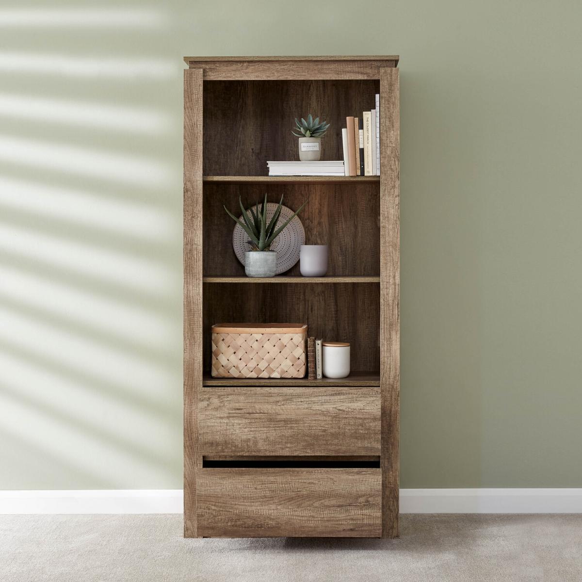 This Canyon Oak Two Drawer Bookcase will add a touch of modern style and effortless practicality to your living room. This attractive piece of furniture will make a great focal point in your room with its gorgeous oak effect veneer. The neutral yet sophisticated colours blend seamlessly into any interior decorative style and will make a beautiful addition to your home. The unit has plenty of storage space - ample room for your knick-knacks of all shapes and sizes. Keep books, ornaments, photos, DVDs and other trinkets on the two spacious shelves.