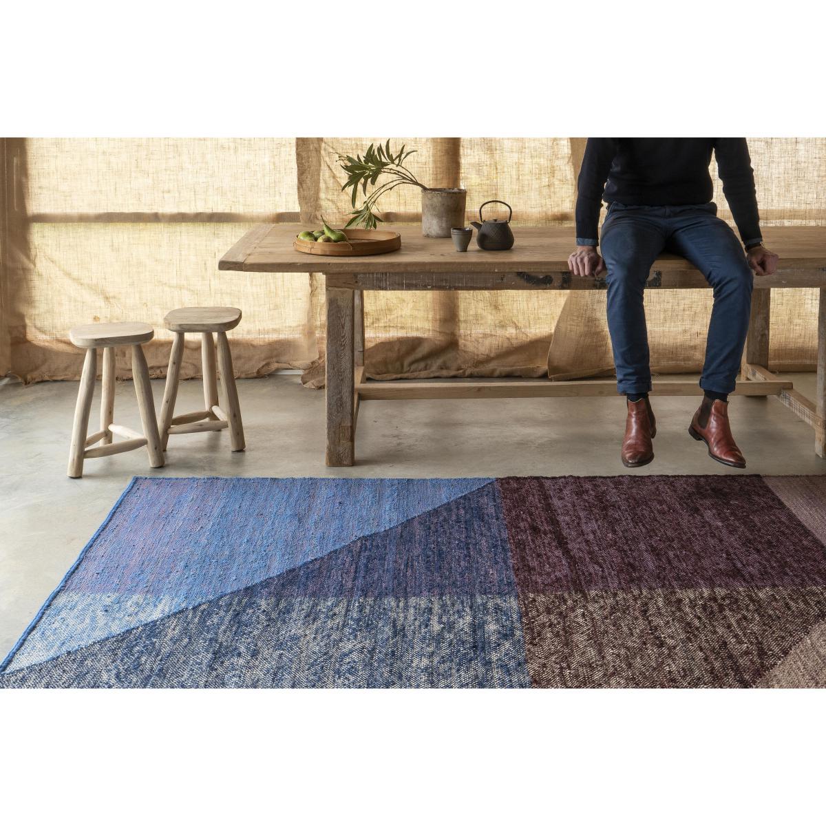 Colourful shadows. The German designer, Mathias Hahn wanted to imitate the effect of shadows on the ground on the Capas rugs. His starting point is that shadows are never black or grey, rather they are full of colours and geometric shapes. The aim of the designer was to therefore create a rug with a casual yet complex style via the use of colours and depth effects. This manifests itself in a rhythmic and dynamic composition with geometric shapes and unstructured contours. Shadow effects are created between the different parts of the rug, with lighter blocks of colour which appear to almost rise up above the others, creating a three-dimensional impression. This collection is the result of a complex manual technical process to achieve the density and fluidity of the desired effect. To be able to make the Capas rugs, Mathias Hahn and Nanimarquina studied the technical features of Kilim weaving in depth looking for new methods to divide colours. After months of research, they developed a new kind of Kilim weaving which was able to combine the colours of the warp and weft (normally, the warp is not visible in kilim). By defining a different density to Kilim with new warp tones, they were, as such, able to get an extremely visual texture in which the colours intertwine and superimpose over one another in a fluid way. This unique texture allows for a great depth and a fascinating effect of shadow and light. Mathias Hahn, on the Capas rug weaving technique: "By loosening the fibres and by using a thicker warp, we made new colours and textures visible for increased depth and improved hues. " Colour is an essential element of the Capas collection. Each rug has a main colour, a complementary tone and its darker hue, which, in the composition give the illusion of a shadow on the ground. These master colours are in harmony with transition shades which create this wonderful fading effect. Whether it was during the hours spent by the creators refining their works to express the current vision, or in the craftspeople's days of weaving, tirelessly updating their ancient techniques while respecting tradition, you find this search for precision which defines the quality of the Nanimarquina rugs.