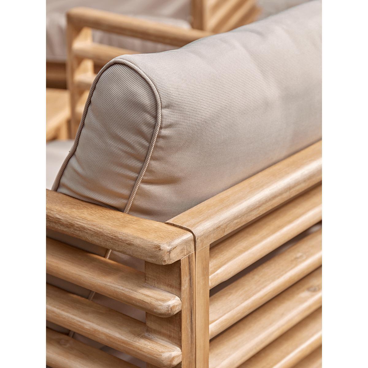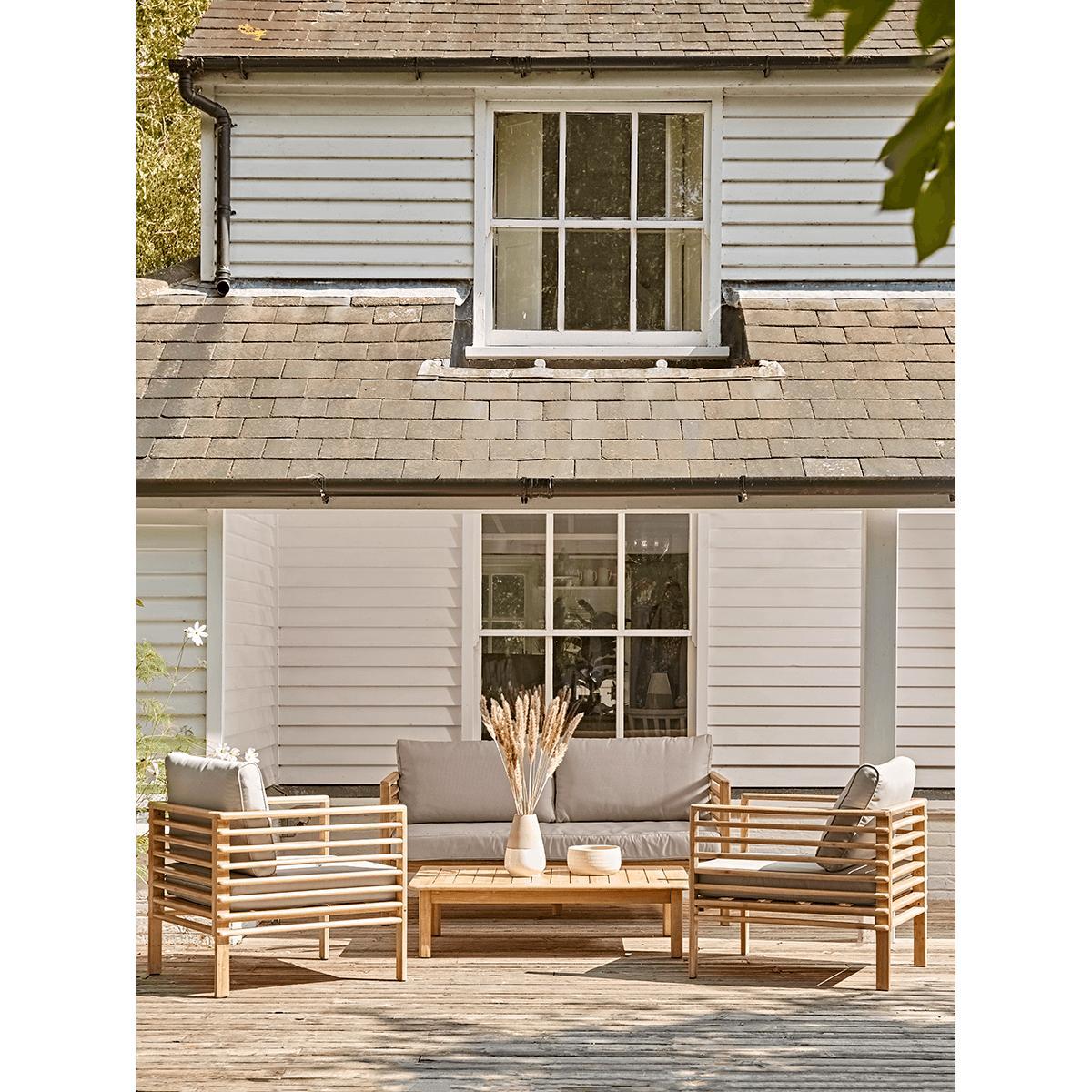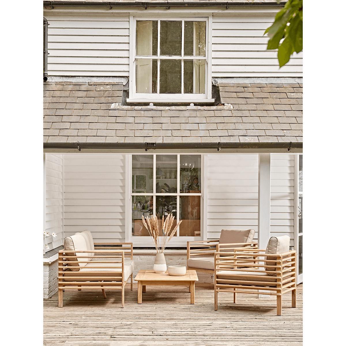 Bring a distinctive mid-century Long Island look to your space with the striking silhouette of our Cape Lounge Set. Comprising of a sofa, two chairs and a table the seating of our Cape Lounge Set has a unique smooth edged slatted appearance, crafted from beautifully toned acacia wood. Sumptuous cushions to the seat and back rest provide lounge comfort and the perfect spot to spend time outdoors.
