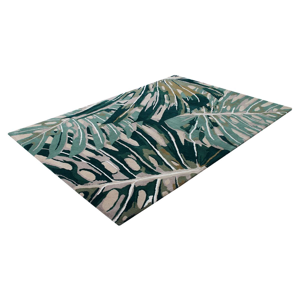 Tropical leaves overlap to create an abstract design in green hues on a neutral base. Hand Tufted 100% Wool. Wool rugs shed fibres during vacuum cleaning and everyday use; this is not a fault but a natural characteristic. Please use only suction type vacuum cleaner as rotating brush vacuum may damage the rug. Spills should be cleaned immediately to help avoid staining- use a clean white absorbent cloth to dab the spillage, avoid scrubbing and chemical cleaners. For deep cleaning use a professional carpet cleaning company- do not dry clean or tumble dry. If loose threads appear carefully trim them with scissors.