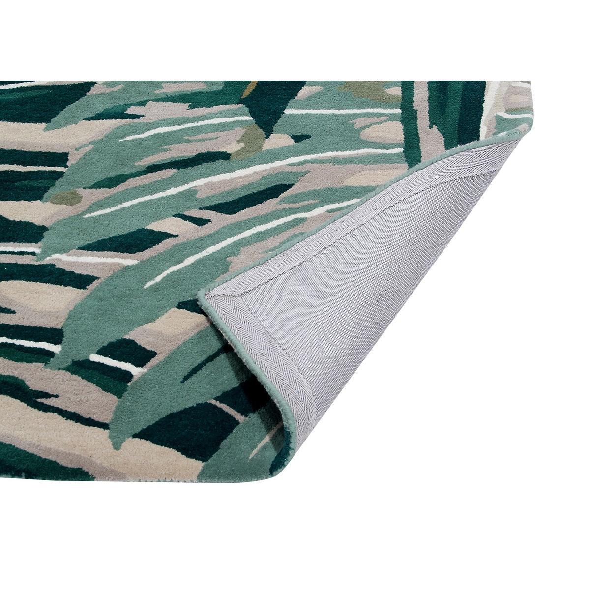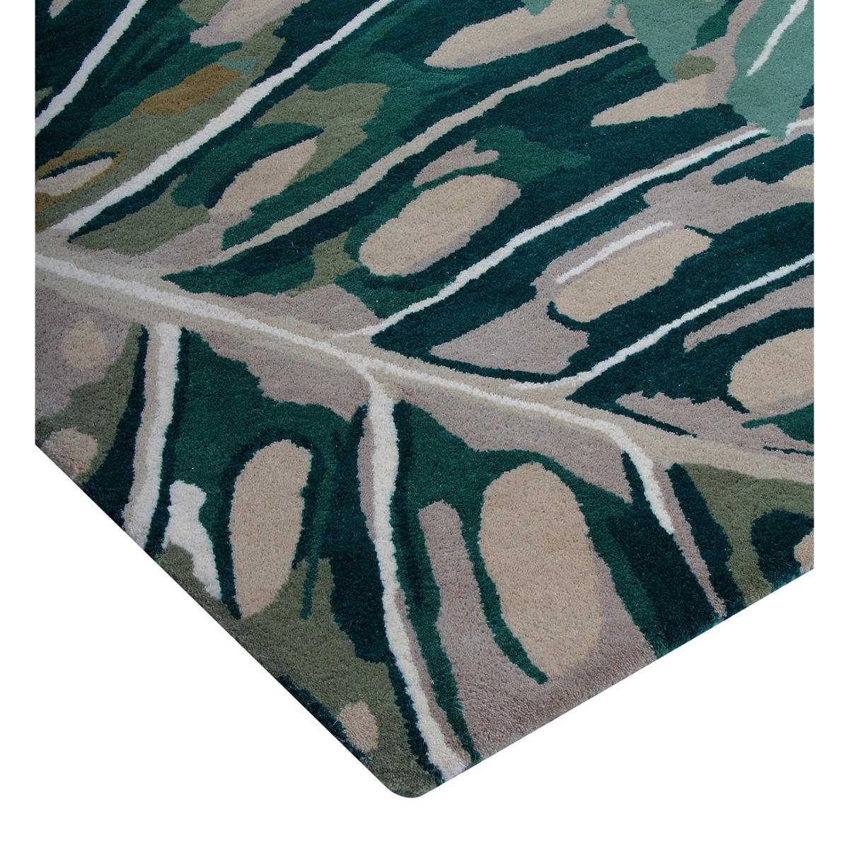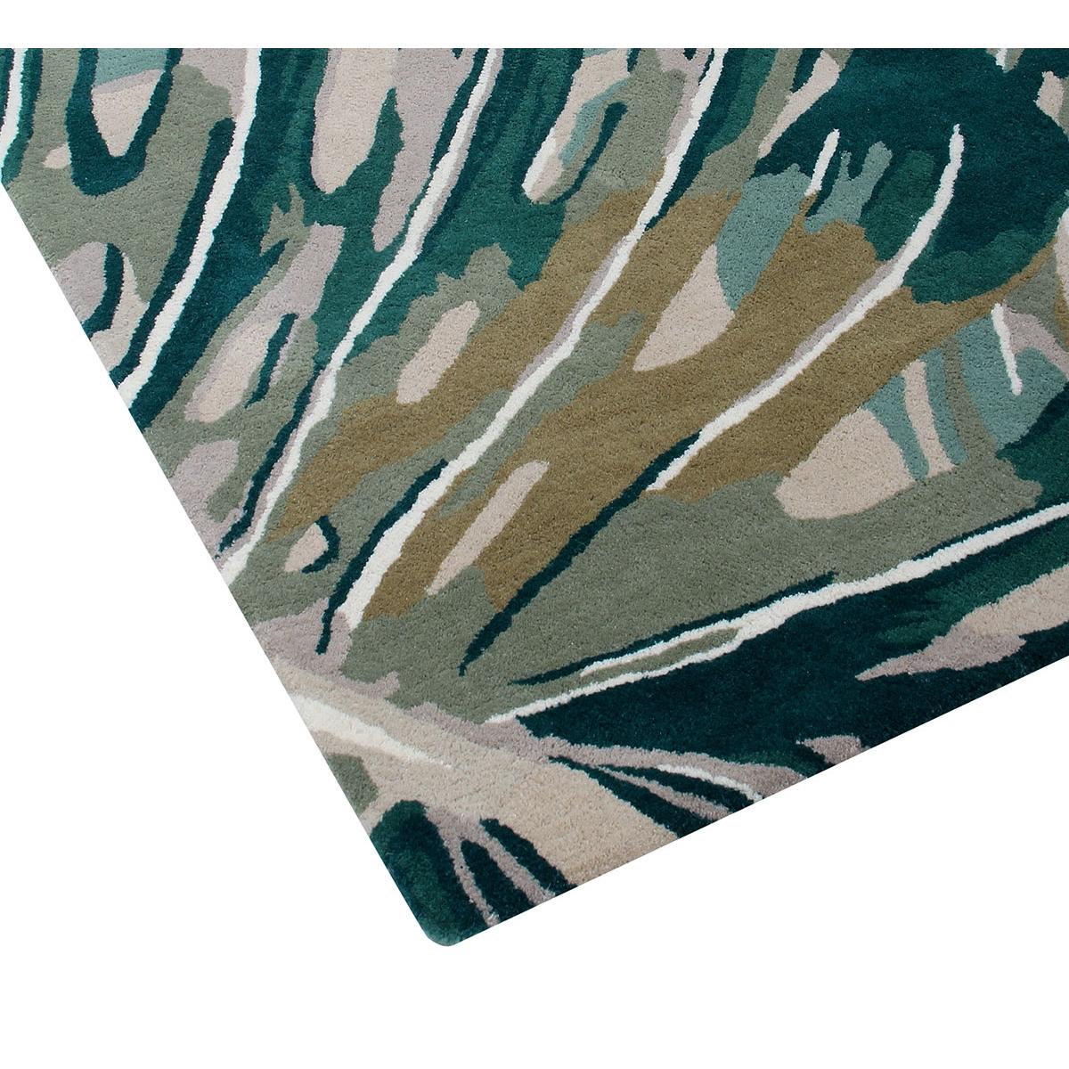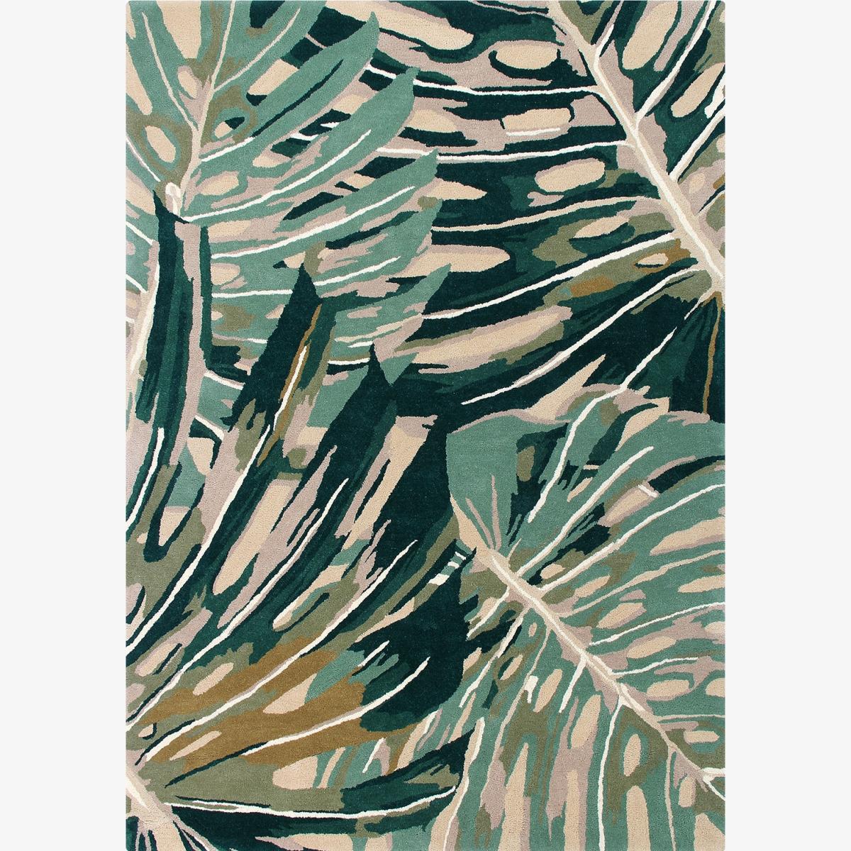 Tropical leaves overlap to create an abstract design in green hues on a neutral base. Hand Tufted 100% Wool. Wool rugs shed fibres during vacuum cleaning and everyday use; this is not a fault but a natural characteristic. Please use only suction type vacuum cleaner as rotating brush vacuum may damage the rug. Spills should be cleaned immediately to help avoid staining- use a clean white absorbent cloth to dab the spillage, avoid scrubbing and chemical cleaners. For deep cleaning use a professional carpet cleaning company- do not dry clean or tumble dry. If loose threads appear carefully trim them with scissors.