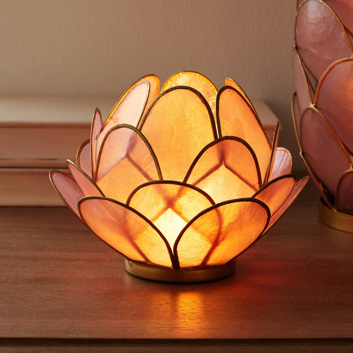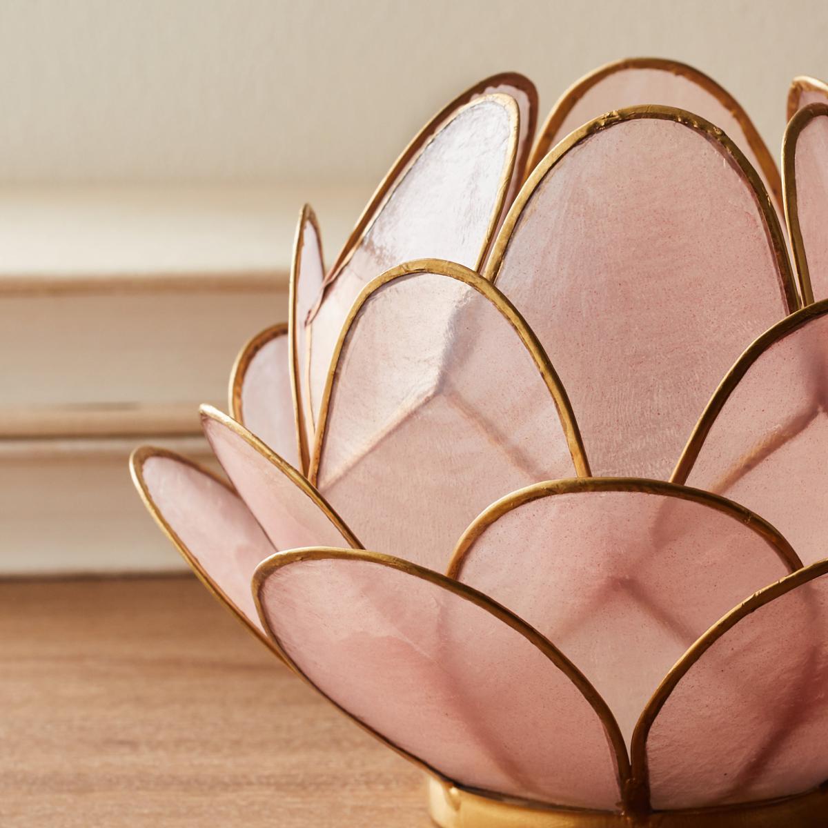 Give your decor a touch of elegance with this exquisite Capiz Pink Tealight Holder. Beautifully made from pearlized Capiz shell, this tealight holder features an elegant flower shaped design with gold painted details, the perfect statement piece for any room.