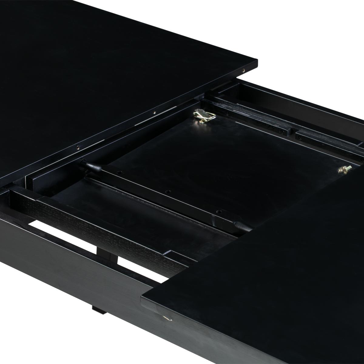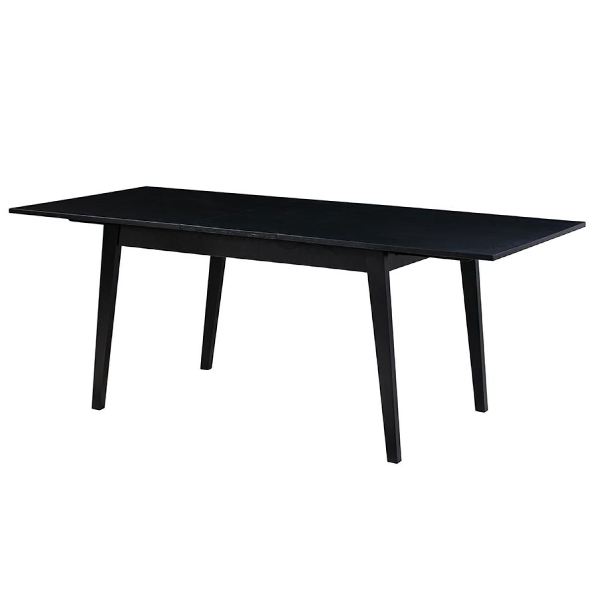 A convenient extending dining table that will seat up to six people. Extension leaf stores neatly inside and folds out when required. Solid ash base. Ash veneer top. Matt black lacquer finish. Comfortable sprung chairs with black stained ash legs and chenille upholstery fabric. Simple assembly of table required.