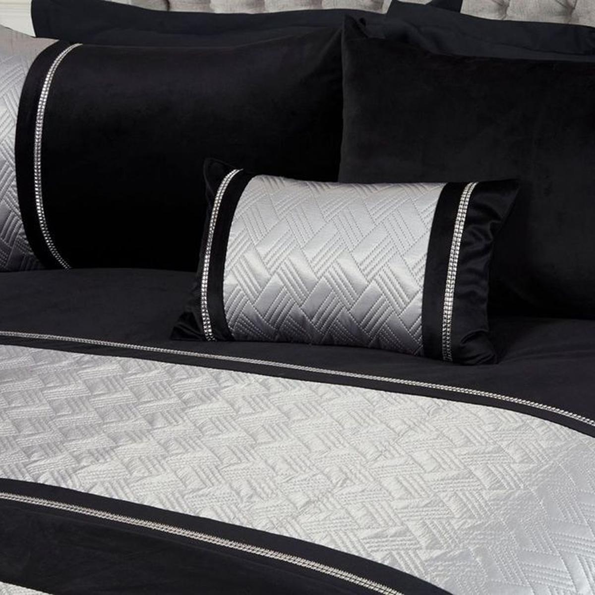 Luxurious boudoir cushion featuring quilted satin panel trimmed with studs on an opulent velvet base. Chic accessory to the matching duvet set and curtains.