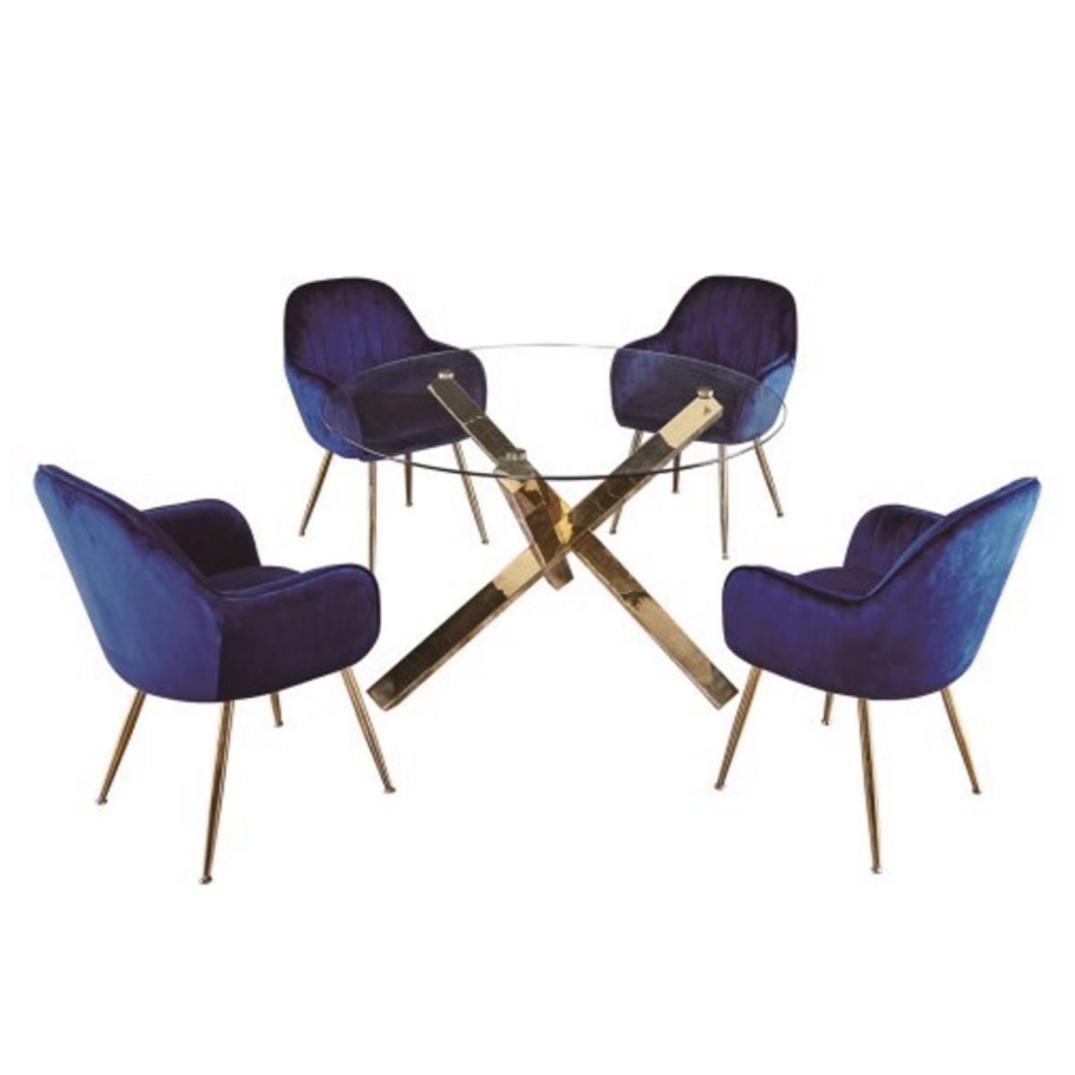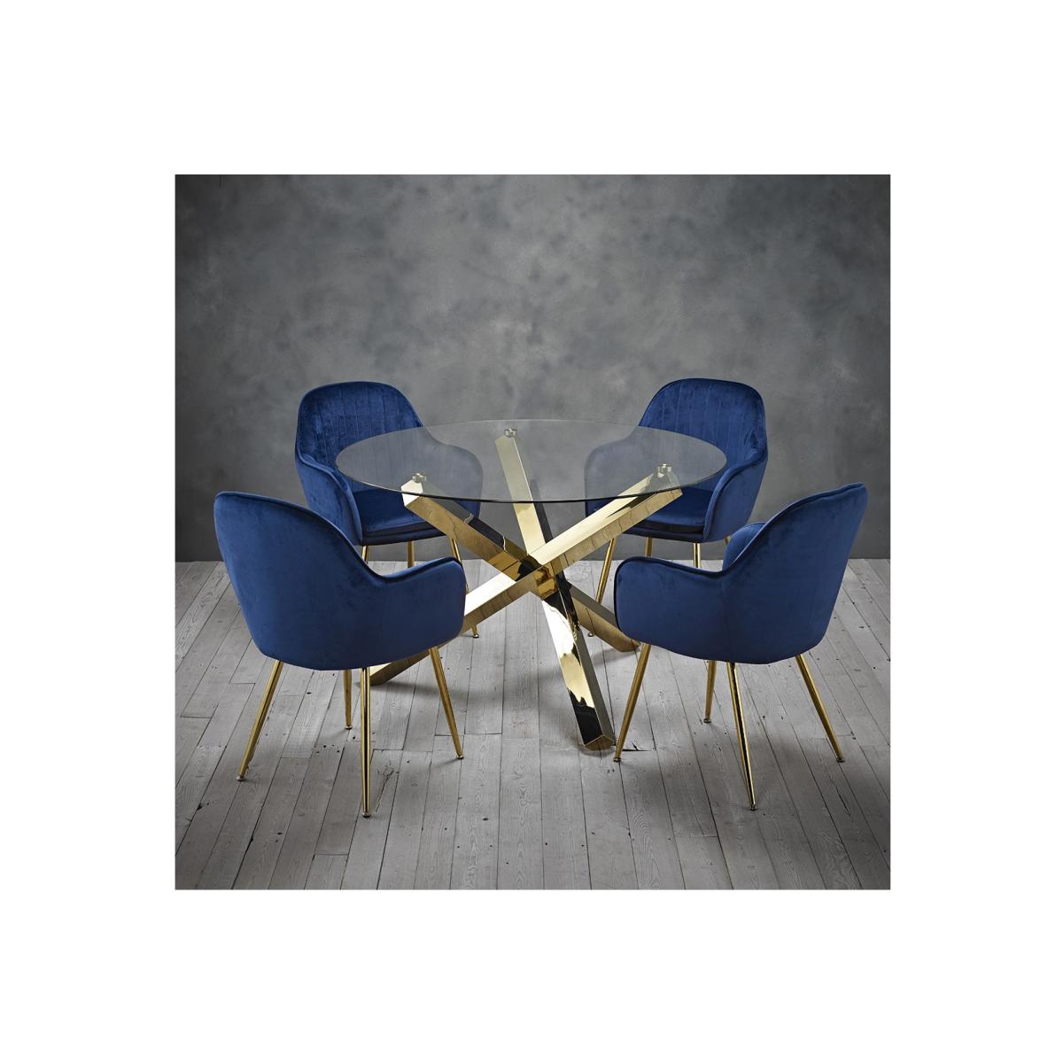 This bundle includes LPD Capri Dinning Table Glass Top with Gold Metal Legs. 2 x LPD Lara Pair of Dining Chairs Royal Blue with Gold Legs. Table Dimensions W120 x H75.8 x D120 cm Chair Dimensions W59 x H84.5 x D57 cm. Add some dazzle to your dining area with our old school glamour Capri dining set. Gleaming gold finish legs with a clear glass table top. This set is sure to make a statement to your dining area. Features. Comes with dining table and 4 dining chairs. Glamourous design. Glass table top. Gold statement legs. Comfortably seats 4 people. Easy self-assembly..