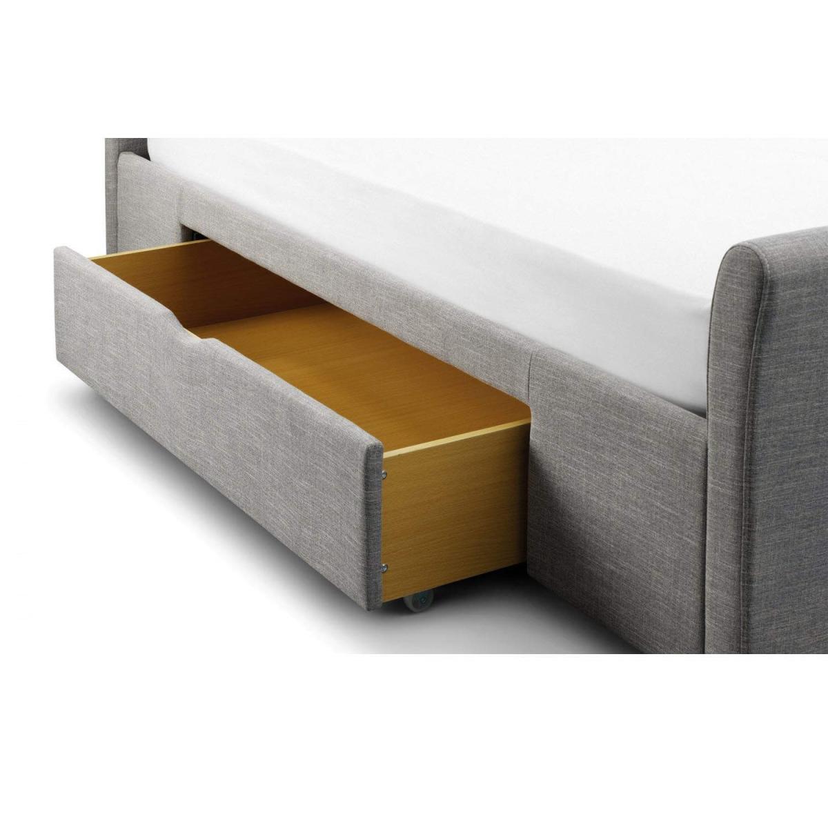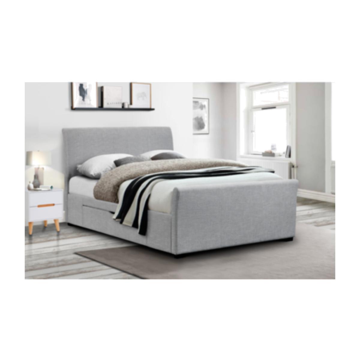 Dimensions. H 110 x W 161 x D 226 cm. Draw Dimensions. H 17.5 x W 115 x D 57 cm Features. Upholstered Kingsize bed frame in grey linen. Includes two pull out large storage drawers one on each side Spring slatted base. Fits a standard UK kingsize mattress Mattress not included..