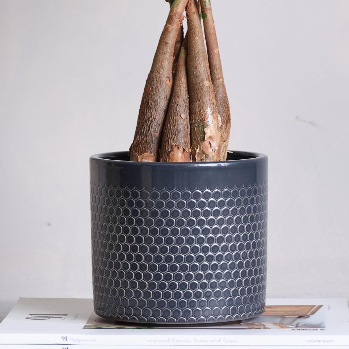 * Geometric pattern * Glazed finish * 100% Ceramic This pot features a striking geometric honeycomb pattern that beautifully complements deep green foliage. Its clean lines and modern silhouette make it a stylish addition to any indoor space, adding a contemporary touch to shelves, side tables, or windowsills. Designed for indoor use only, this pot is perfect for housing your favorite plants, whether it's a vibrant fern, a cascading pothos, or a sculptural succulent.