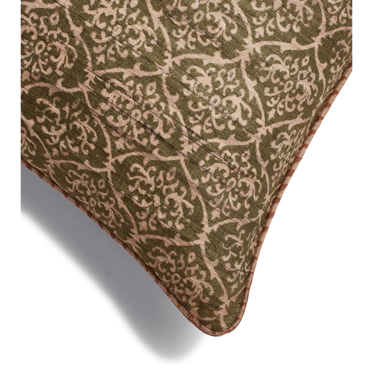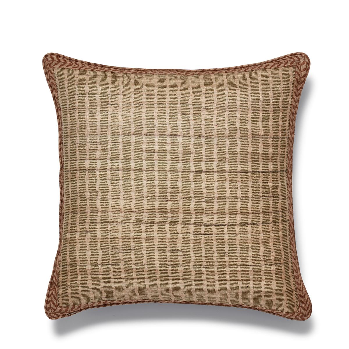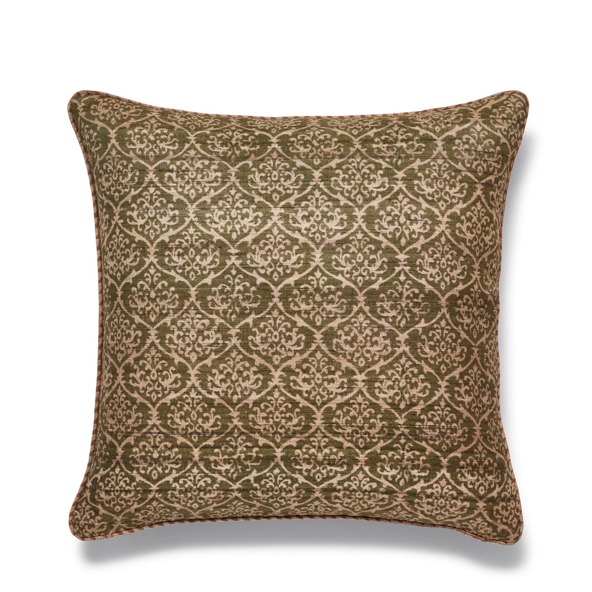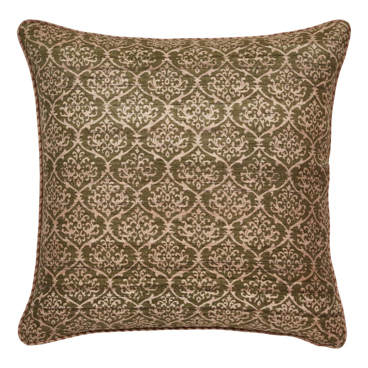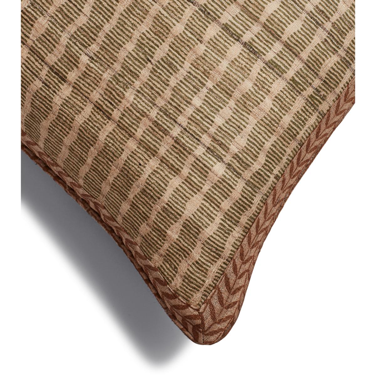 The raw tussar silk used to craft our Caprio Cushion Covers is cultivated from cocoons in the deep forests of Bastar and Assam, India. The yarn spun from this silk is unique, with an irregular thickness that adds to its charm. It is first hand spun and handwoven, then block printed to form the intricate green repeating pattern. Flip the cushion over to enjoy the delicately striped reverse, complete with a leafy border. This surprise pattern on the back offers two looks in one cushion. Due to the artisanal process and natural materials, each cushion will have individual characteristics.