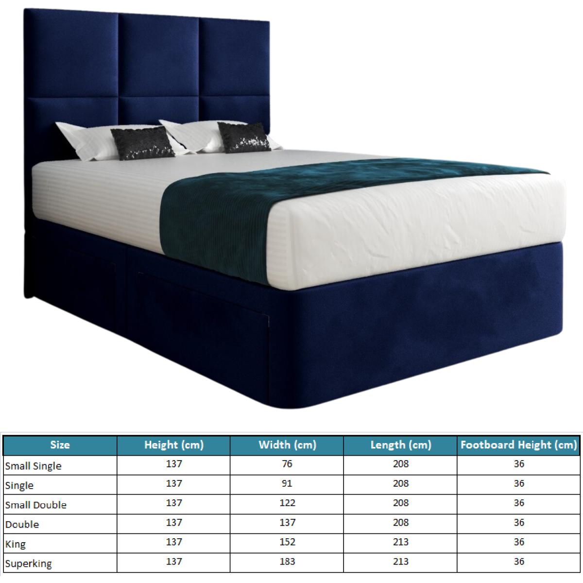 Cube design floorstanding headboard with a classic divan base. Divan base comes equipped with chrome gliders and optional drawer configurations can be chosen for an added storage solution. The floorstanding headboard is solid and easy to affix to the base. Aesthetically clean and sleek with a contemporary cube panel design.